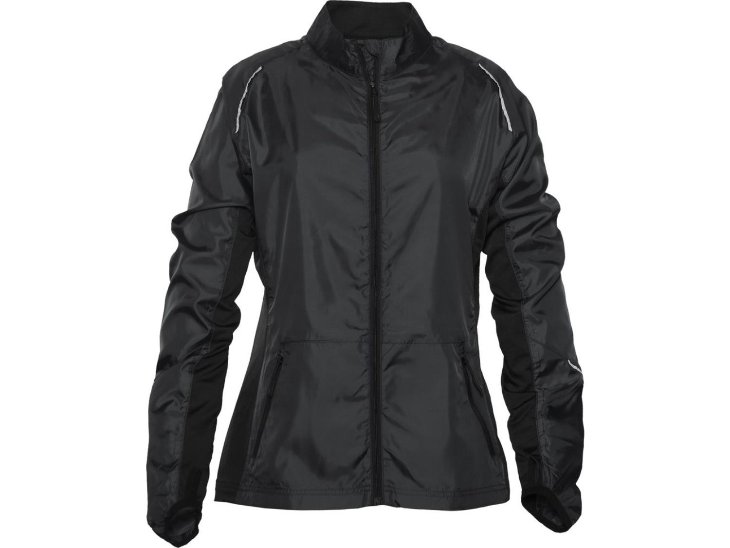 Style 989, 92% breathable polyester, 8% spandex, water & wind resistant, low moisture absorption, quick dry material, runners thumbs holes, side pockets, reflective piping on front, back and sleeves, vented back with Velcro embroidery access