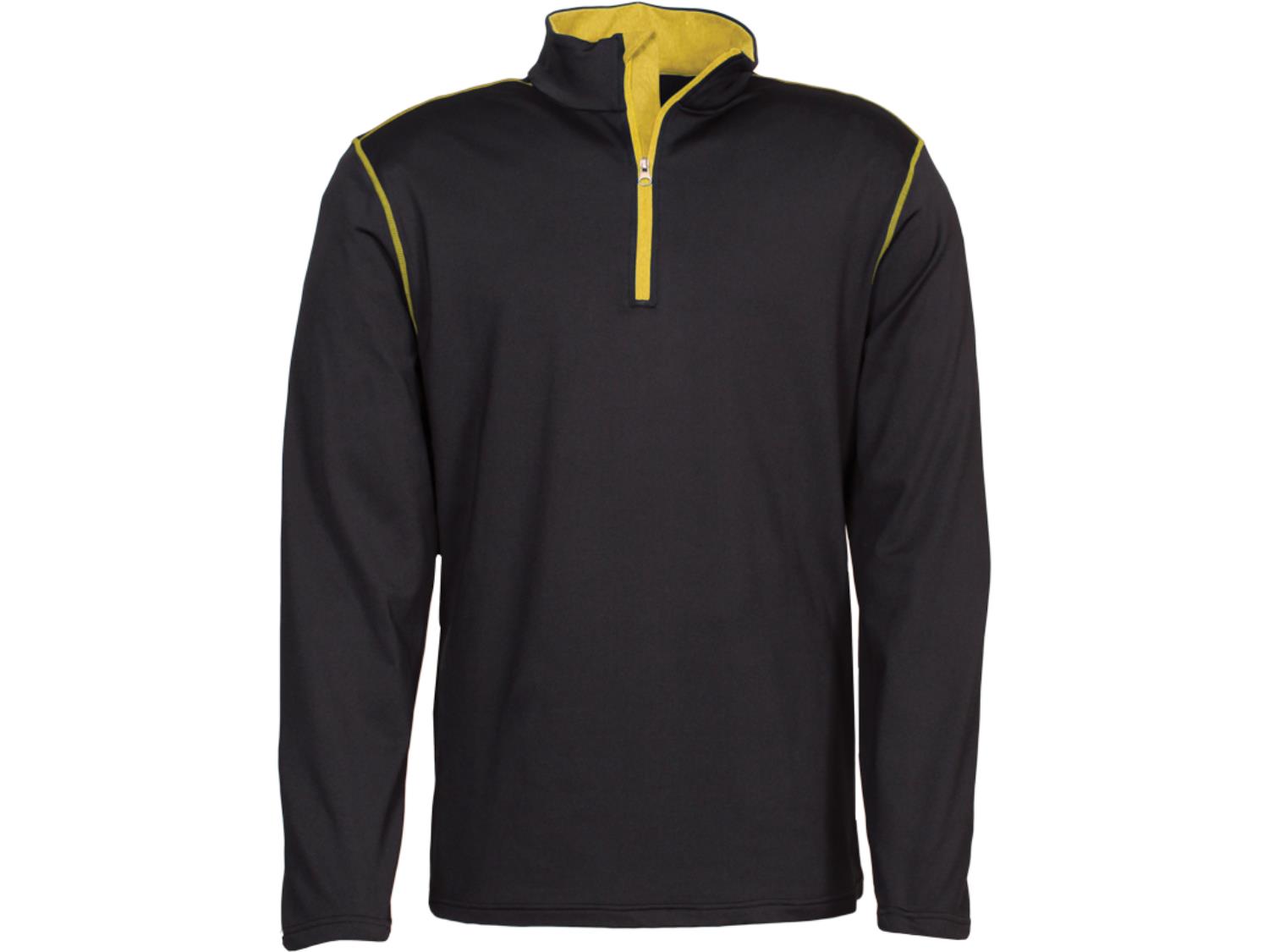 Style 810, 90% polyester, 10% spandex, breathable and moisture wicking, contrast stitching, 1/4 zipper, chin guard on main zipper, self-cuff and collar