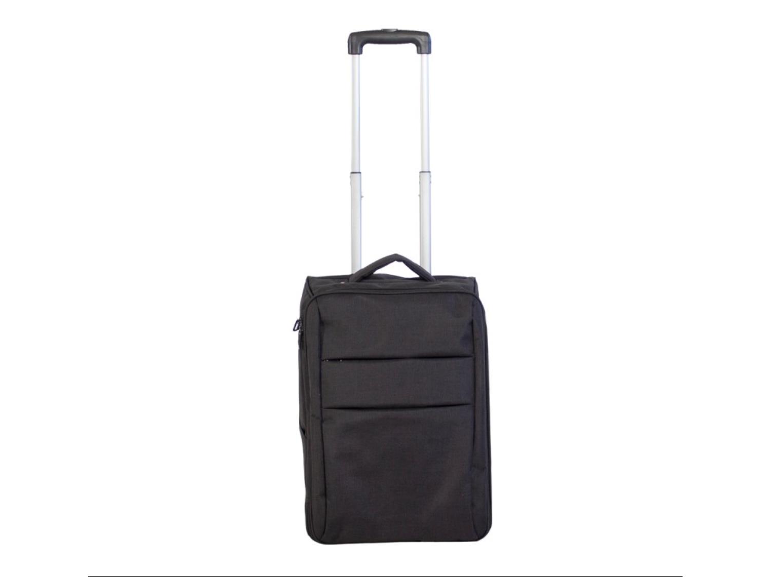 600 x 600D polyester, collapsible frame for easy storage, exterior zippered, pockets for easy-access items, inside side zipper pocket on ap, inside small zipper pocket on side of bag, dual garment straps, angled pocket on Left side – no zipper, side webbing Loops for accessory attachment, clear in-line wheels, size 19.5” x 13.5” x 9.5” (Carry on)