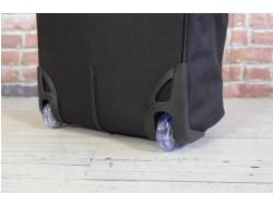 600 x 600D polyester, collapsible frame for easy storage, exterior zippered, pockets for easy-access items, inside side zipper pocket on ap, inside small zipper pocket on side of bag, dual garment straps, angled pocket on Left side – no zipper, side webbing Loops for accessory attachment, clear in-line wheels, size 19.5” x 13.5” x 9.5” (Carry on)