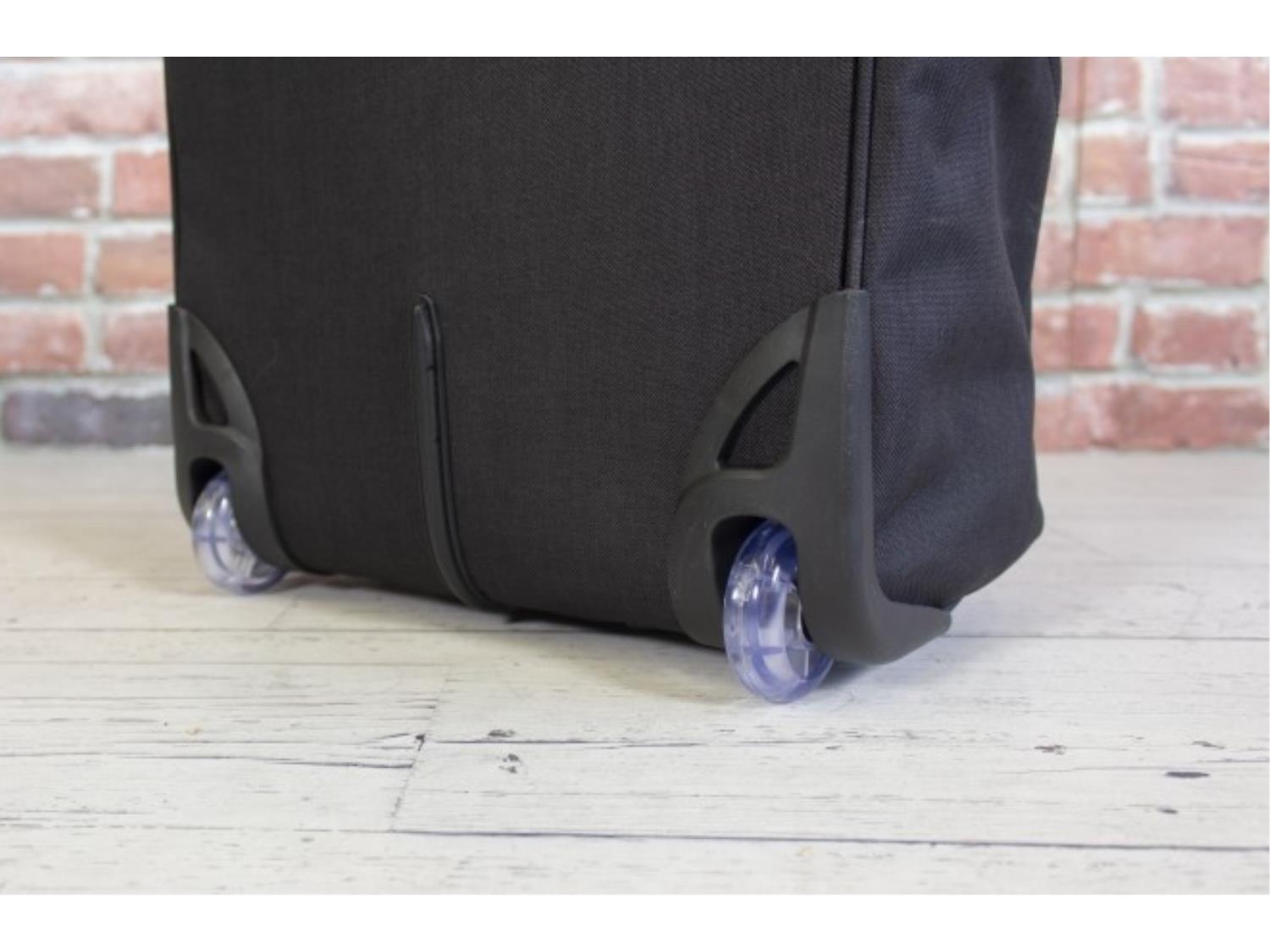 600 x 600D polyester, collapsible frame for easy storage, exterior zippered, pockets for easy-access items, inside side zipper pocket on ap, inside small zipper pocket on side of bag, dual garment straps, angled pocket on Left side – no zipper, side webbing Loops for accessory attachment, clear in-line wheels, size 19.5” x 13.5” x 9.5” (Carry on)