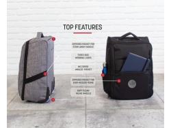 600 x 600D polyester, collapsible frame for easy storage, exterior zippered, pockets for easy-access items, inside side zipper pocket on ap, inside small zipper pocket on side of bag, dual garment straps, angled pocket on Left side – no zipper, side webbing Loops for accessory attachment, clear in-line wheels, size 19.5” x 13.5” x 9.5” (Carry on)