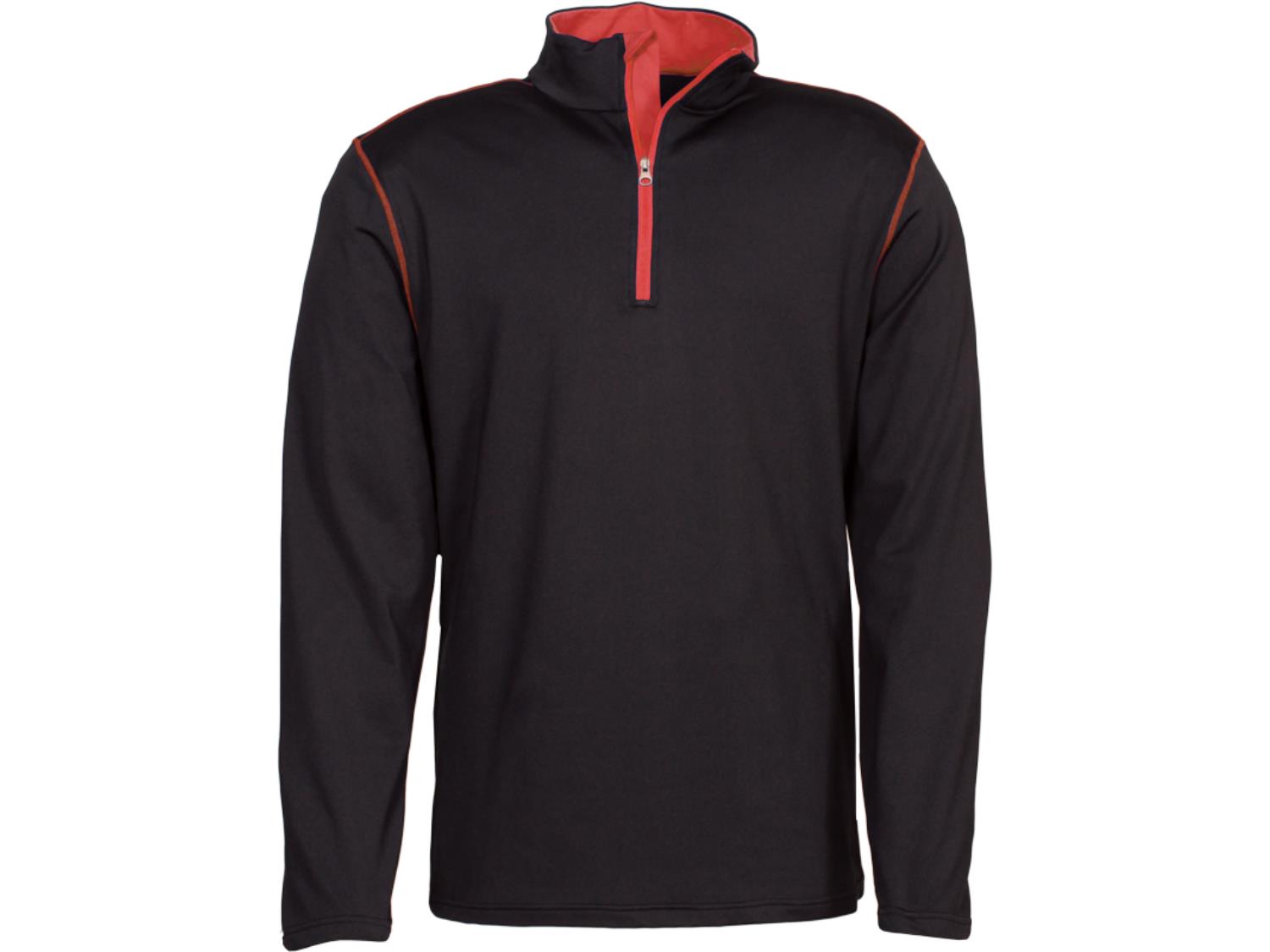 Style 810, 90% polyester, 10% spandex, breathable and moisture wicking, contrast stitching, 1/4 zipper, chin guard on main zipper, self-cuff and collar