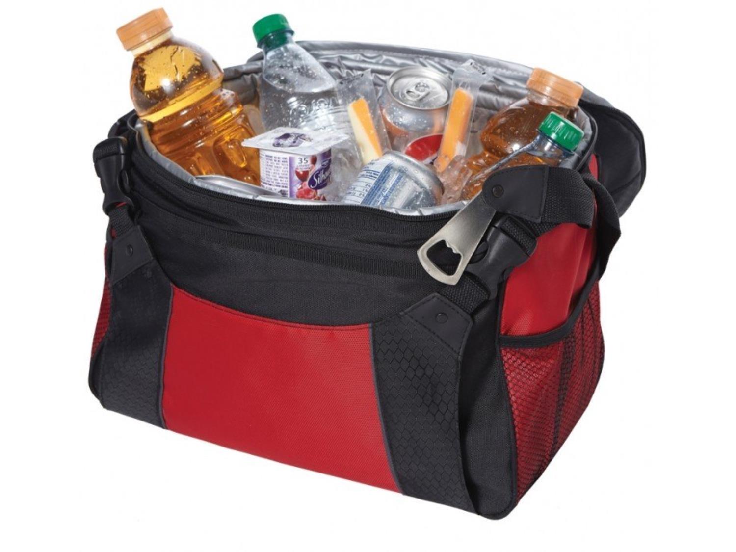 Padded adjustable shoulder strap, (2) side mesh pockets, top zipper, front panel with buckles, leak resistant liner, holds 20 cans, metal bottle opener (4 boxes of 20)