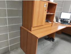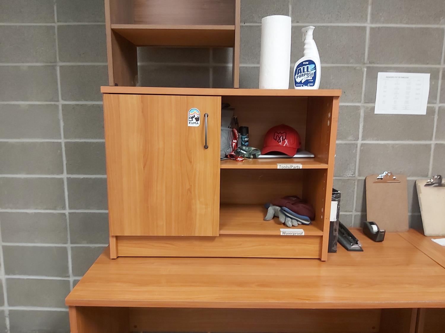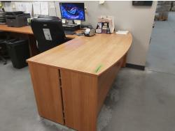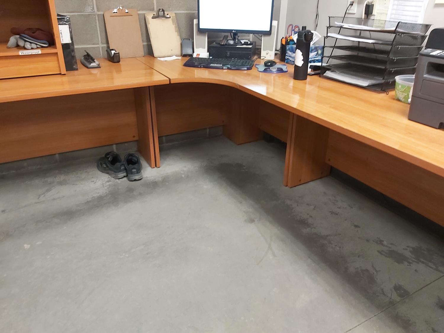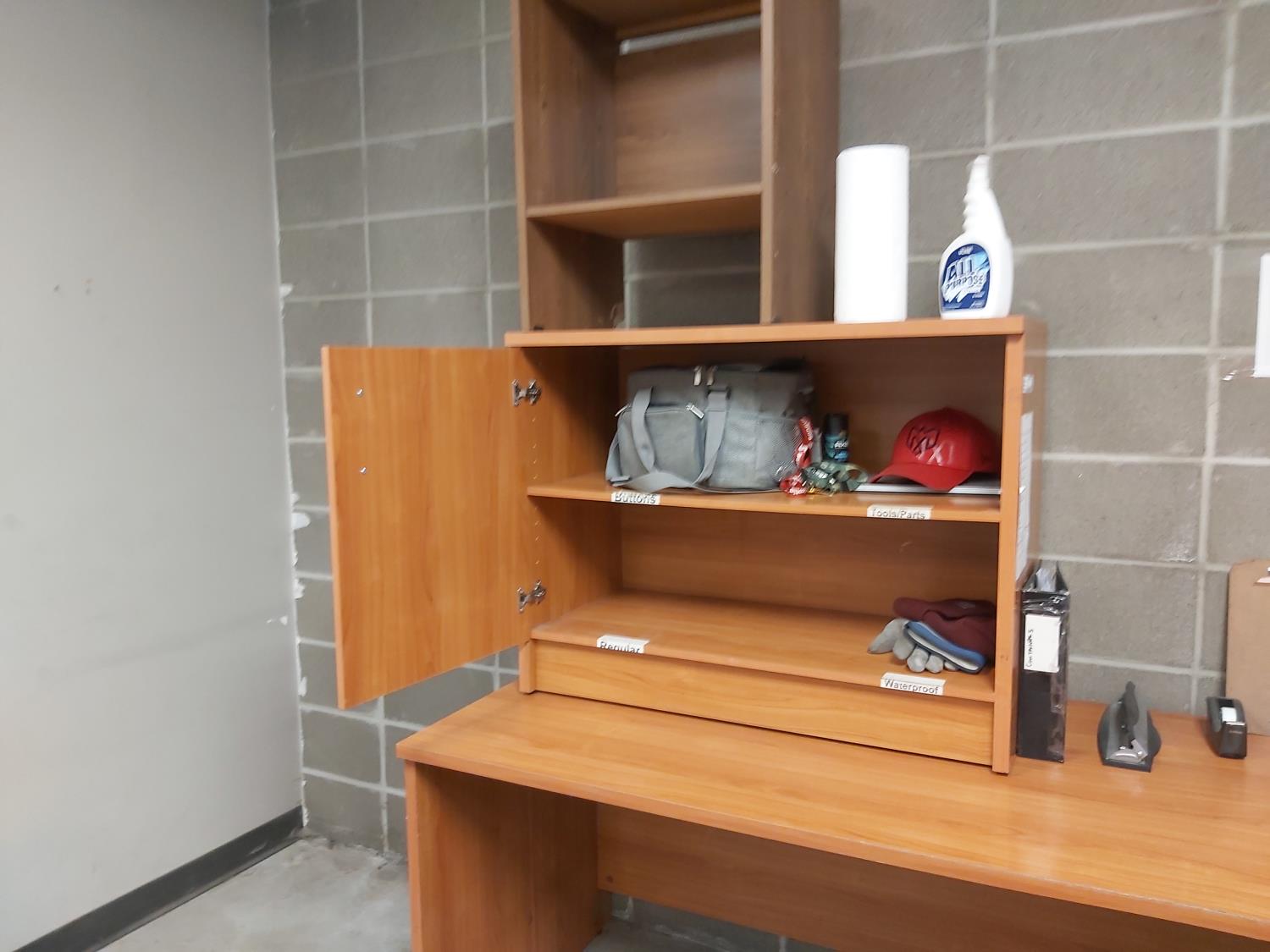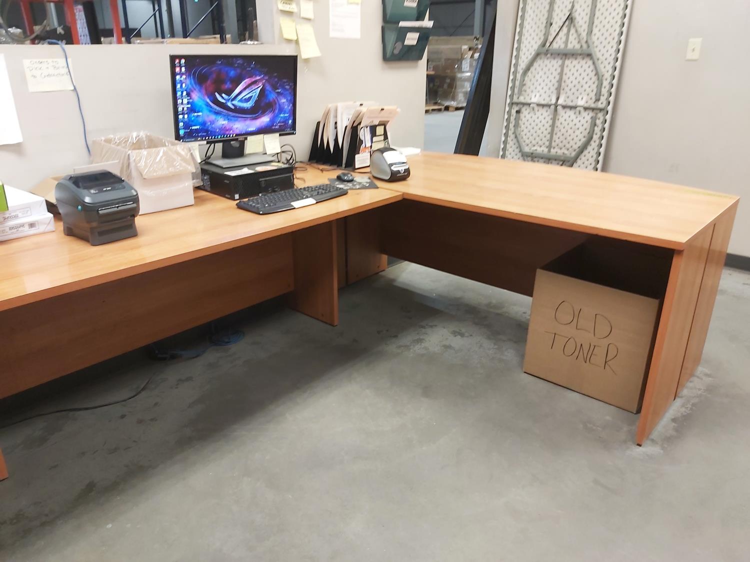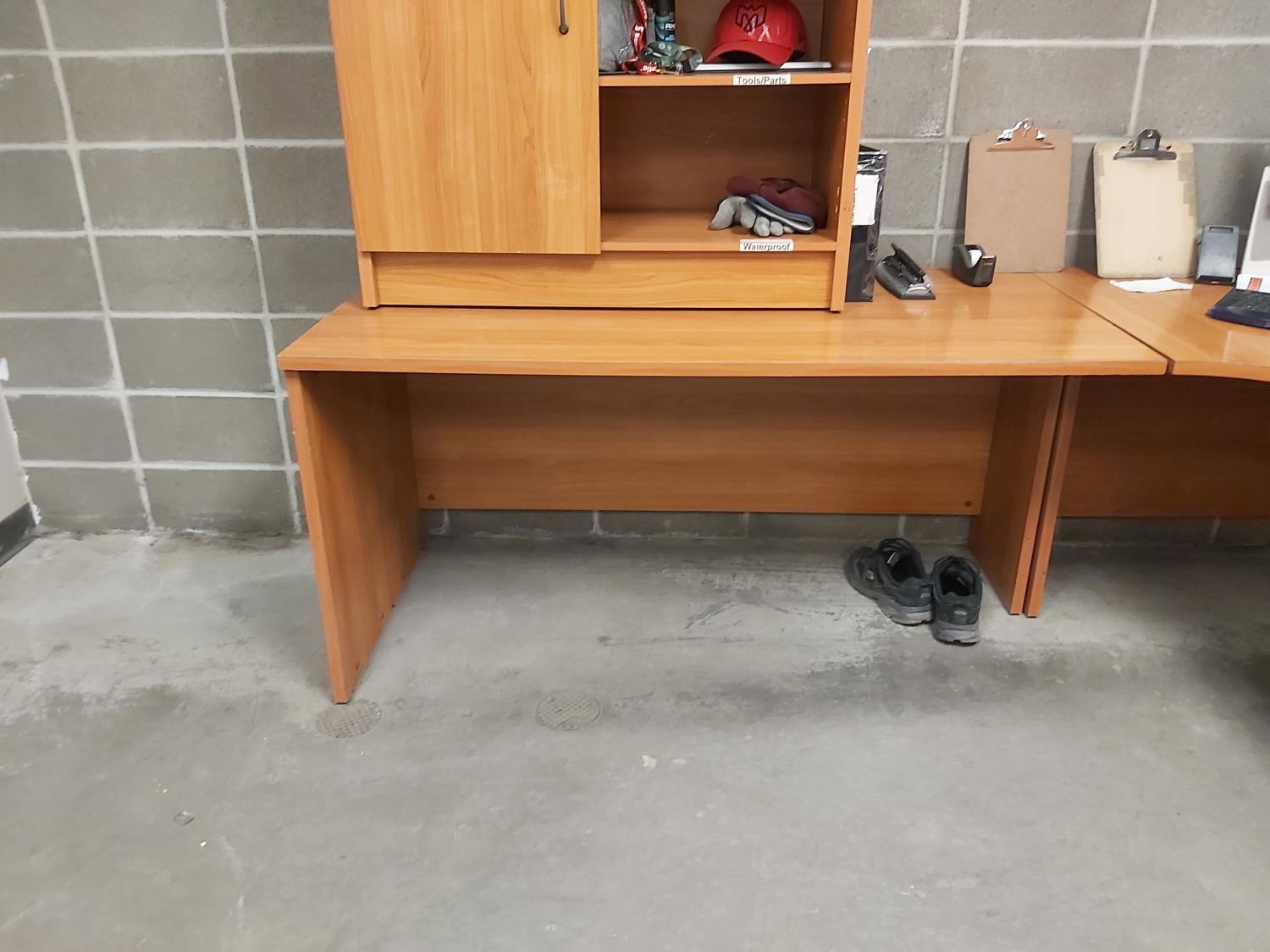 (1) desk 71 inch X 94 inch, (1) desk 88 inch X 99.5 inch, (2) shelf cabinets 37.5 inch wide X 8 inch deep X29 inch high, (1) shelf unit 20.5 inch X 16 inch deep X 27 inch high, NOTE computers, office supplies & miscellaneous items are not included