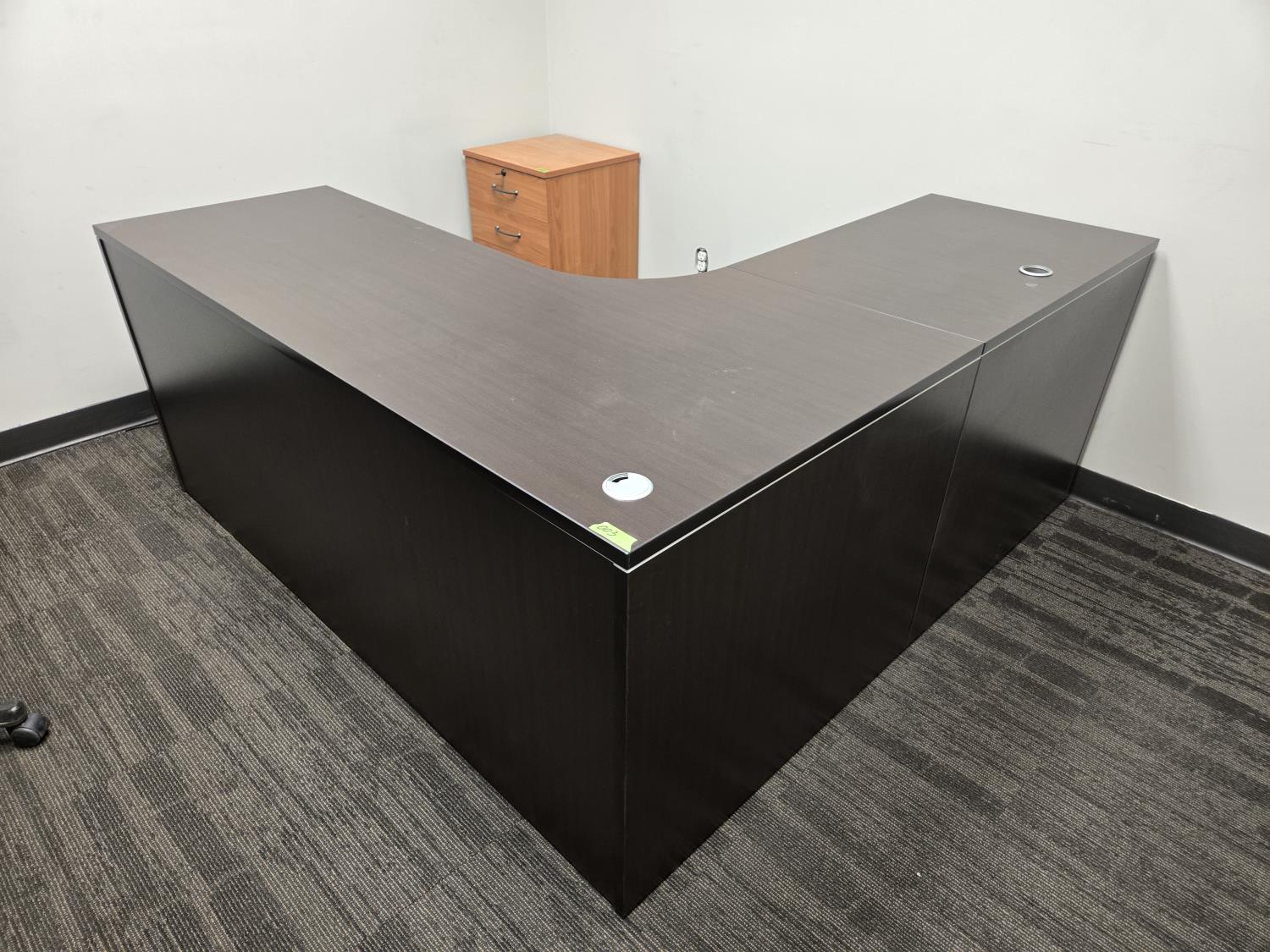 Corner desk 71 inch X 71 inch X 29.5 inch high, shelf unit 11 inch deep X 31.5 inch wide X 79 inch high, 3 drawer unit, 18 inch deep X 36 inch wide X 27 inch high, swivel office chair