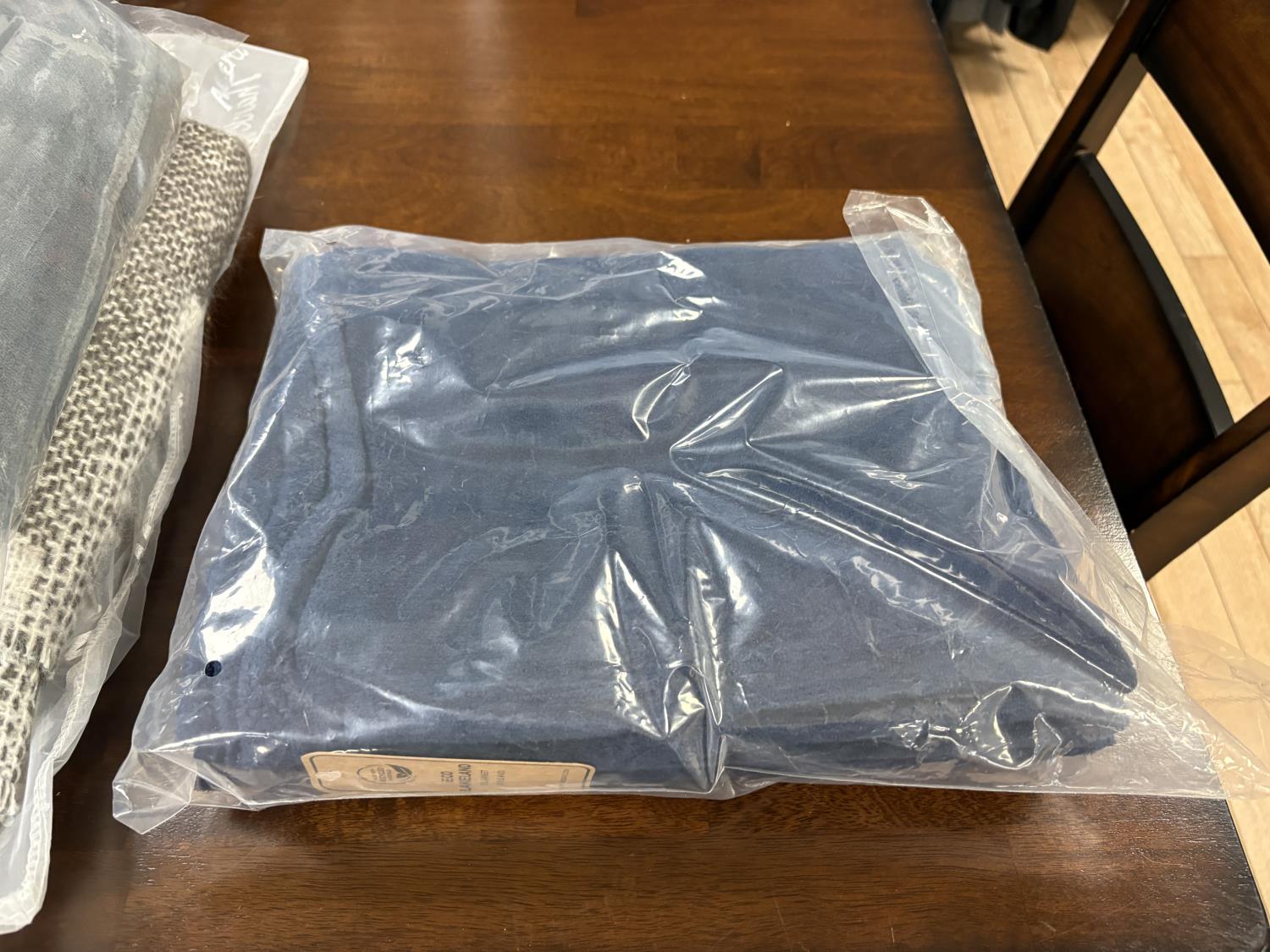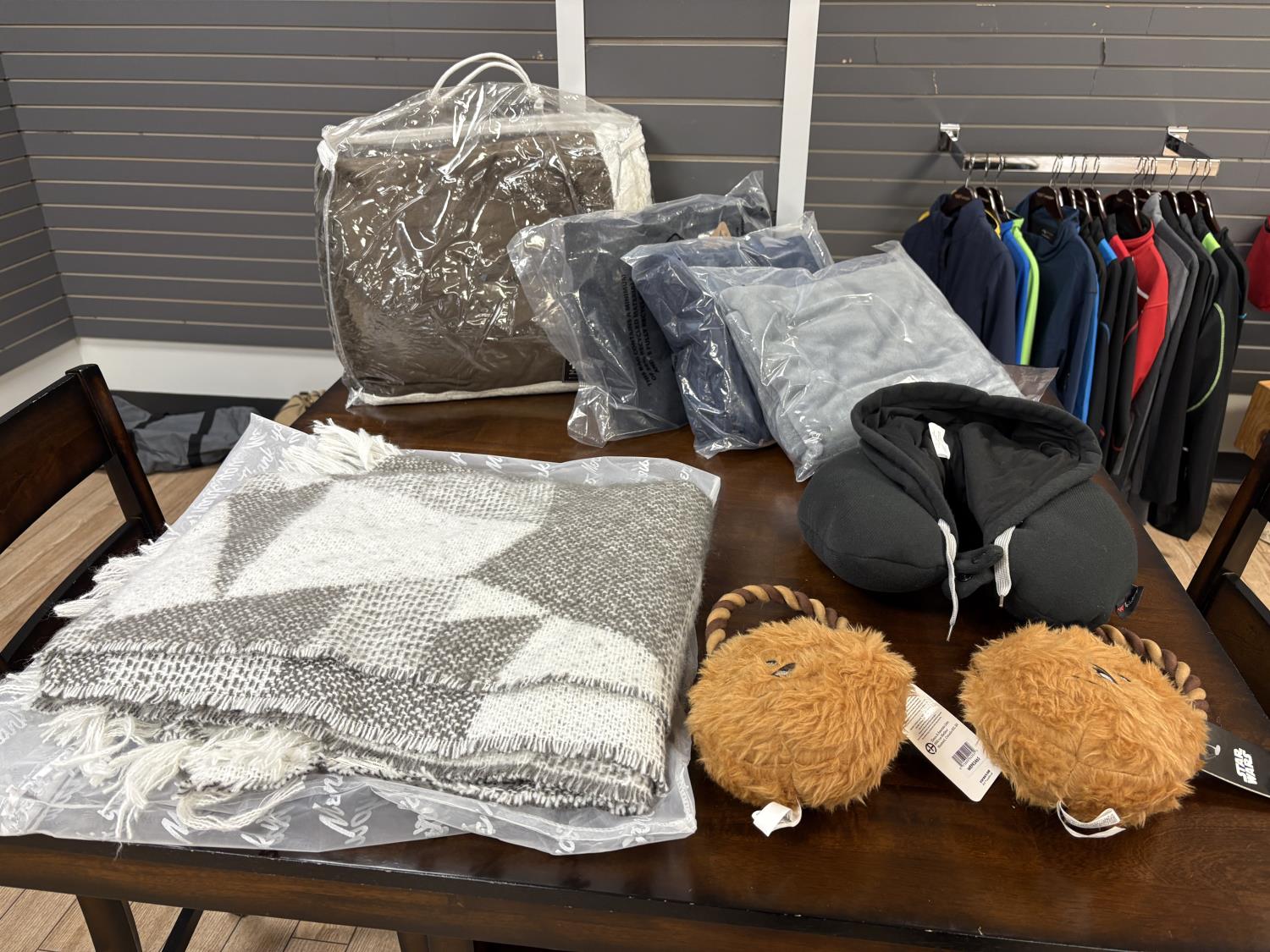 showroom items, grey/white blanket 50 inch x 70 inch, brown blanket 60 inch x 70 inch, navy blanket 43 inch x 55 inch, grey blanket 43 inch x 55 inch, black blanket 43 inch x 55 inch, neck pillow with hood, (2) star wars dog toys
