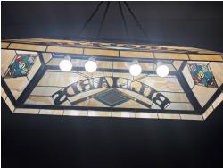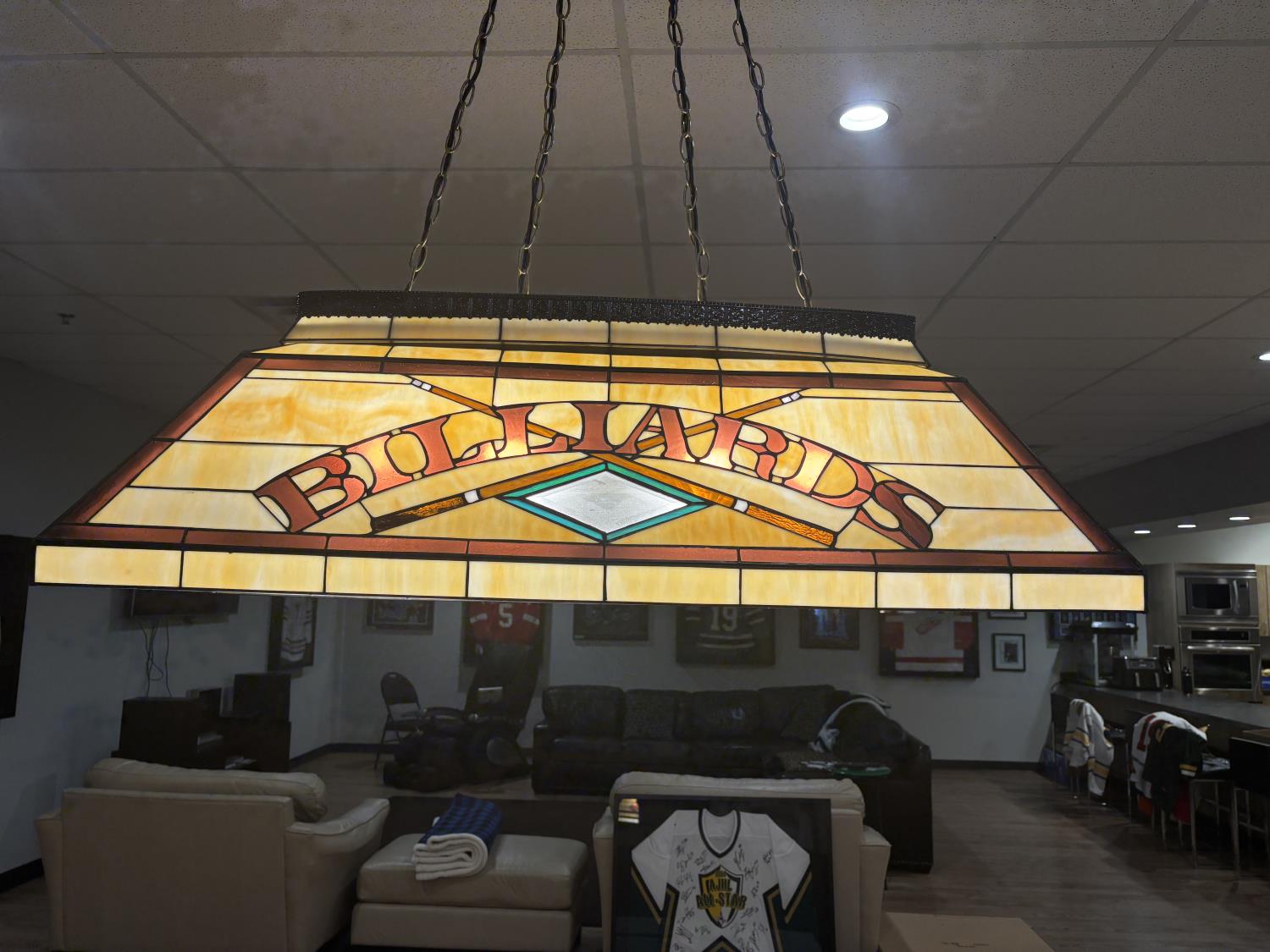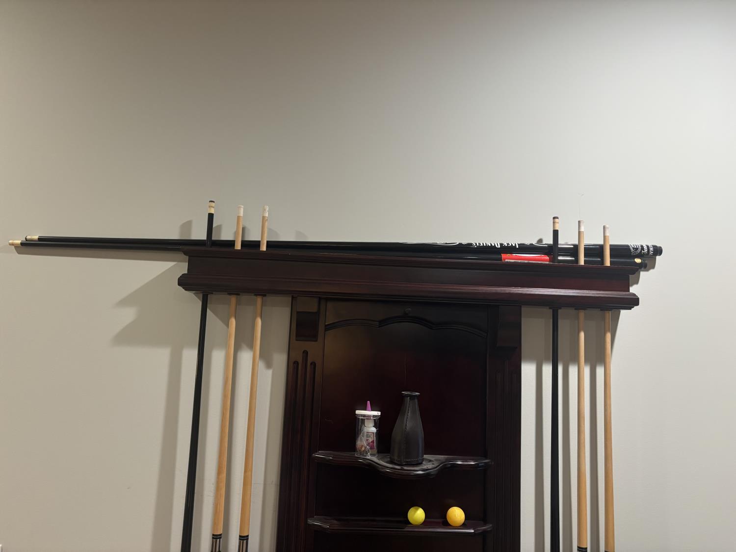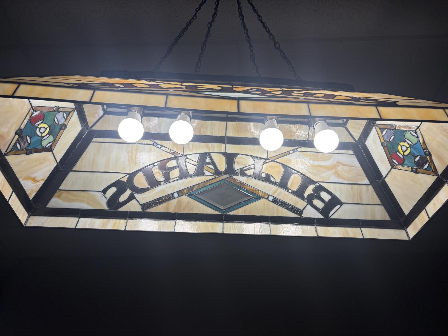 8 pool cues, full set of pool balls, 2 used chalk, triangle, mechanical bridge stick, cue repair kit, Kelly pool game, table brush, full pool hanging cabinet, stained glass "billiards" 4 bulb hanging fixture
