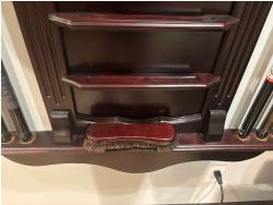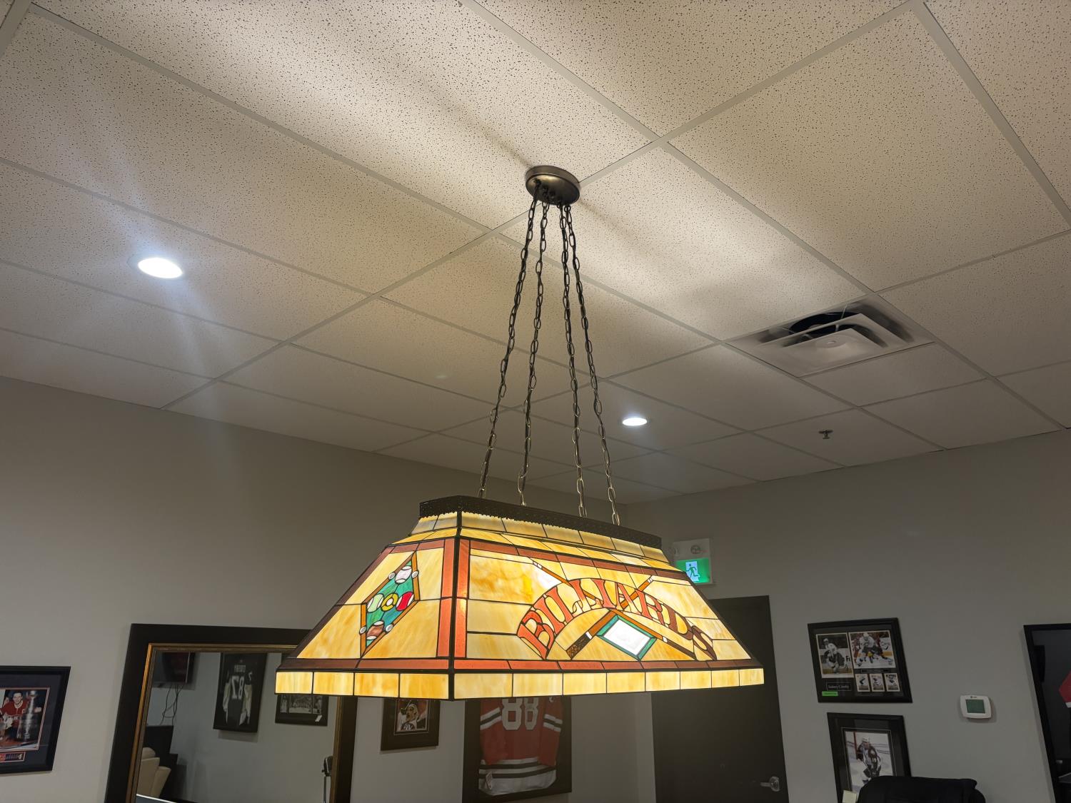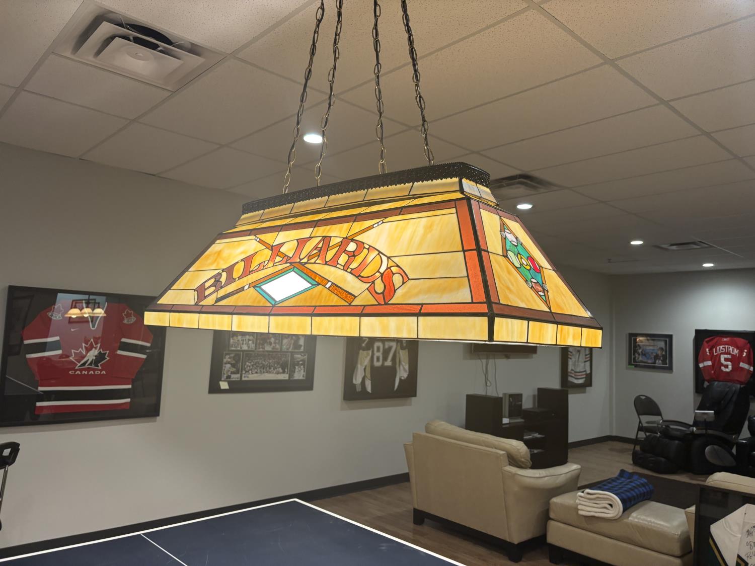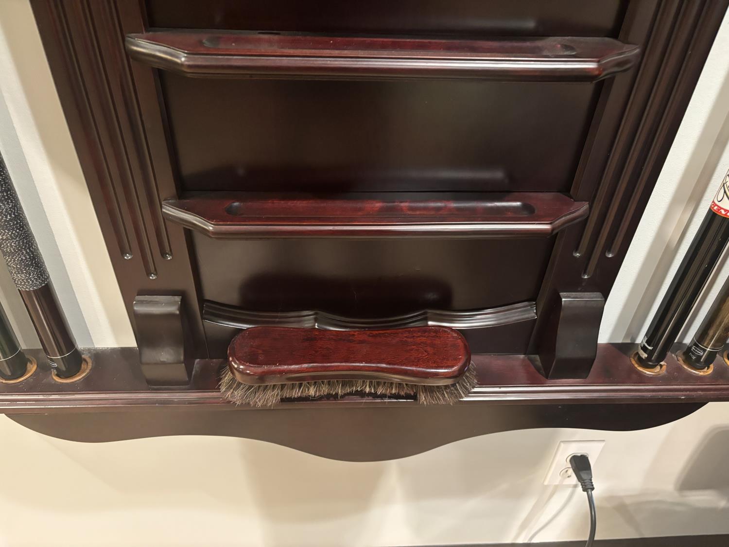 8 pool cues, full set of pool balls, 2 used chalk, triangle, mechanical bridge stick, cue repair kit, Kelly pool game, table brush, full pool hanging cabinet, stained glass "billiards" 4 bulb hanging fixture