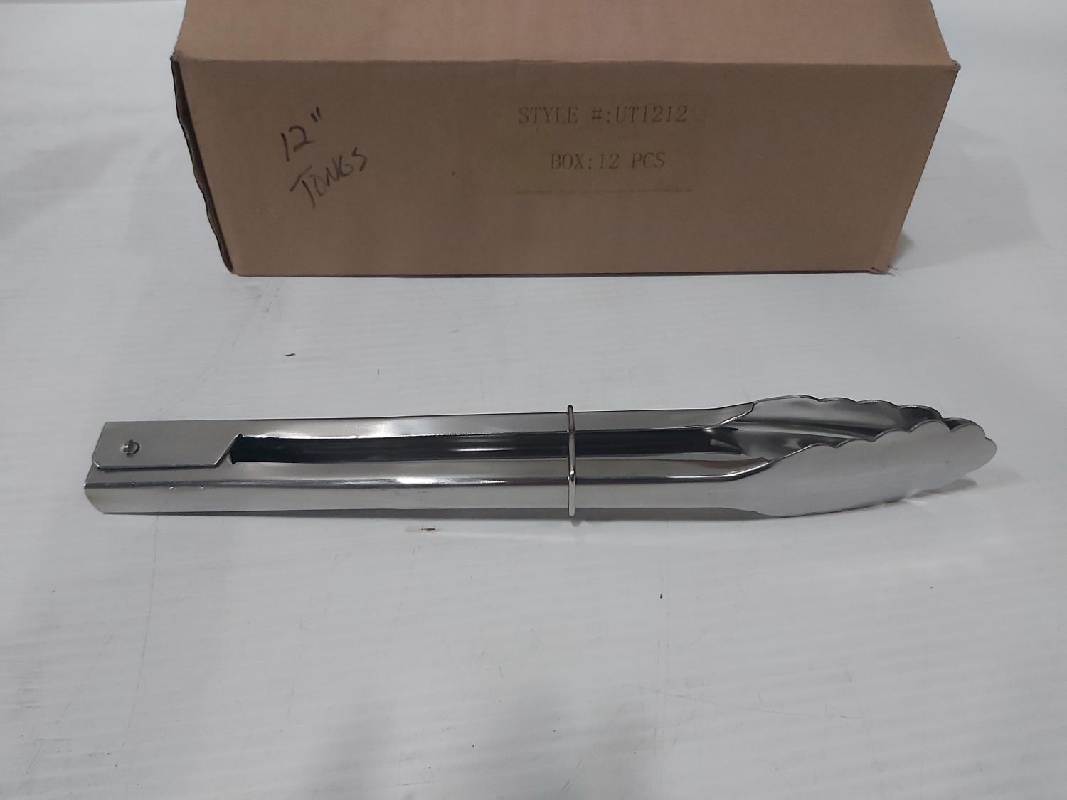 Stainless steel whisk, meat tenderizer, (12) 12 inch stainless steel tongs, (48) 12" stainless steel slotted serving spoons