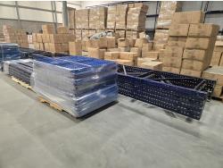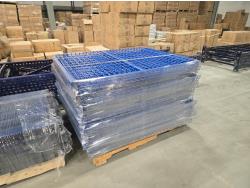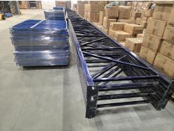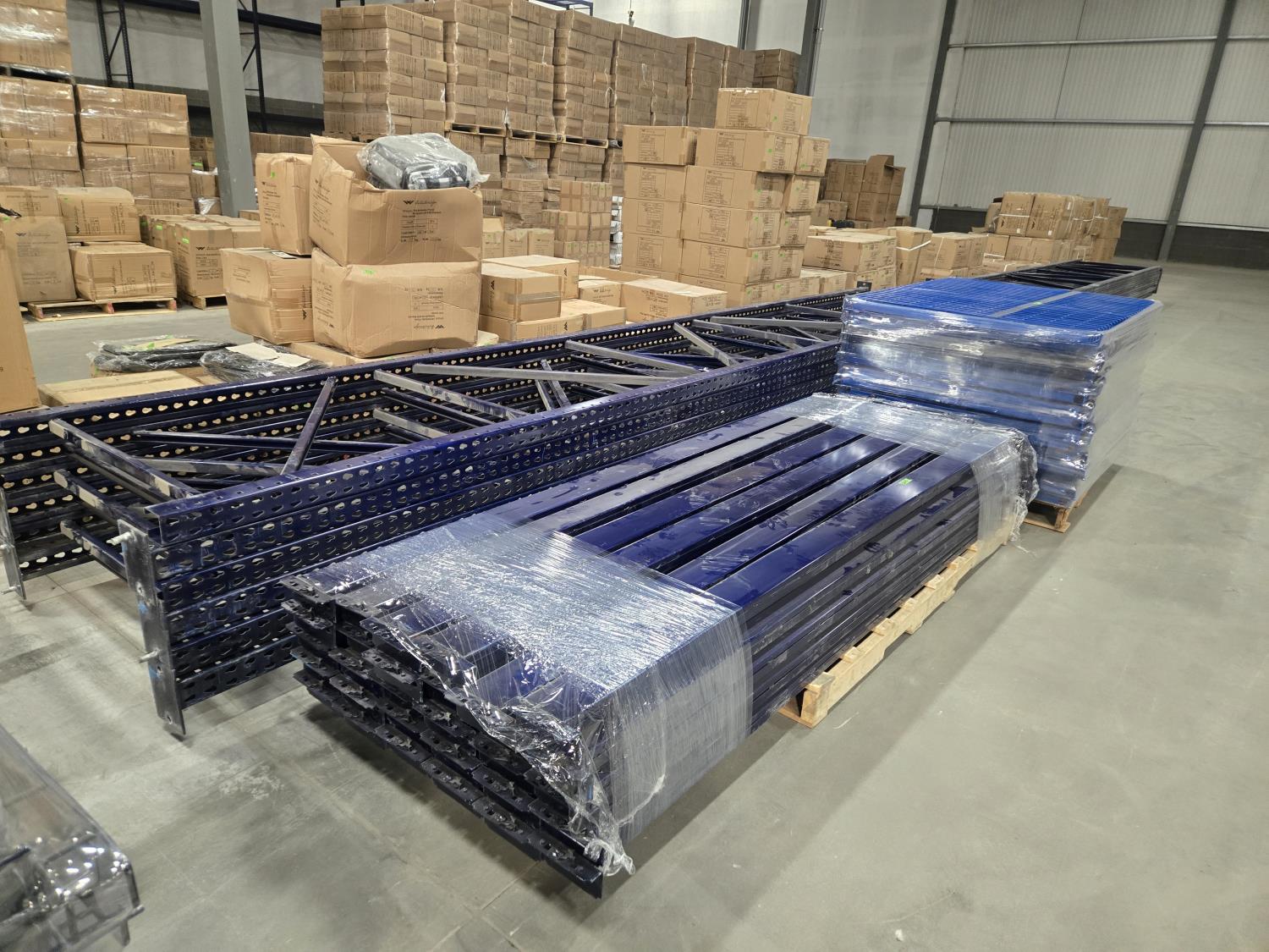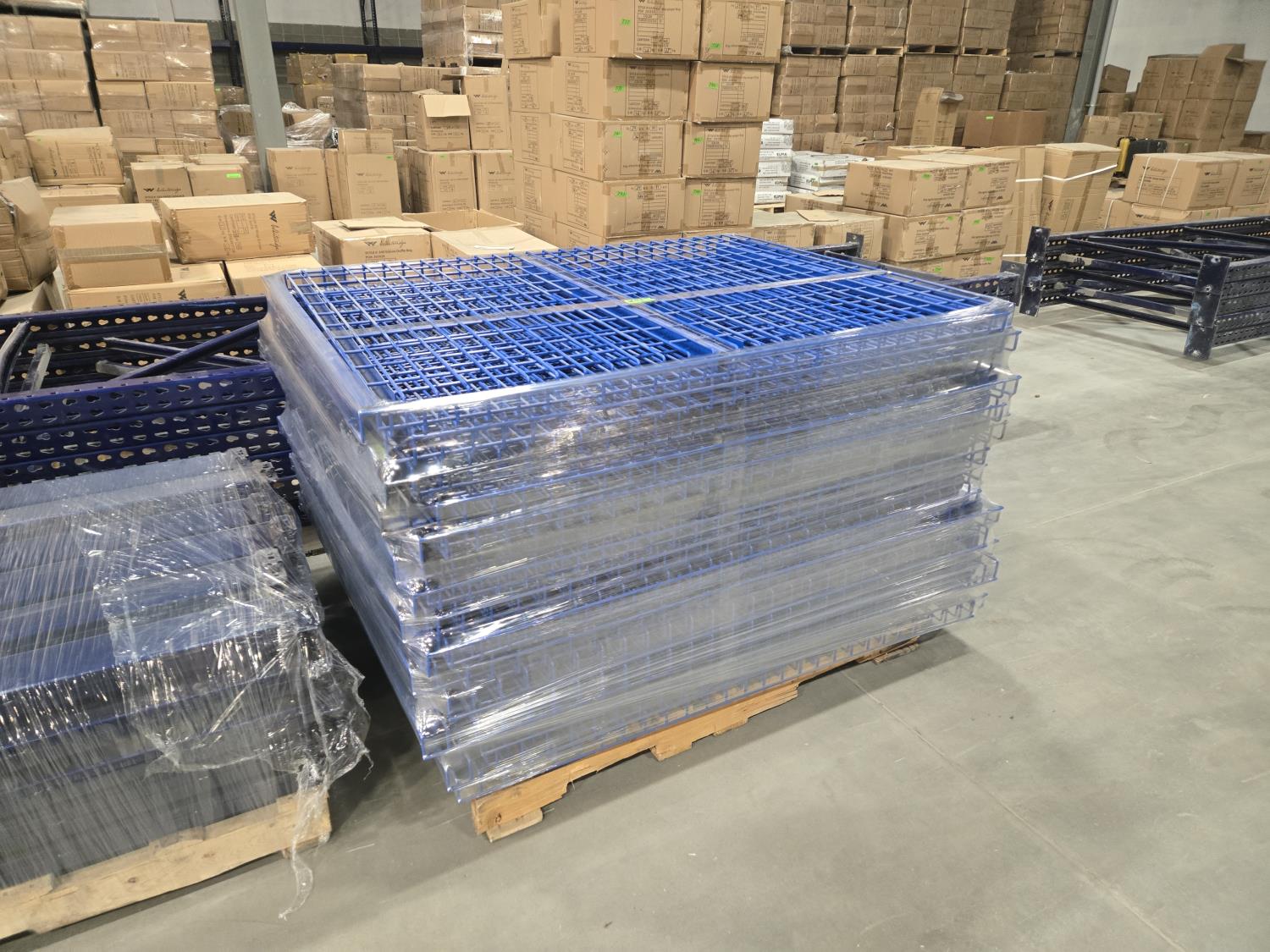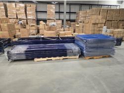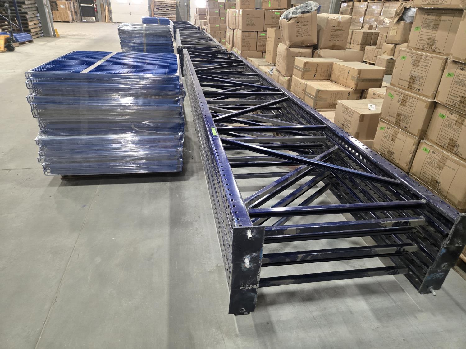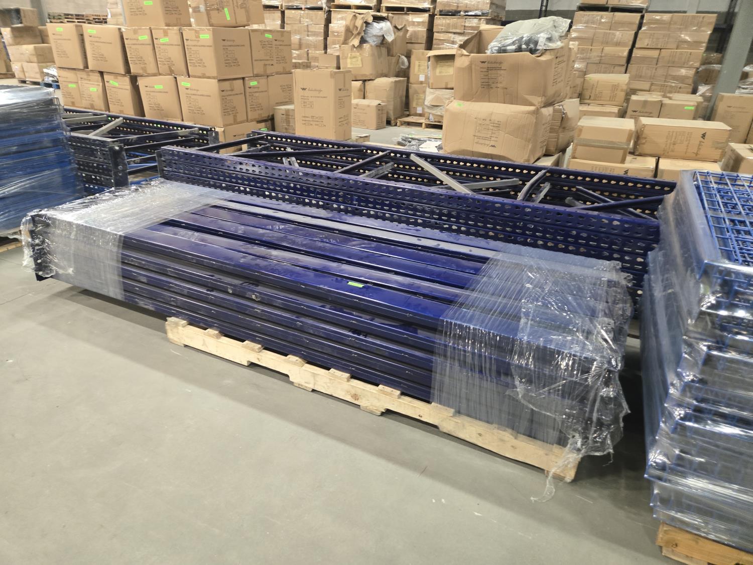 (6) end frames 42 inch X 20 ft high, (30) 9 Ft shelf beams 4-5/8 inch deep, (30) wire mesh shelves, makes a pallwt rack 42 inch wide X 20 ft high X 46 ft long with 3 shelves