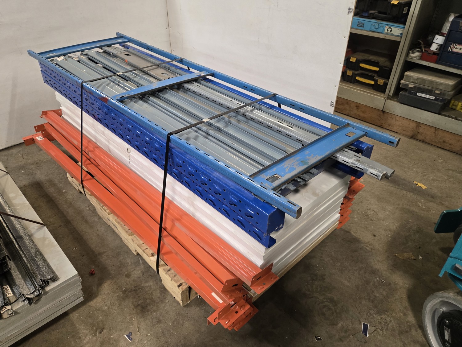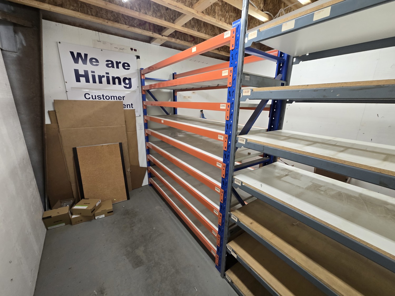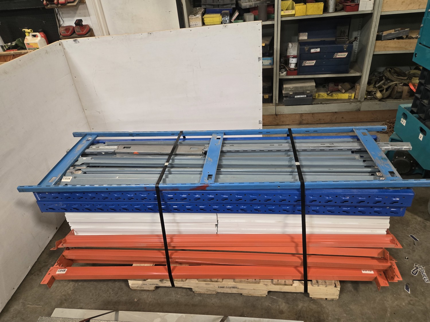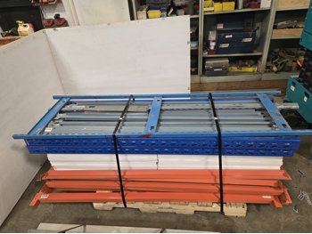 Orange & Blue section: 78 inch long X 24 inch deep X 79 inch high with 9 metal shelfs with shelf beams, Grey section: 72 inch long X 24 inch deep X 84 inch high with (7) wood shelfs with shelf beams
