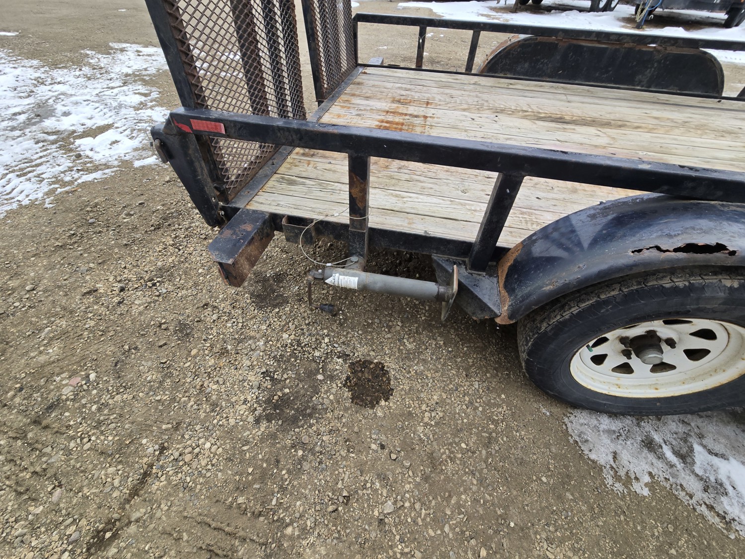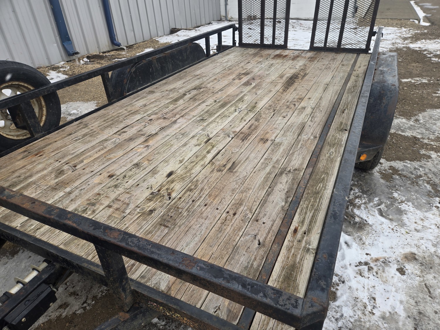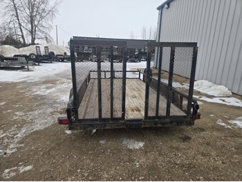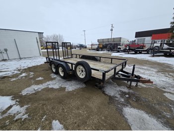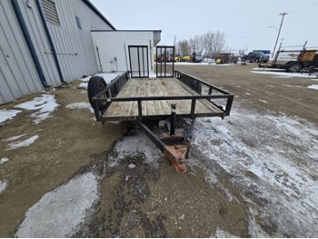 82 inch wide deck, wood deck, stand up ramps, electric brakes, spring suspension, 2-5/16 inch ball hitch, stake pockets, deck railing, 3500 lb axles, 205/75R15 tires