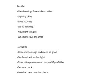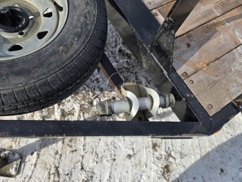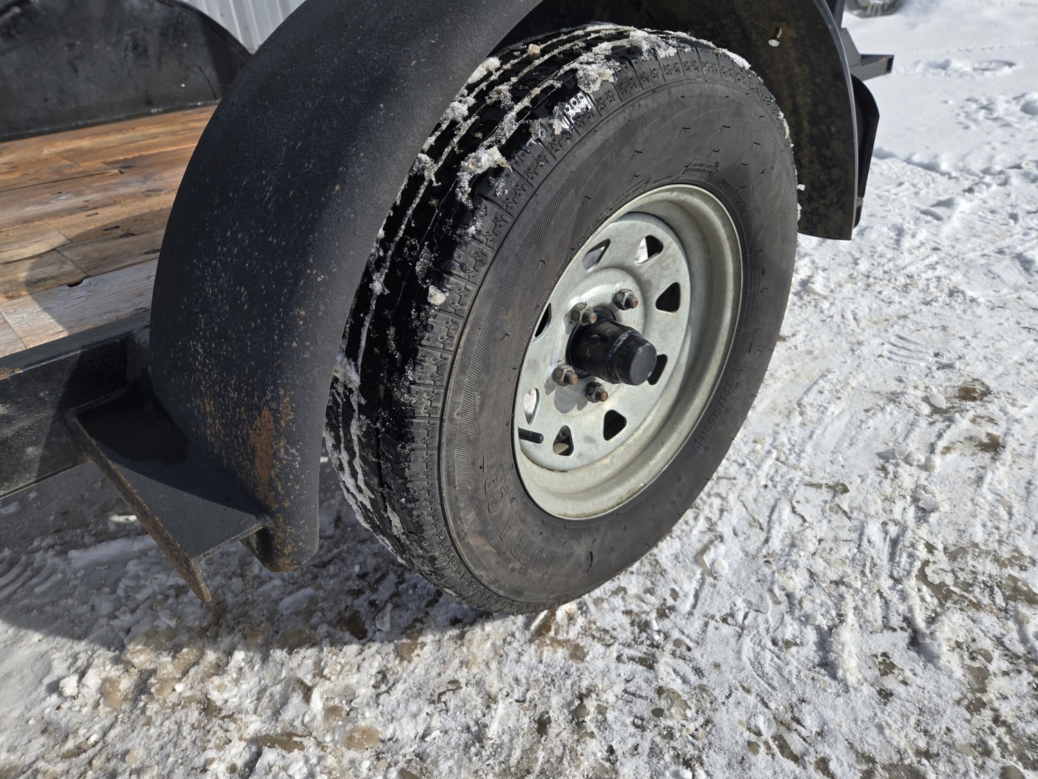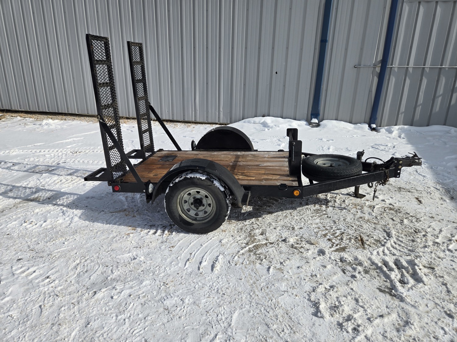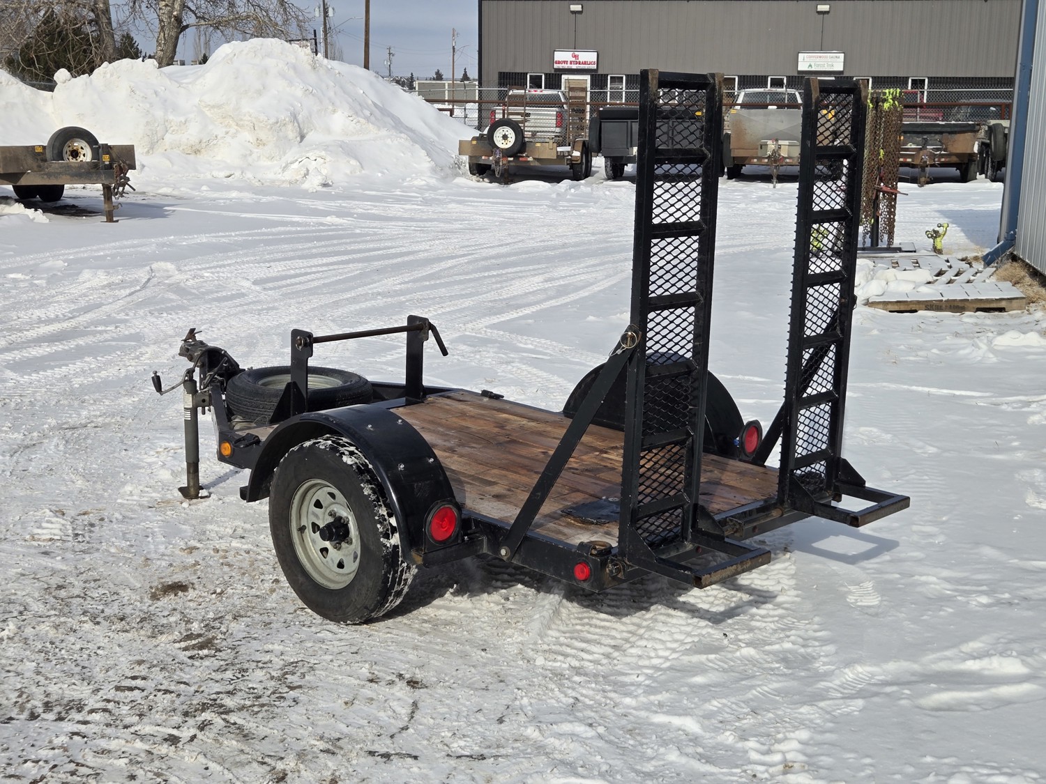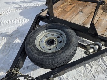 54 inch wide deck, wood deck, stand up ramps, torsion suspension, 2 inch ball hitch, spare, nice well built trailer, 175/80R13 tires