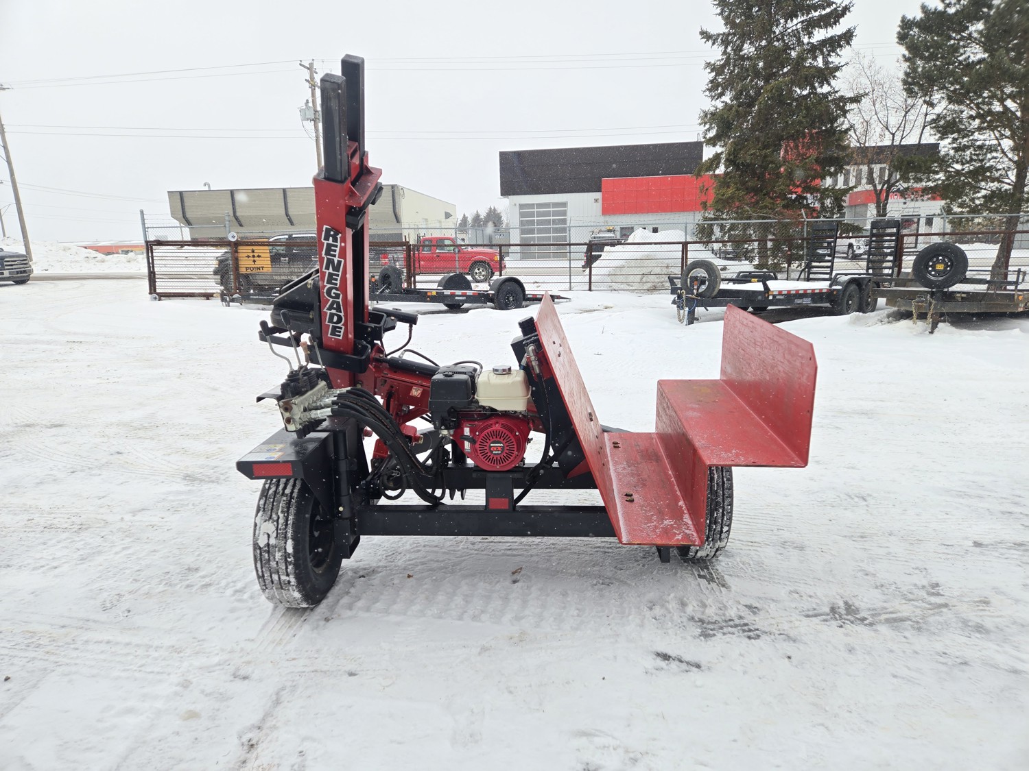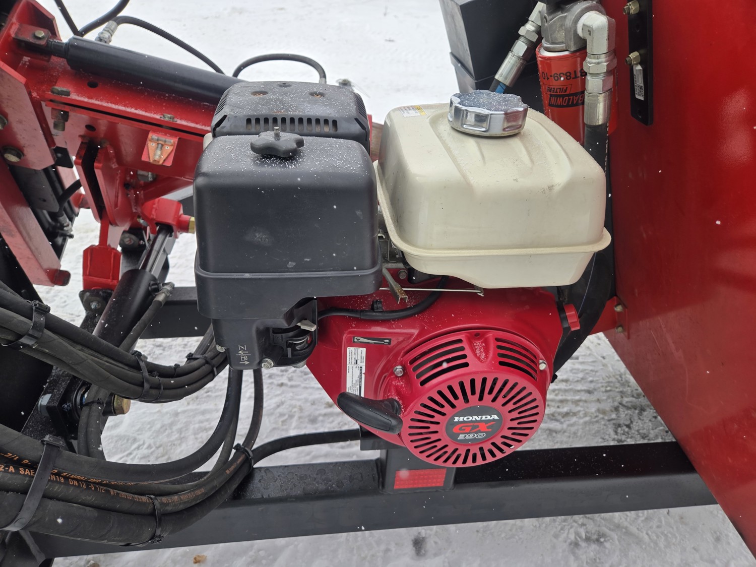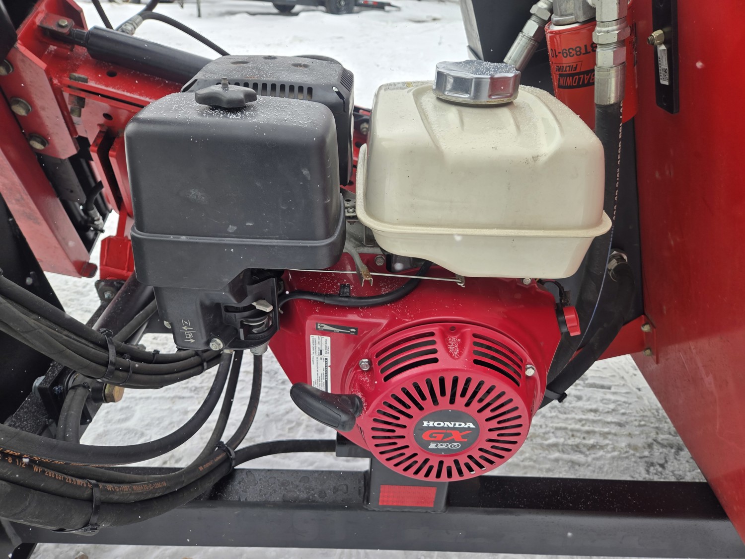 Honda 13 HP gas engine, adjustable hammer height, 225/75R15 tires, Note: In 2024 complete upgrade on all pins and bushings to oversize with grease fittings (make unit much tighter than factory pins and bushings), upgraded post hugger, hammer cylinder resealed, wheel bearings replaced, engine serviced, unit is excellent condition ready to go to work