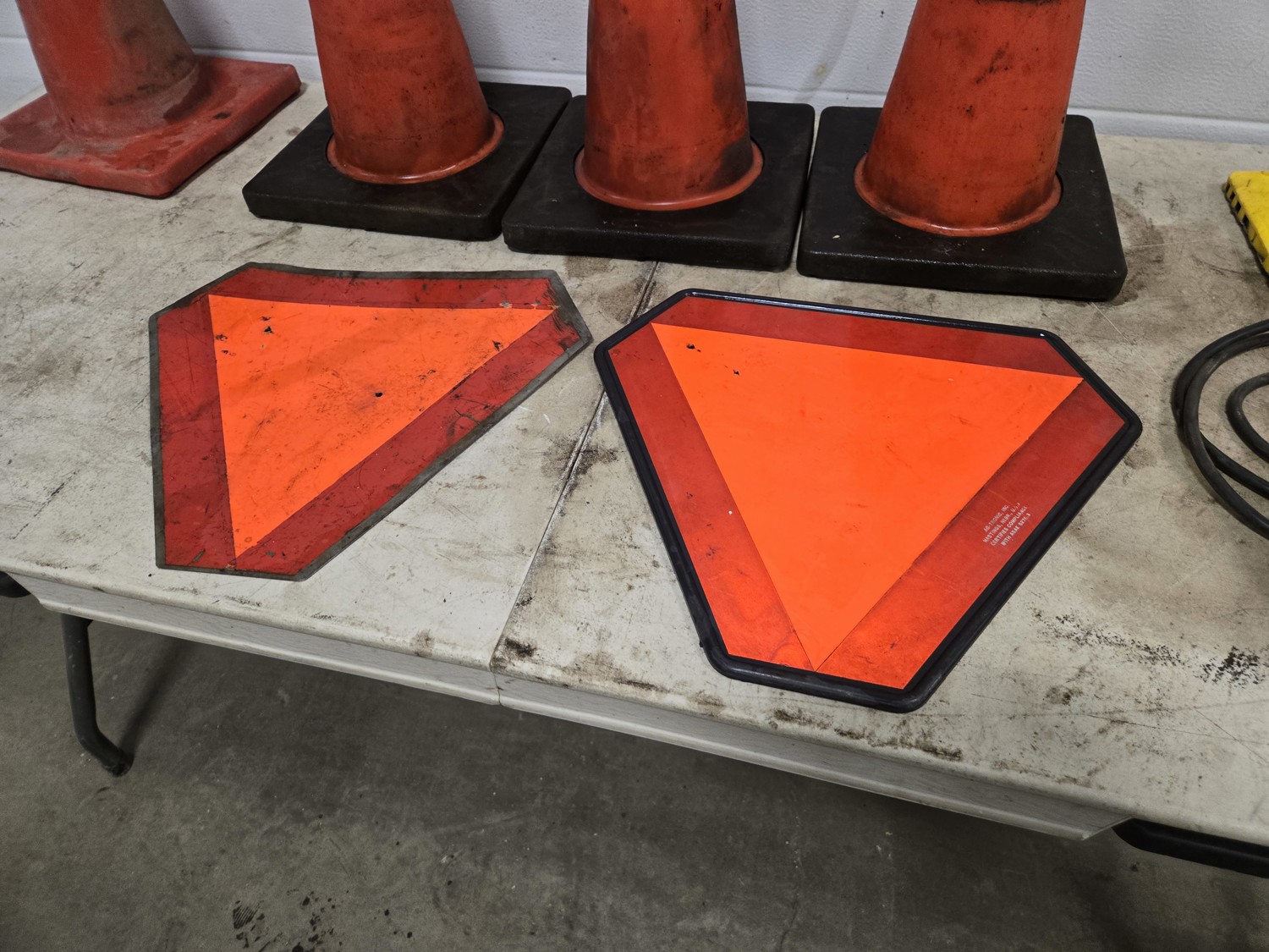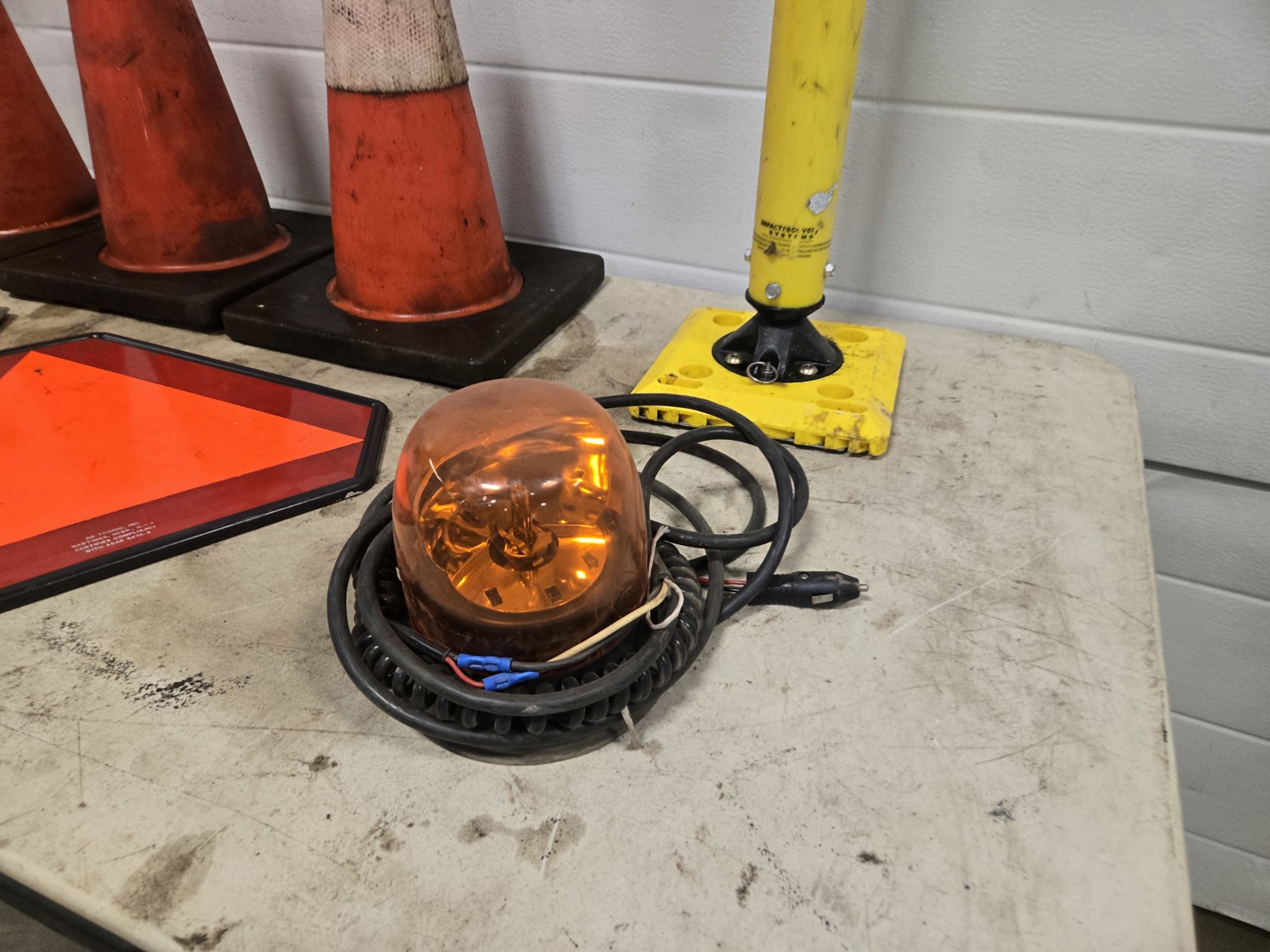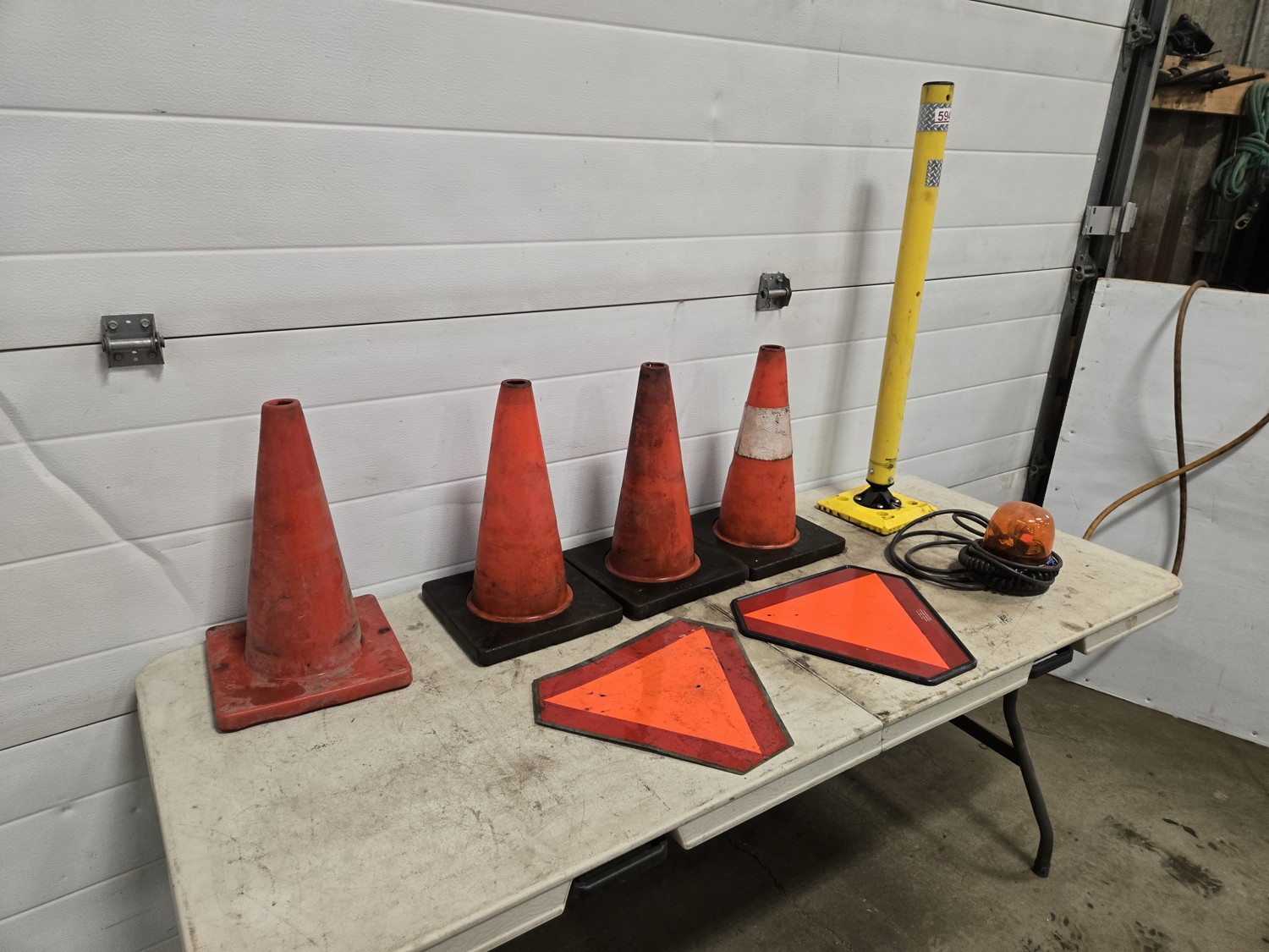 98 (4) Safety Cones, Yellow safety Stand, 12 V Beacon & (2) Slow Moving Signs