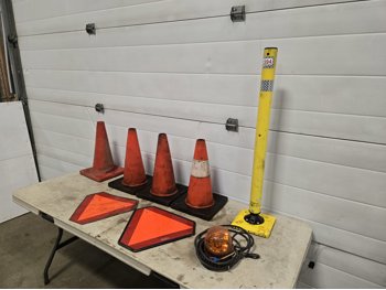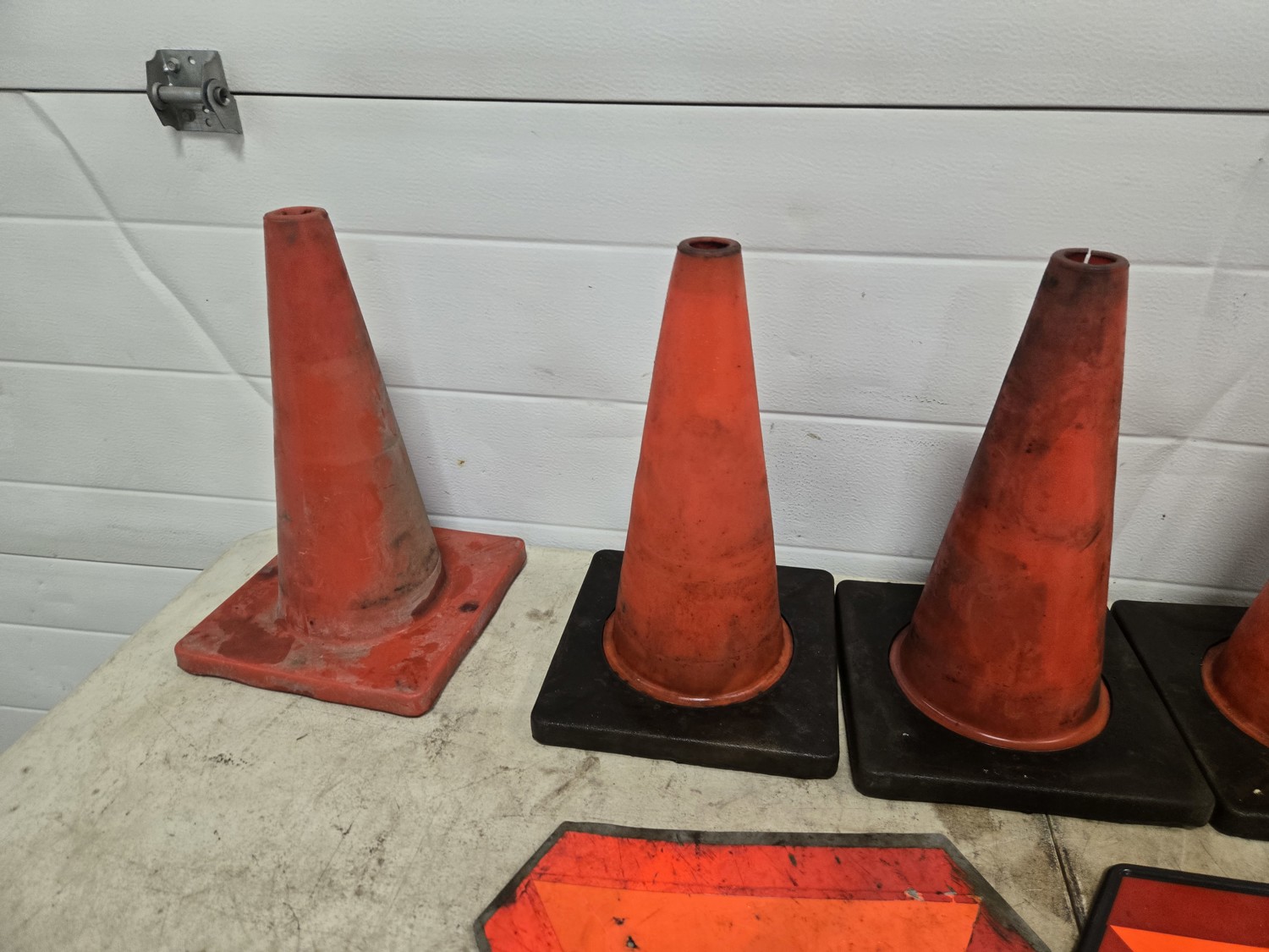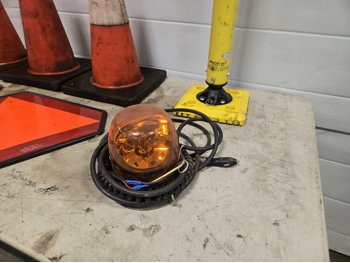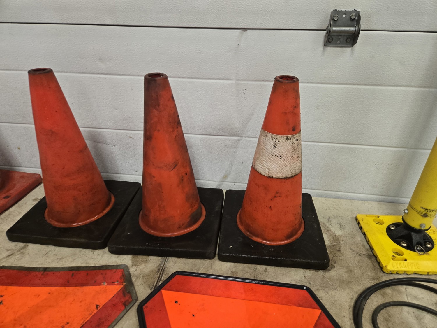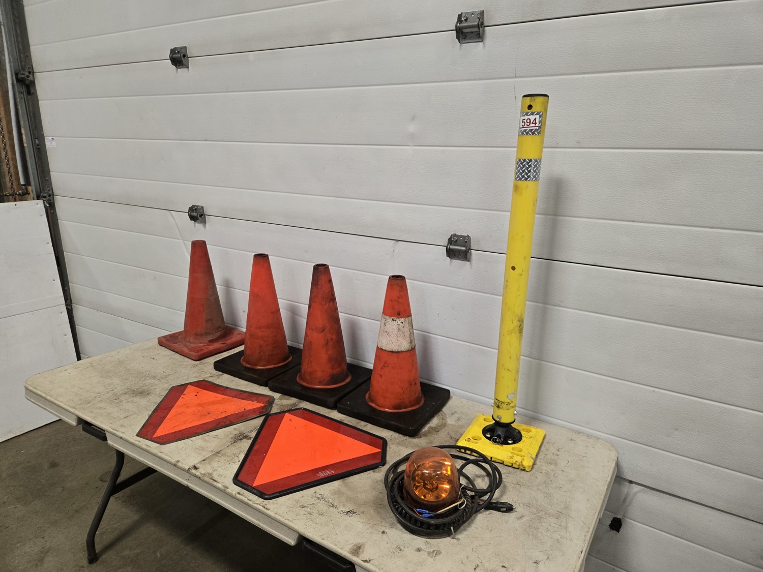 98 (4) Safety Cones, Yellow safety Stand, 12 V Beacon & (2) Slow Moving Signs