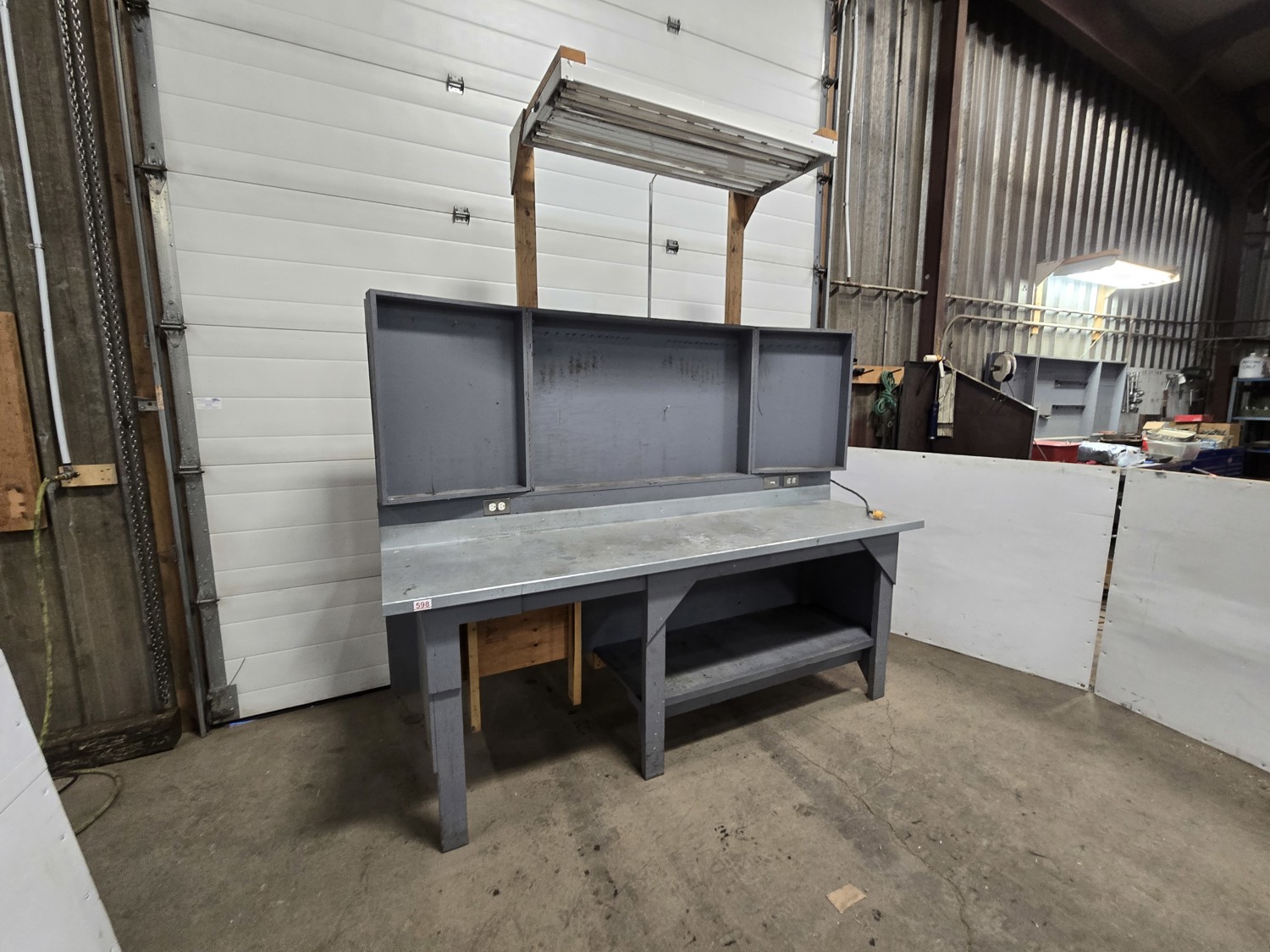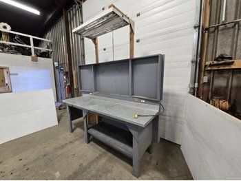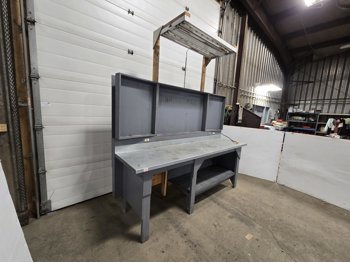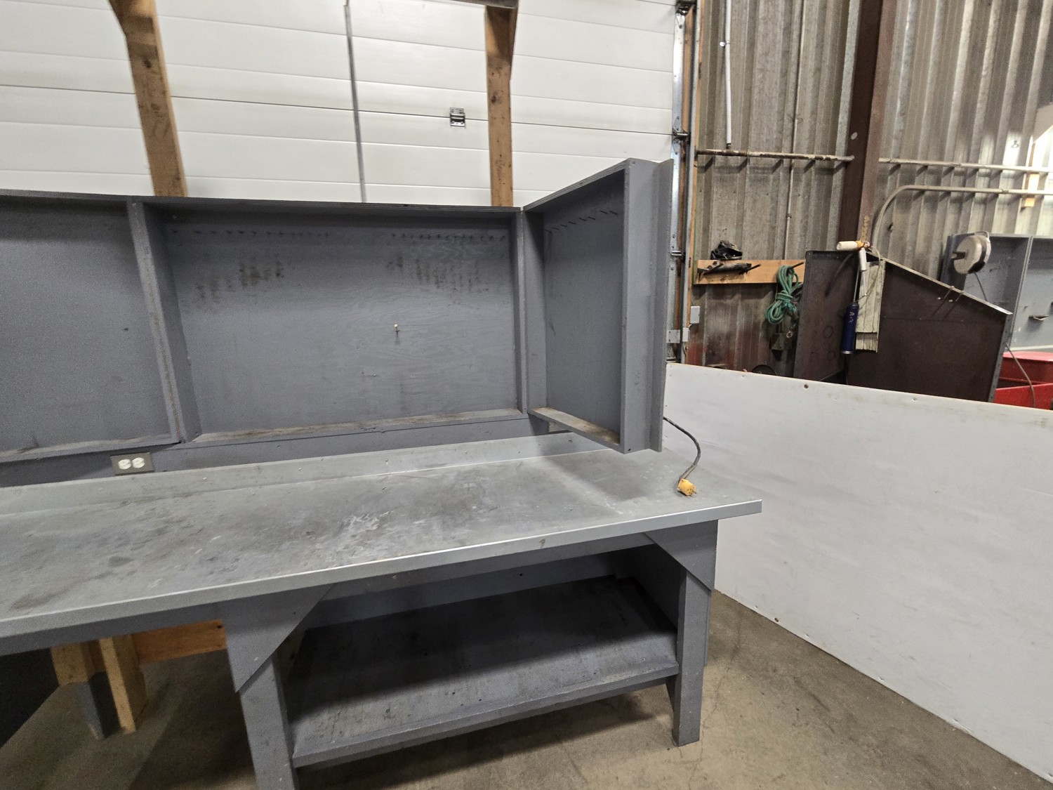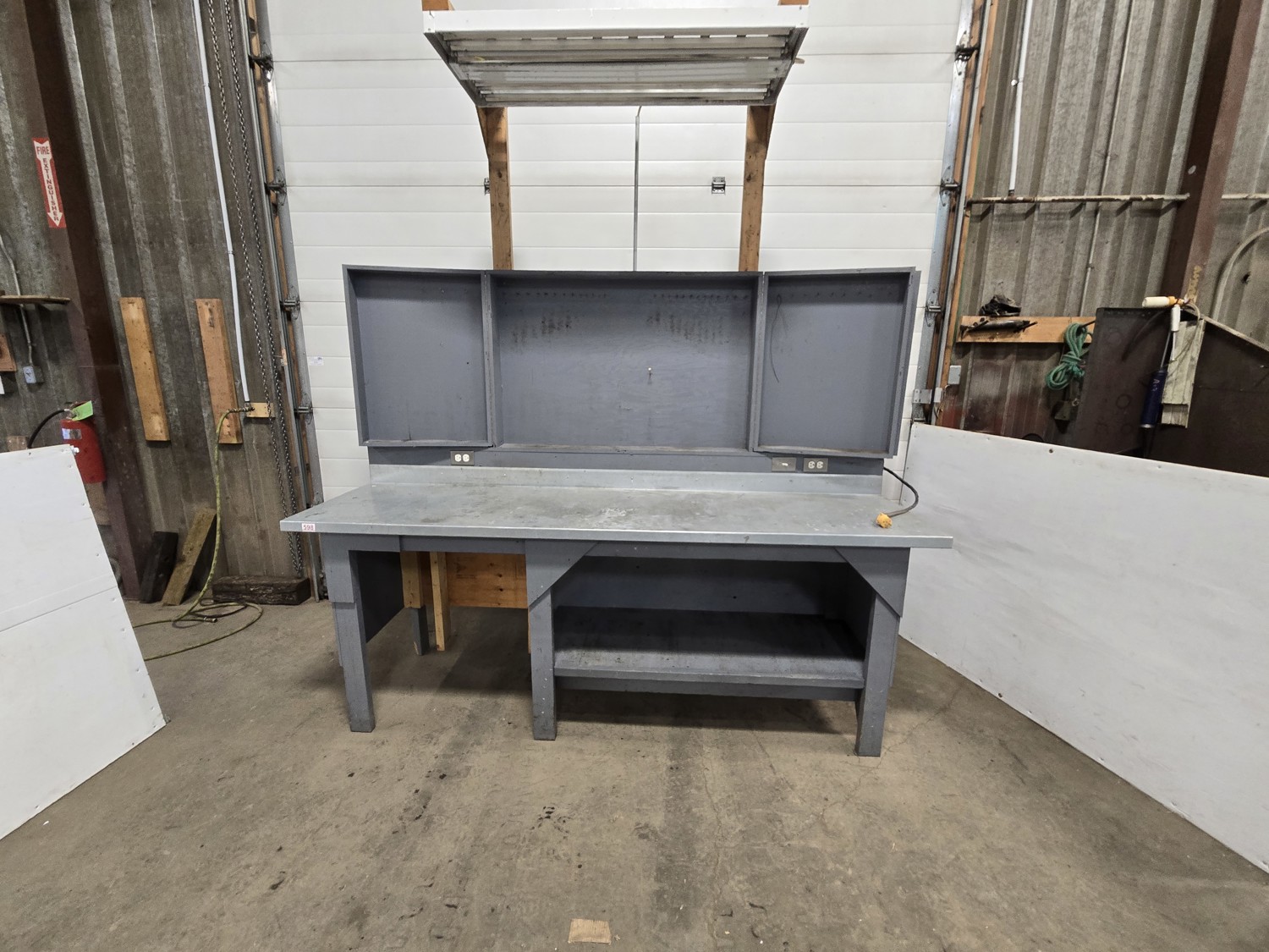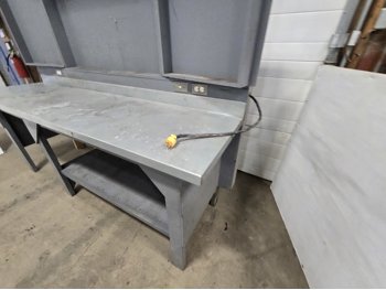 wired with plugs and light, 29 inch deep, 37 inch high, with folding door tool storage above bench