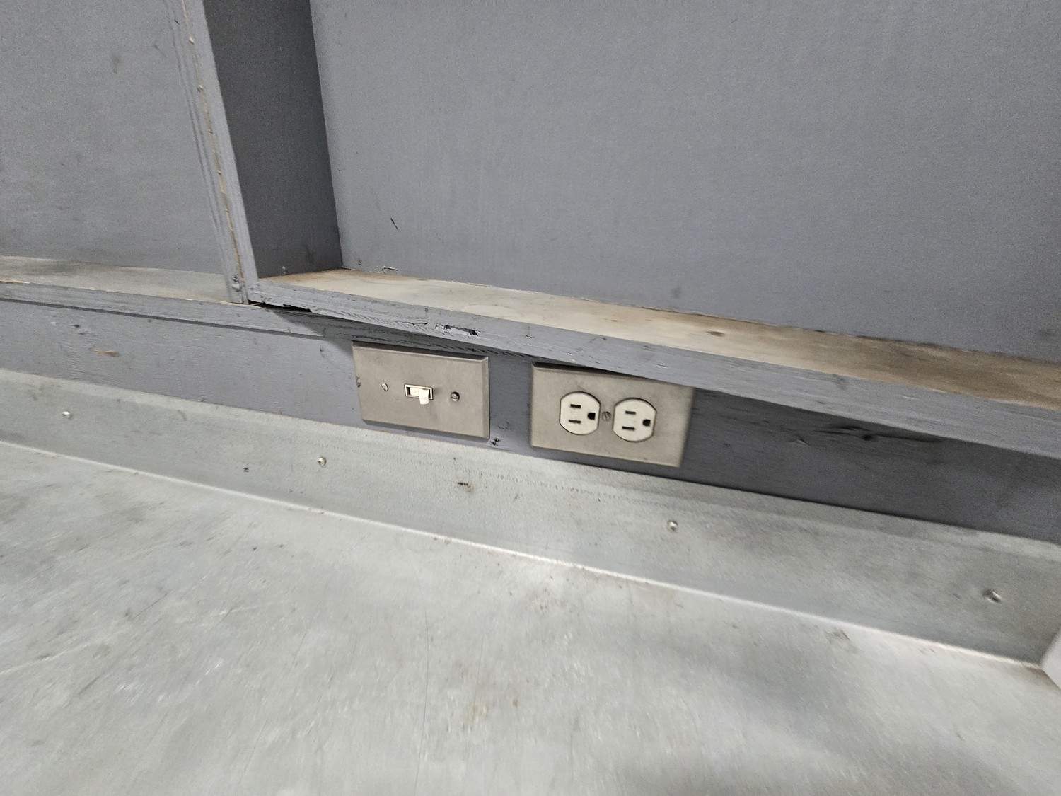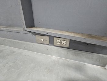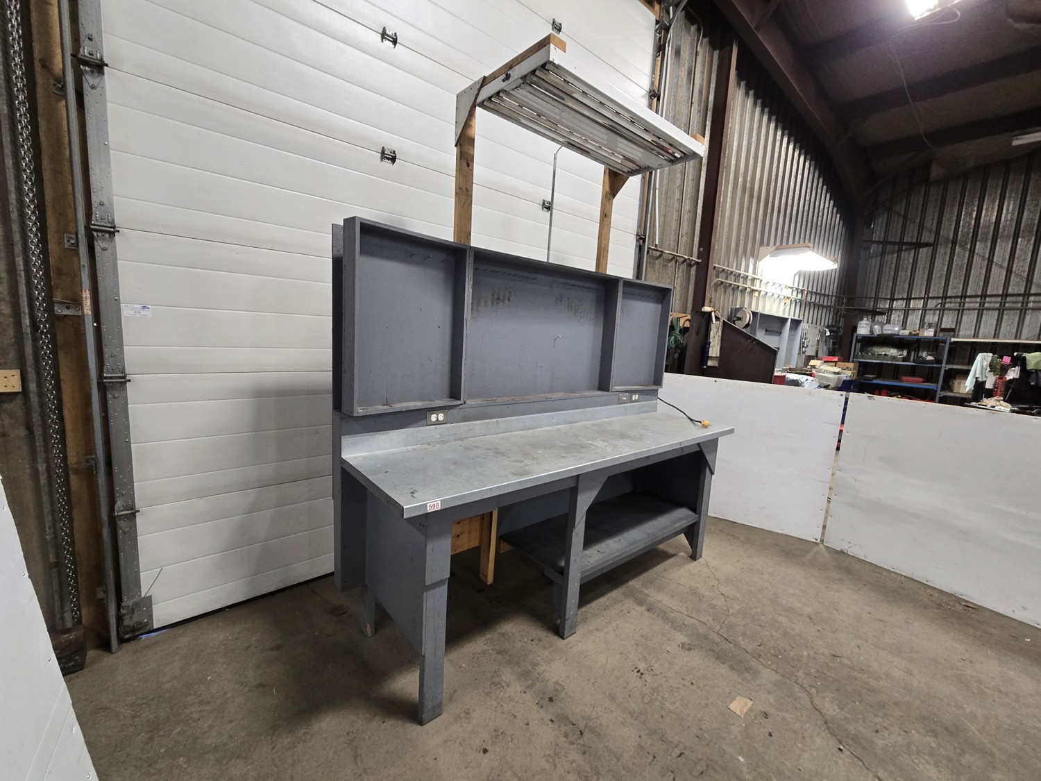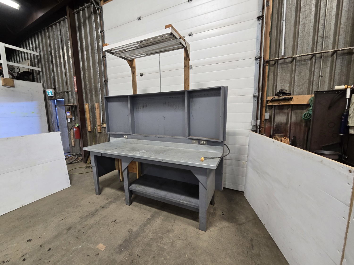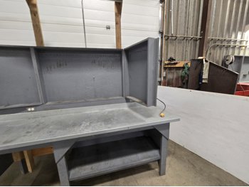 wired with plugs and light, 29 inch deep, 37 inch high, with folding door tool storage above bench