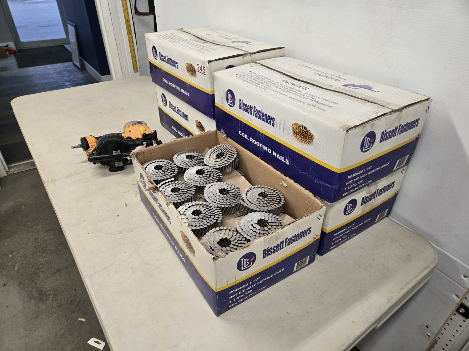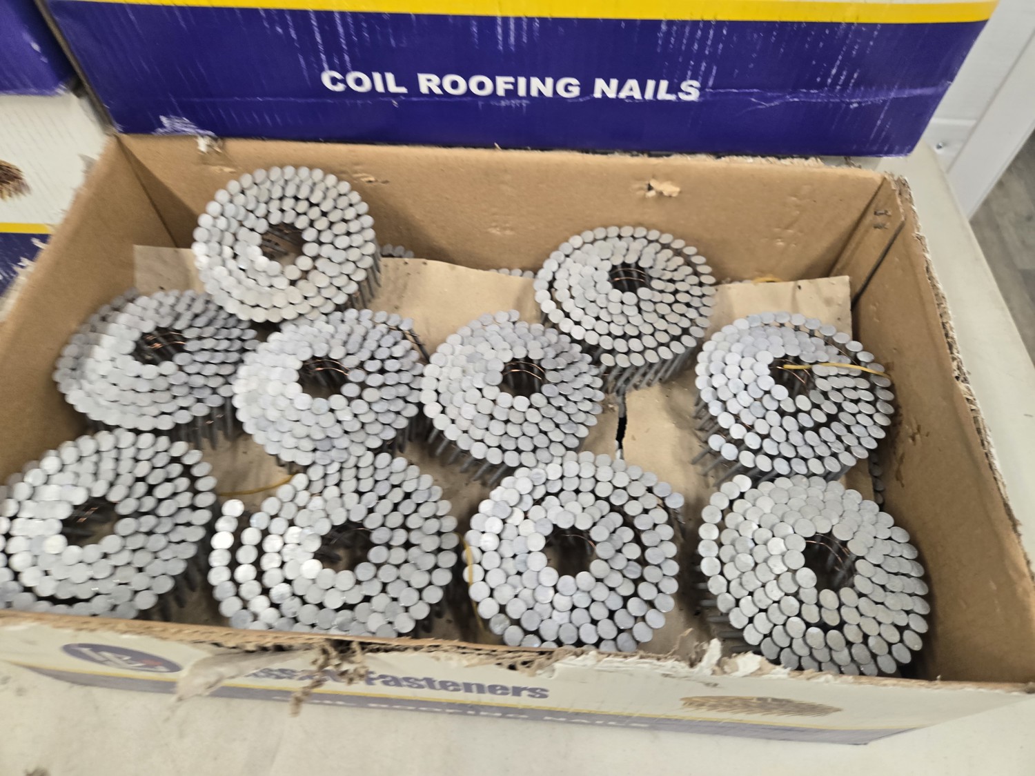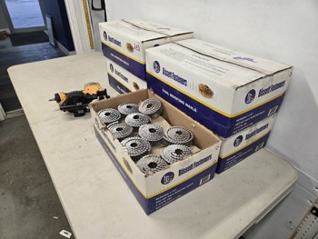 (4) full boxes of 1-1/2 coil nails, (1) 3/4 full box of 1-1/2 inch coil nails