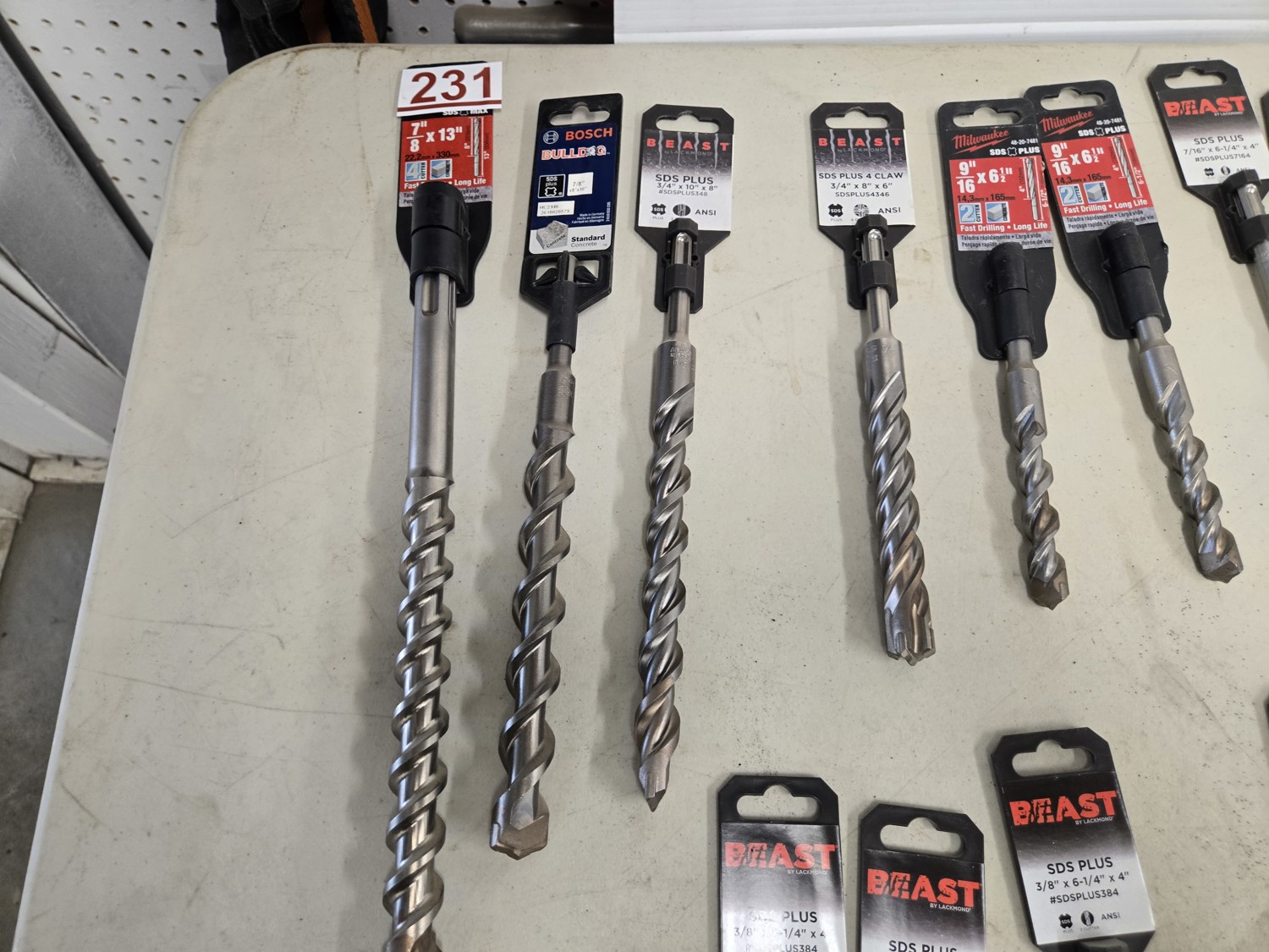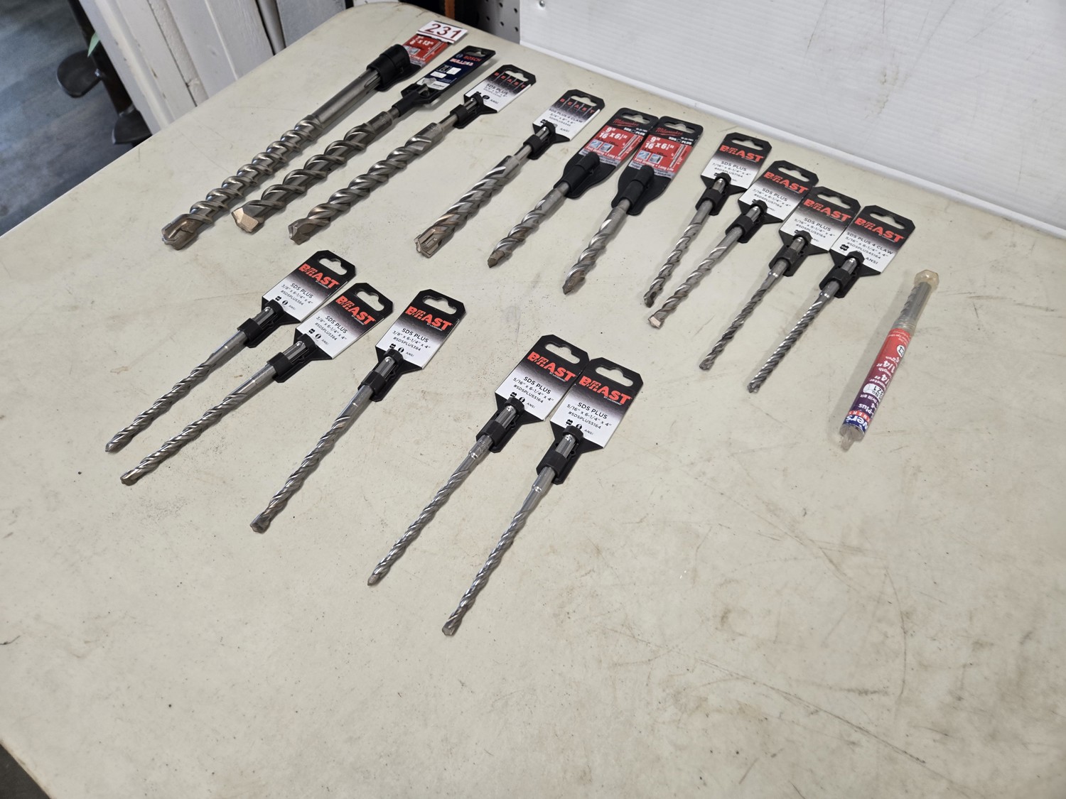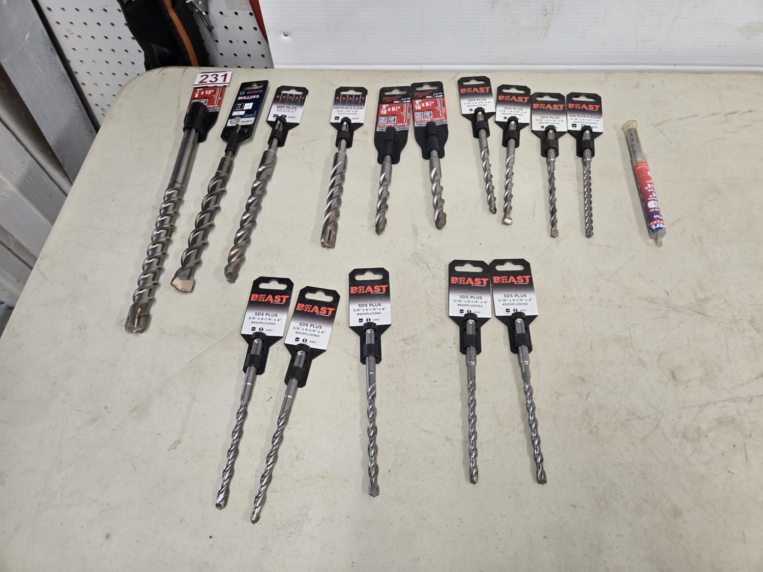 (1) SDS max 7/8 inch X 13 inch, SDS Plus bits (1) 7/8 X 10 inch, (1) 3/4 inch X 10 inch, (1) 3/4 X 8 inch, (2) 9/16 inch X 6.5 inch, (2) 7/16 X 6.25 inch, (3) 3/8 X 6.25 inch, (4) 5/16 X 6.25 inch, (1) 1/4 inch X 6.25 inch