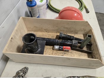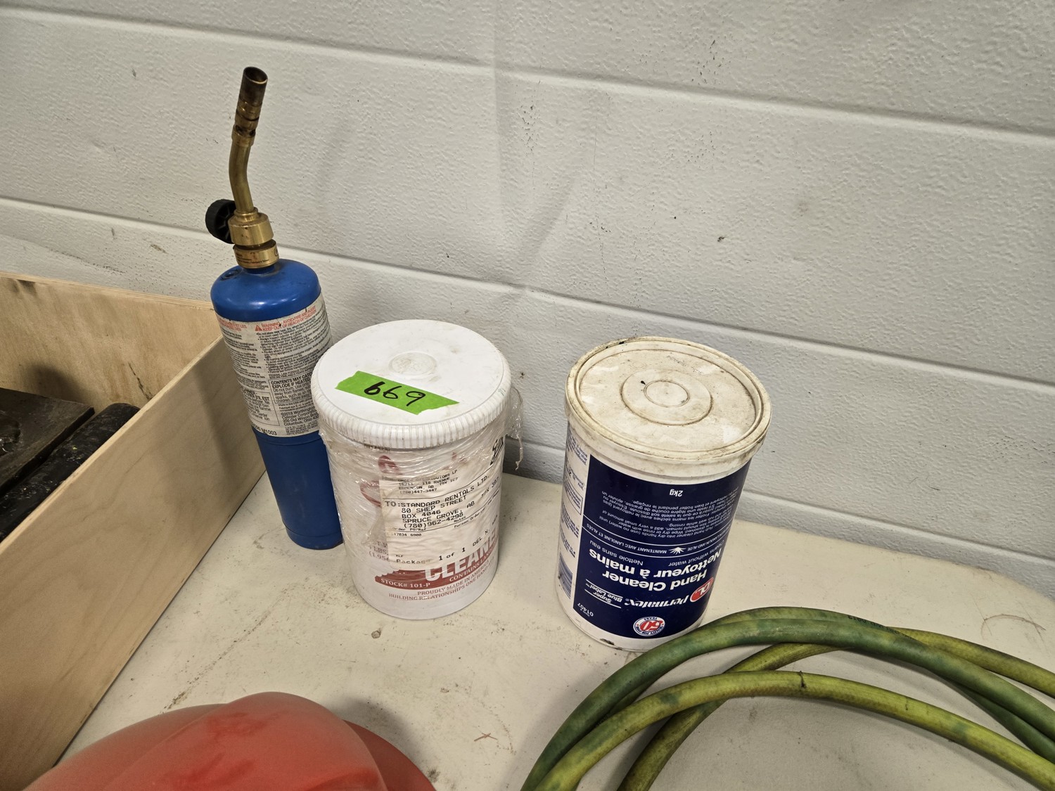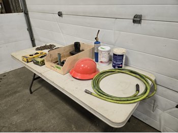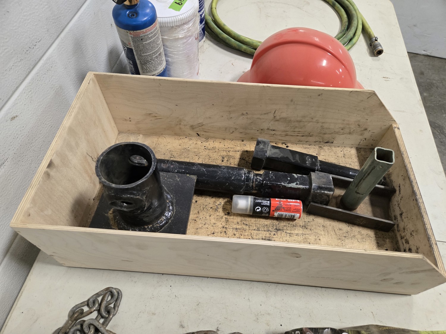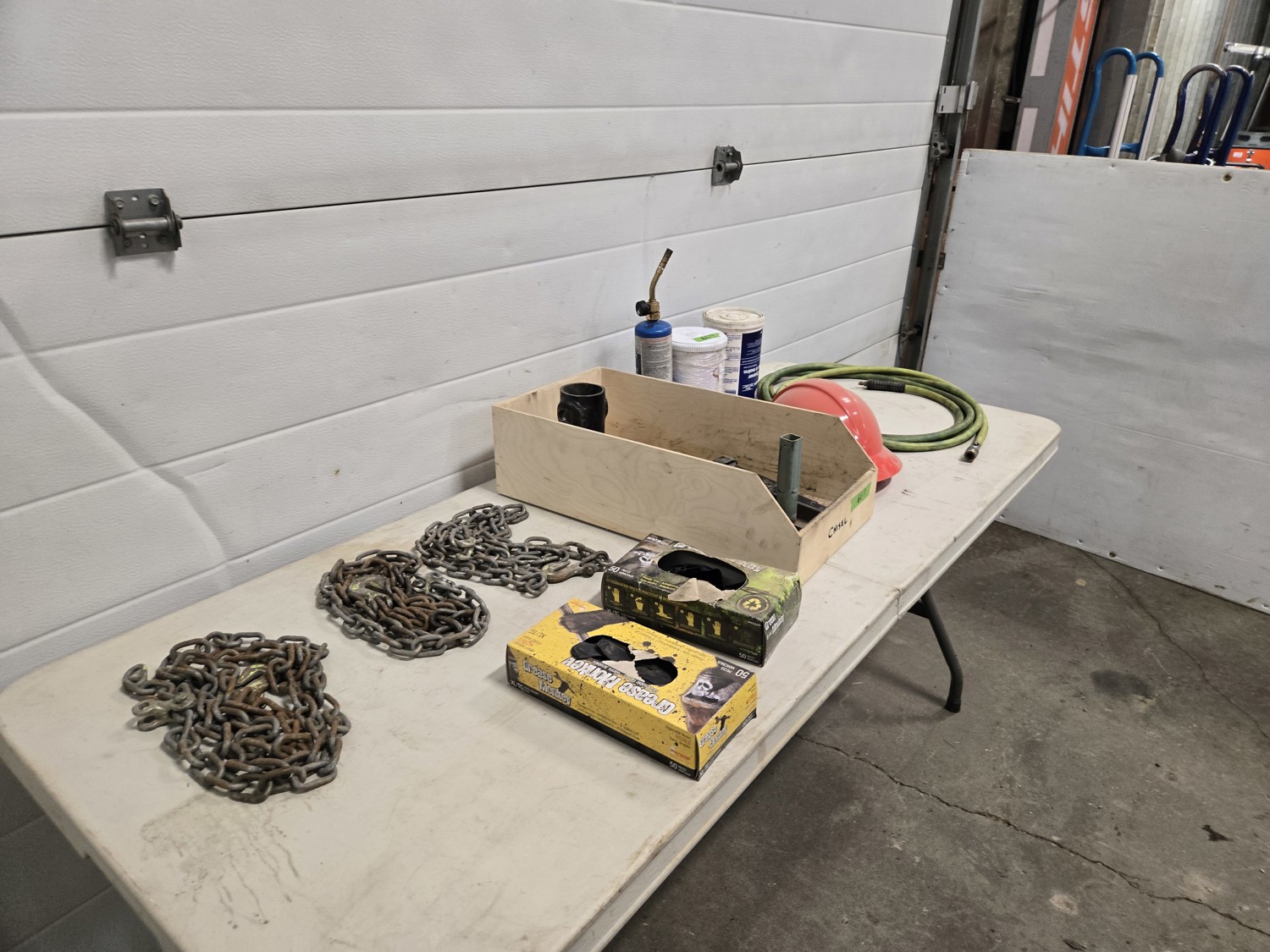 (1) air Hose, (3) small chains, (1) unused hard hat, small cabinet, pile driver attachments, Nitrile gloves, (2) part containers of hand cleaner, propane torch