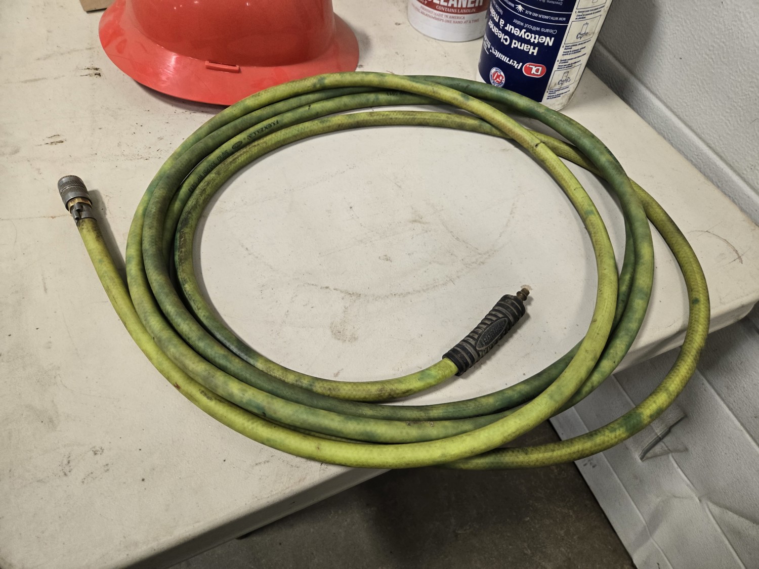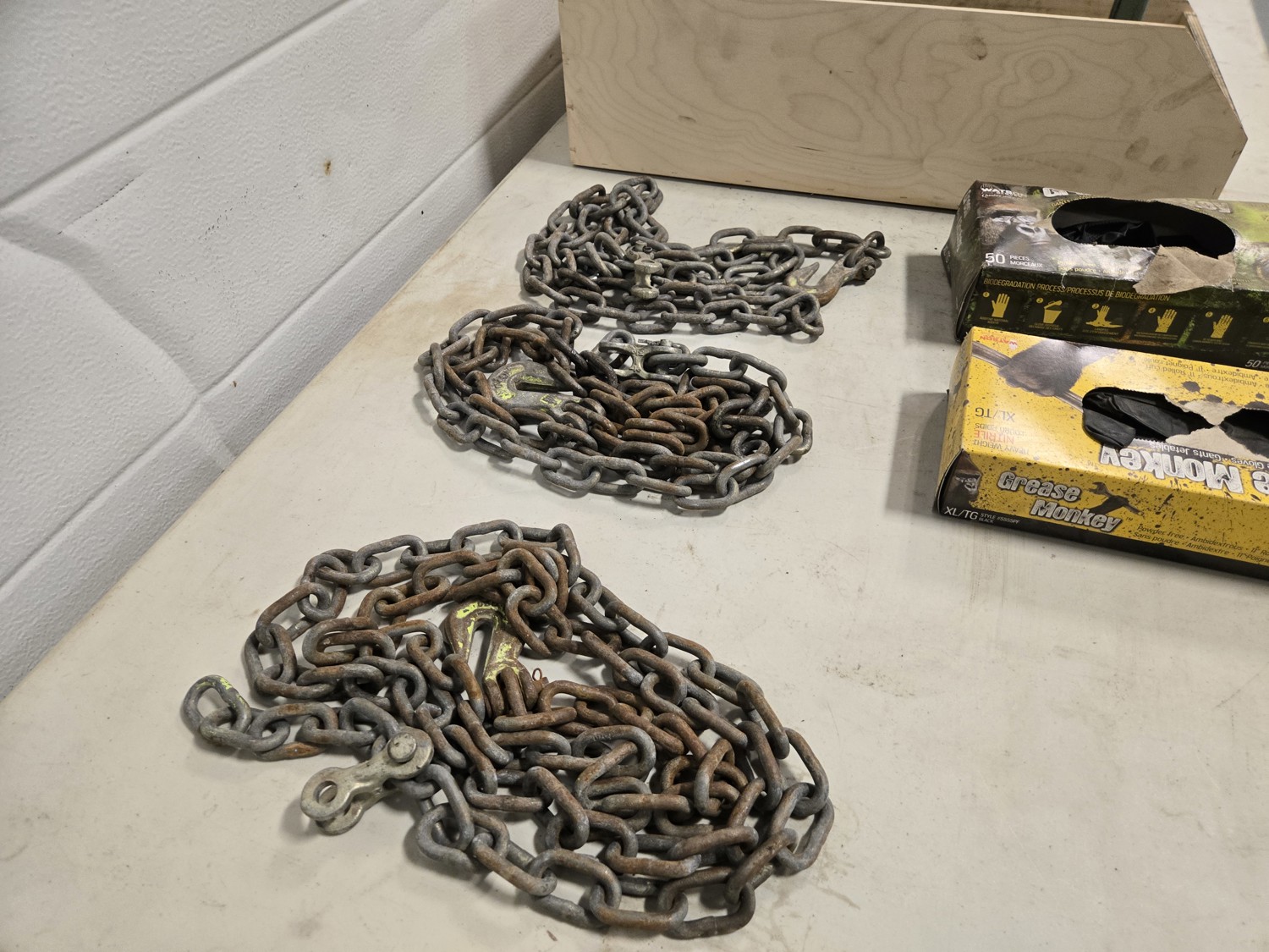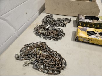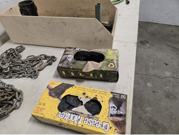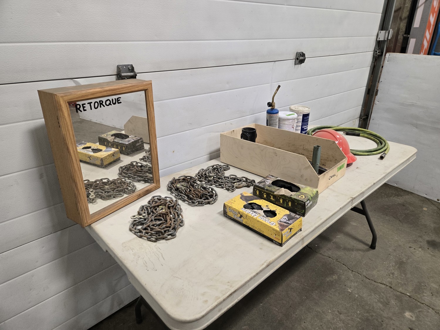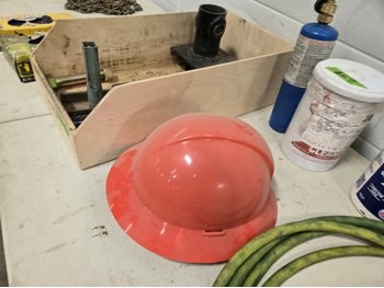 (1) air Hose, (3) small chains, (1) unused hard hat, small cabinet, pile driver attachments, Nitrile gloves, (2) part containers of hand cleaner, propane torch