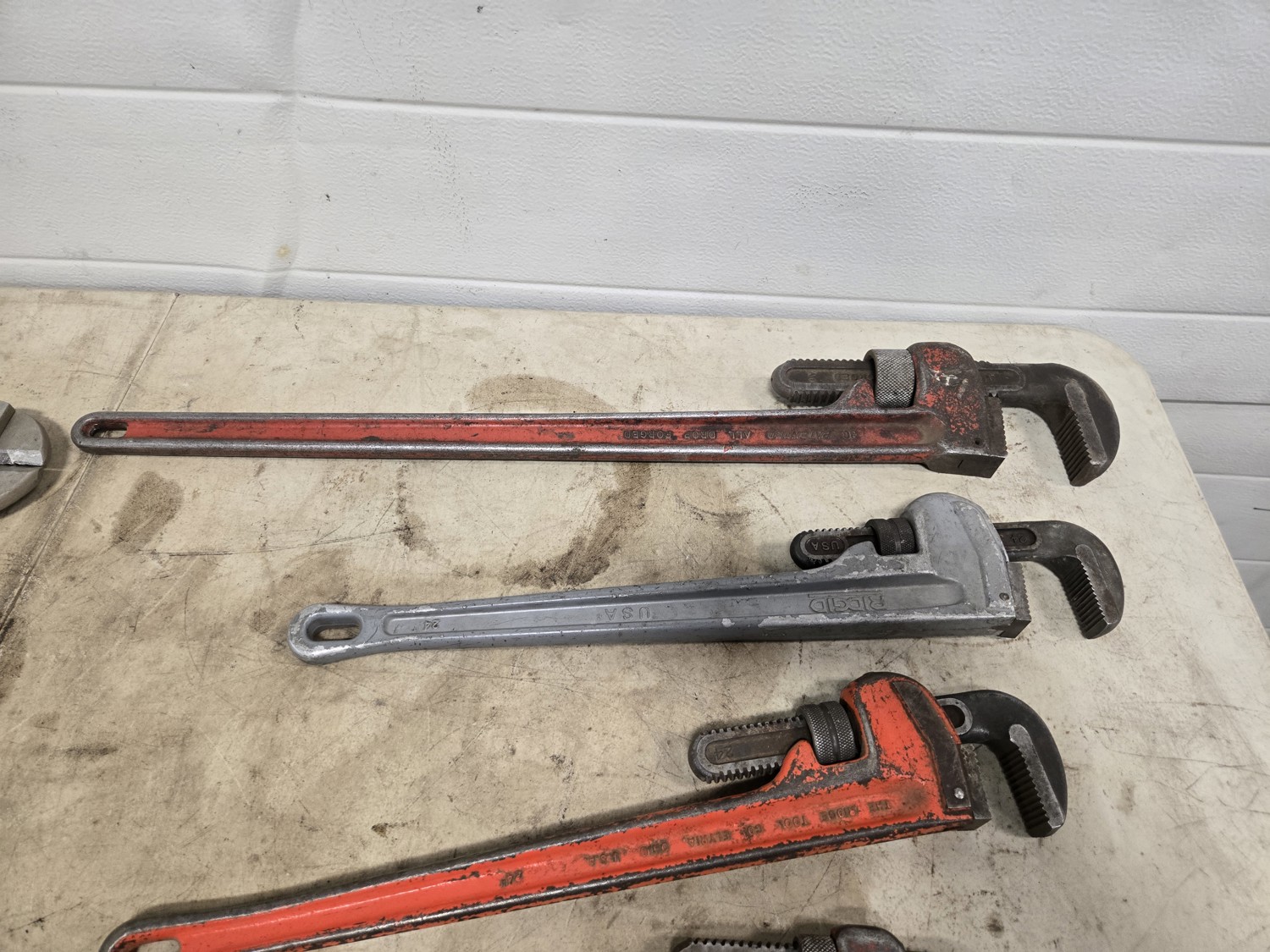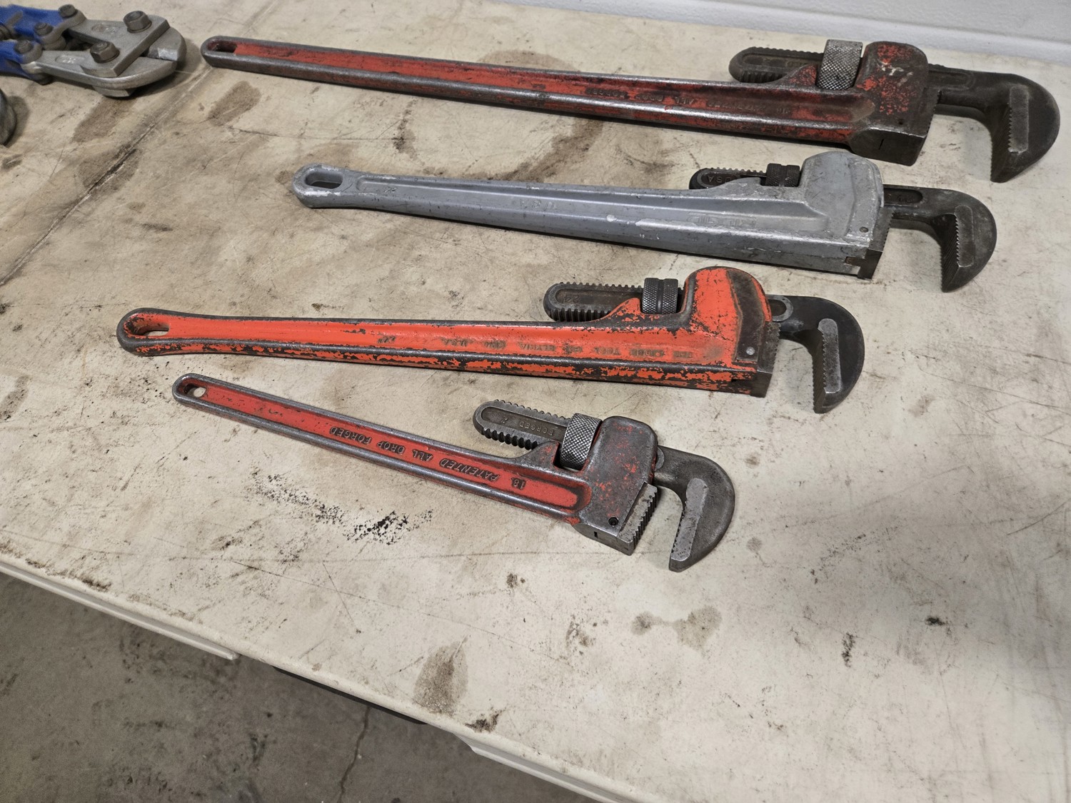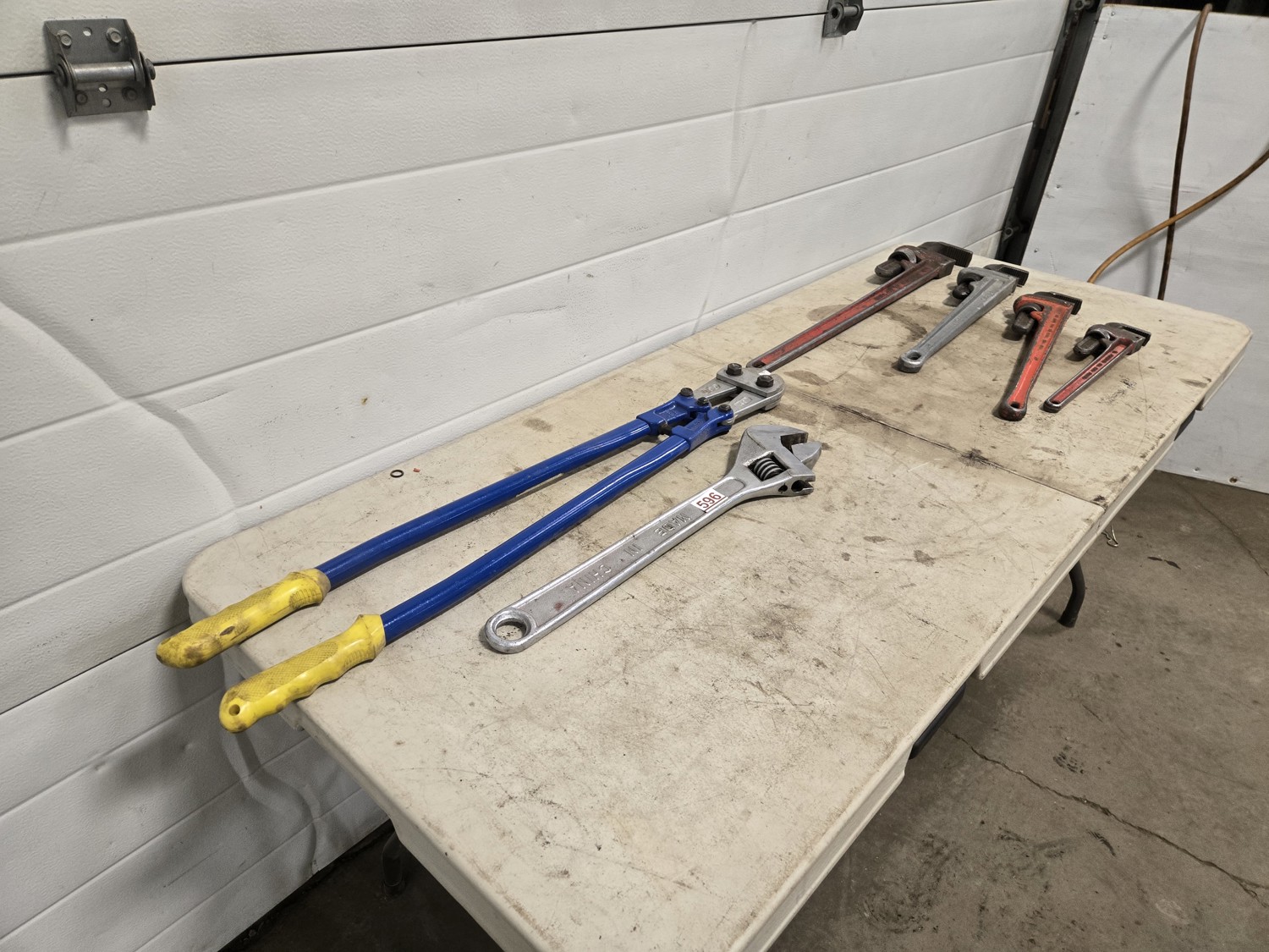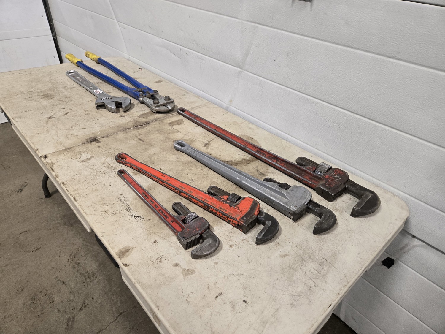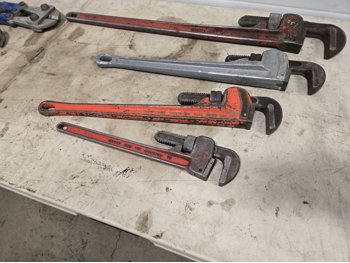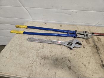 (1) large bolt cutter, (1) 36 inch pipe wrench, (1) 24 inch pipe wrench, (1) Ridgid aluminum 24 inch pipe wrench, (1) 18 inch pipe wrench, large adjustable wrench