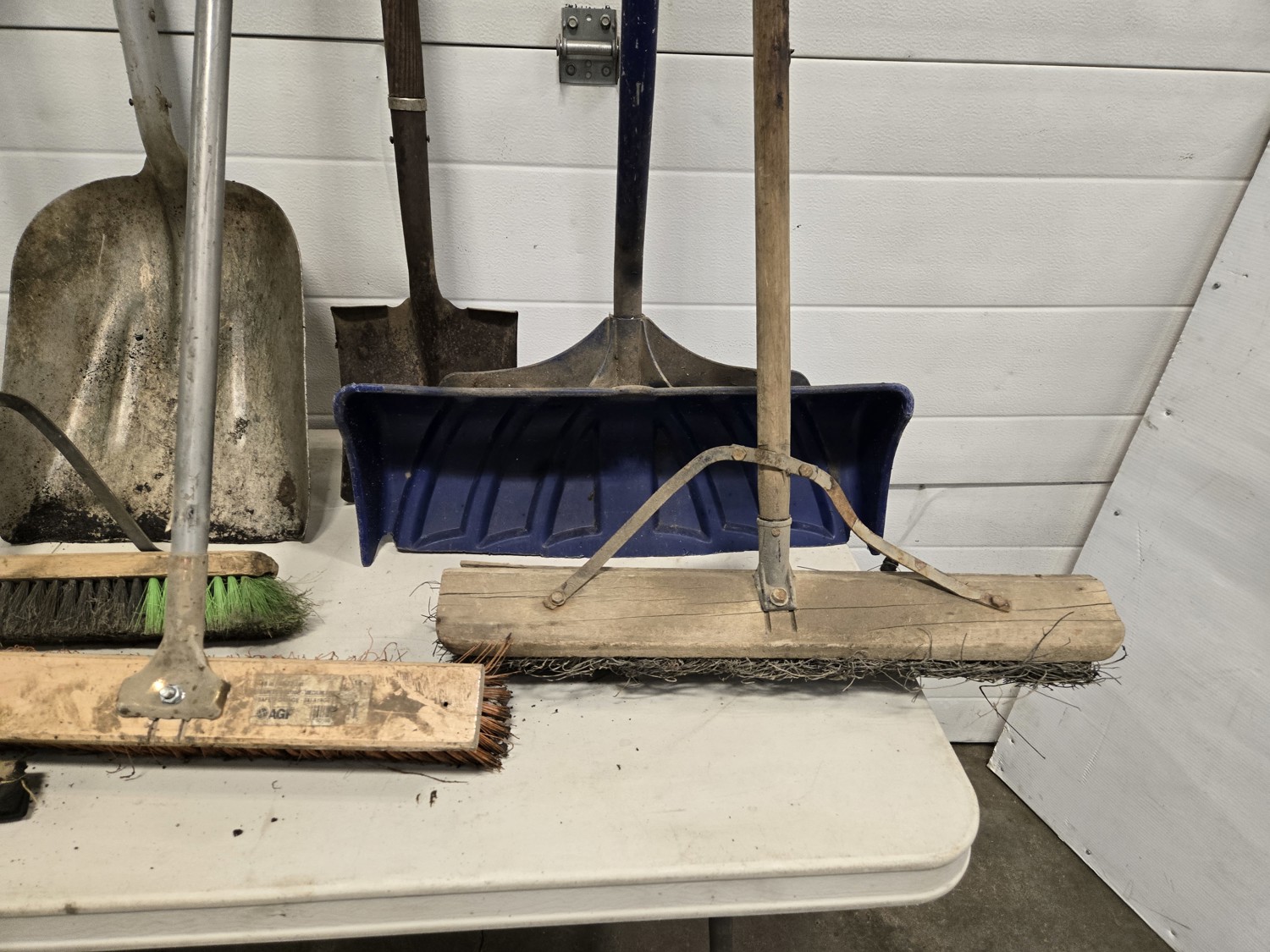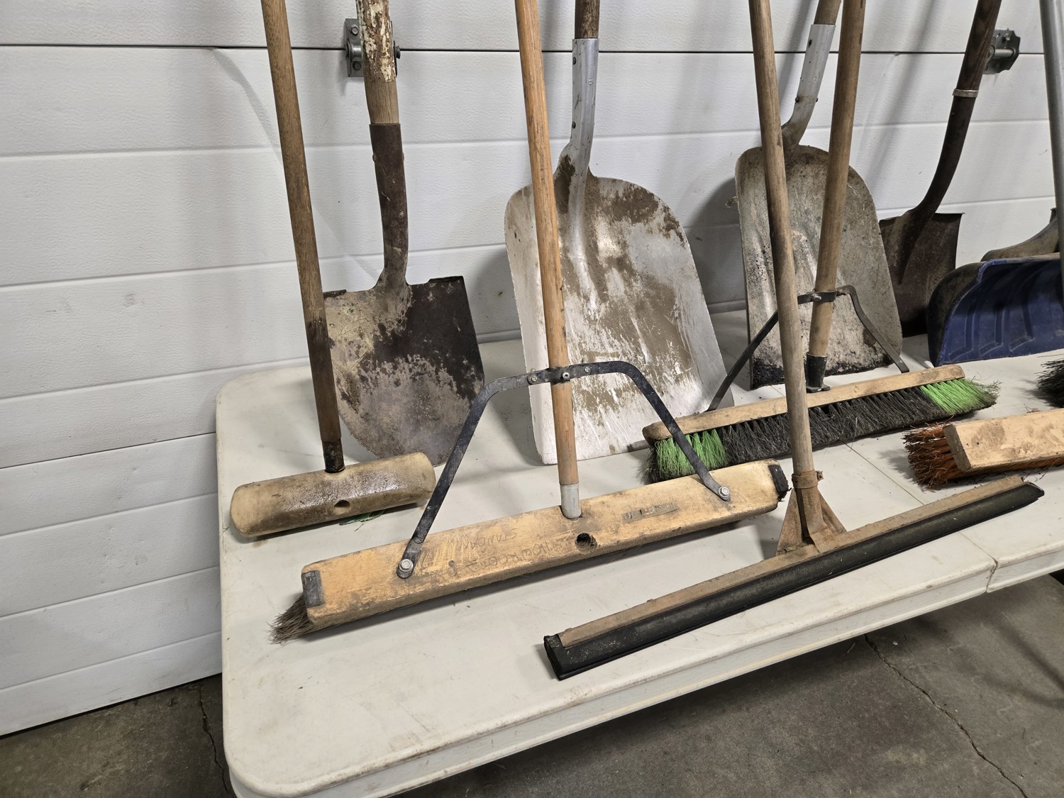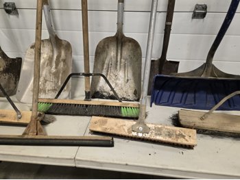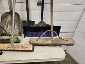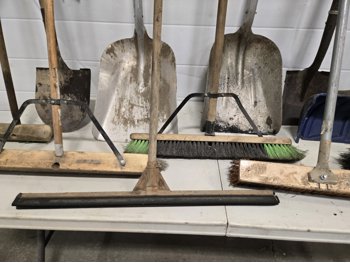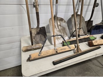 (4) shop brooms, (2) aluminum scoop shovels, (2) spades, (1) squeegee, (1) snow shovel