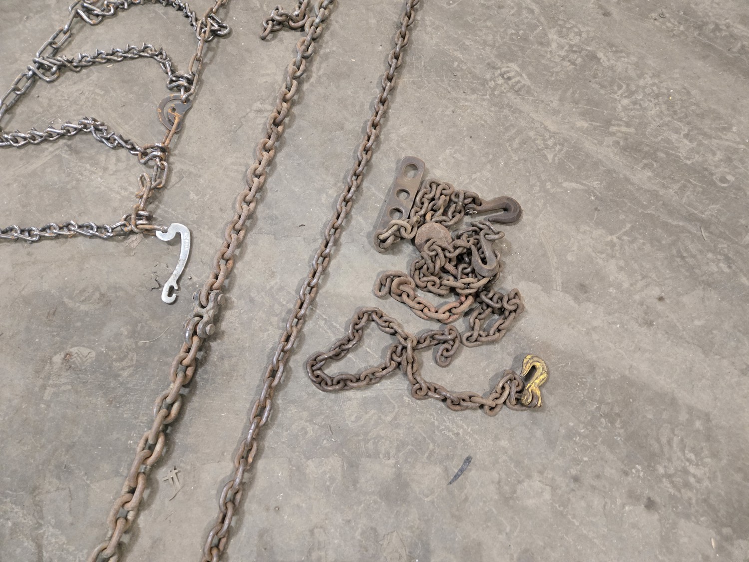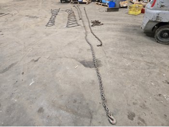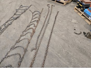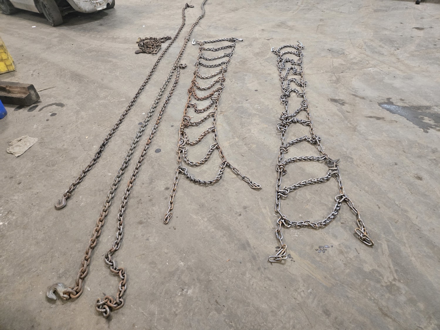 Set of 11R22.5 truck chains unused, 20 ft of 1/2 inch chain, 13 ft of 3/8 chain, pieces of chain