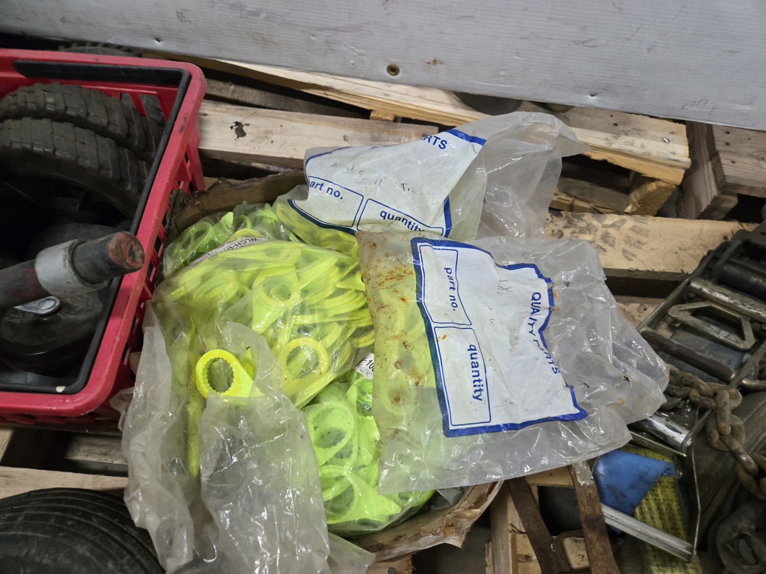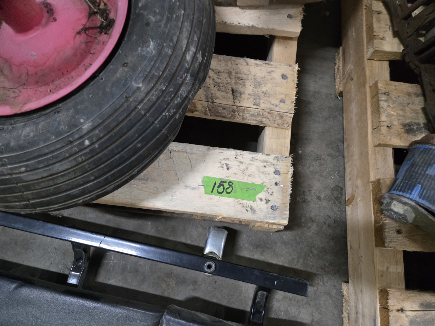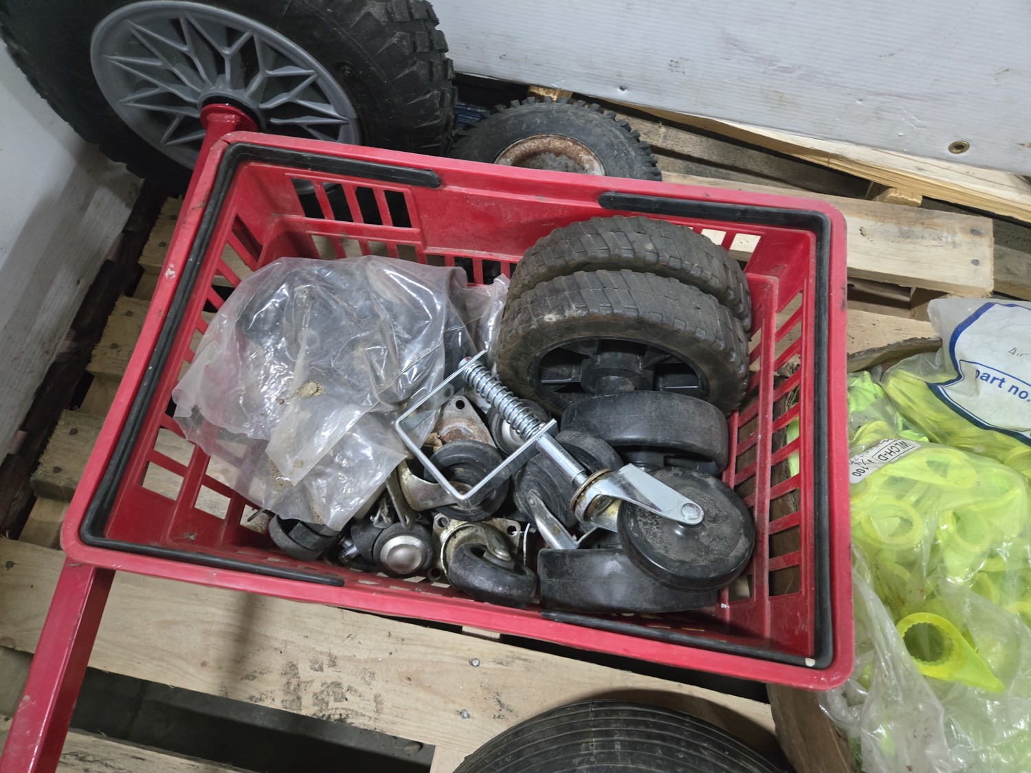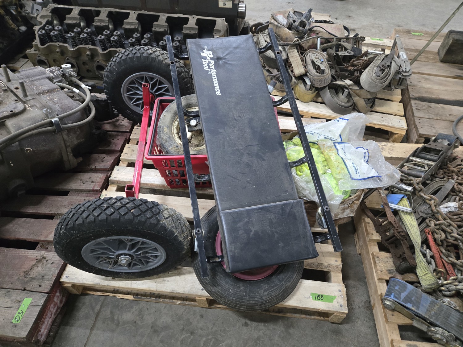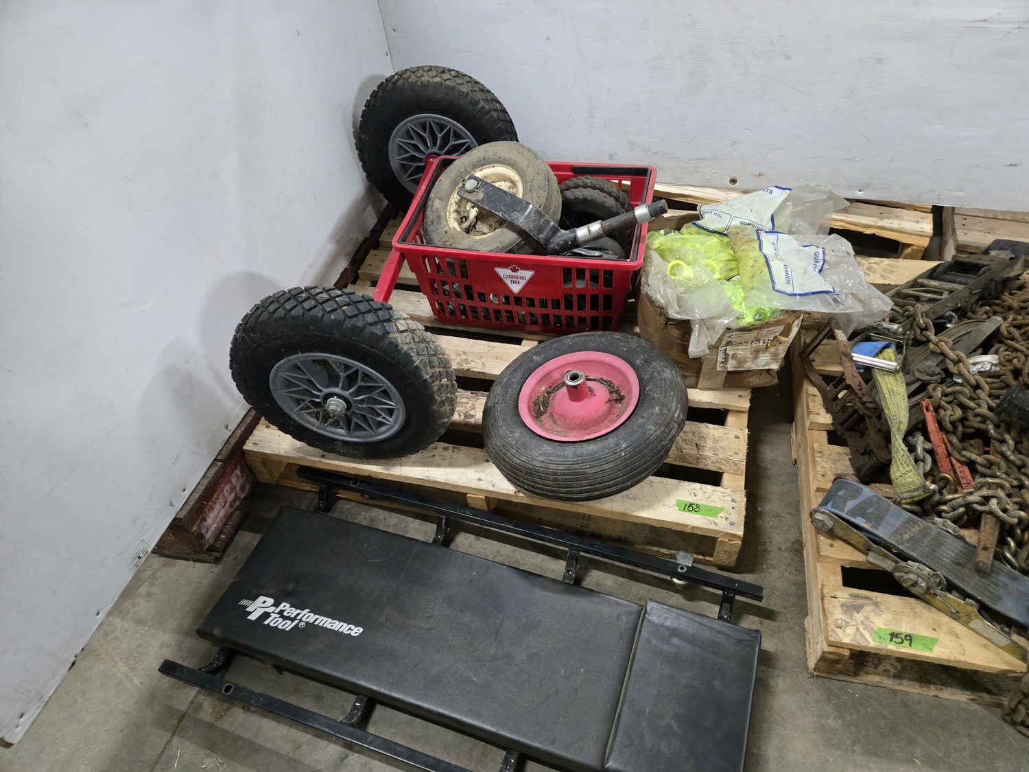 Mechanic's creeper, wheelbarrow wheel, 26 inch utility axle with wheels, qty of various size dolly wheels, qty of lug nut indicators