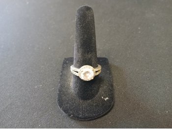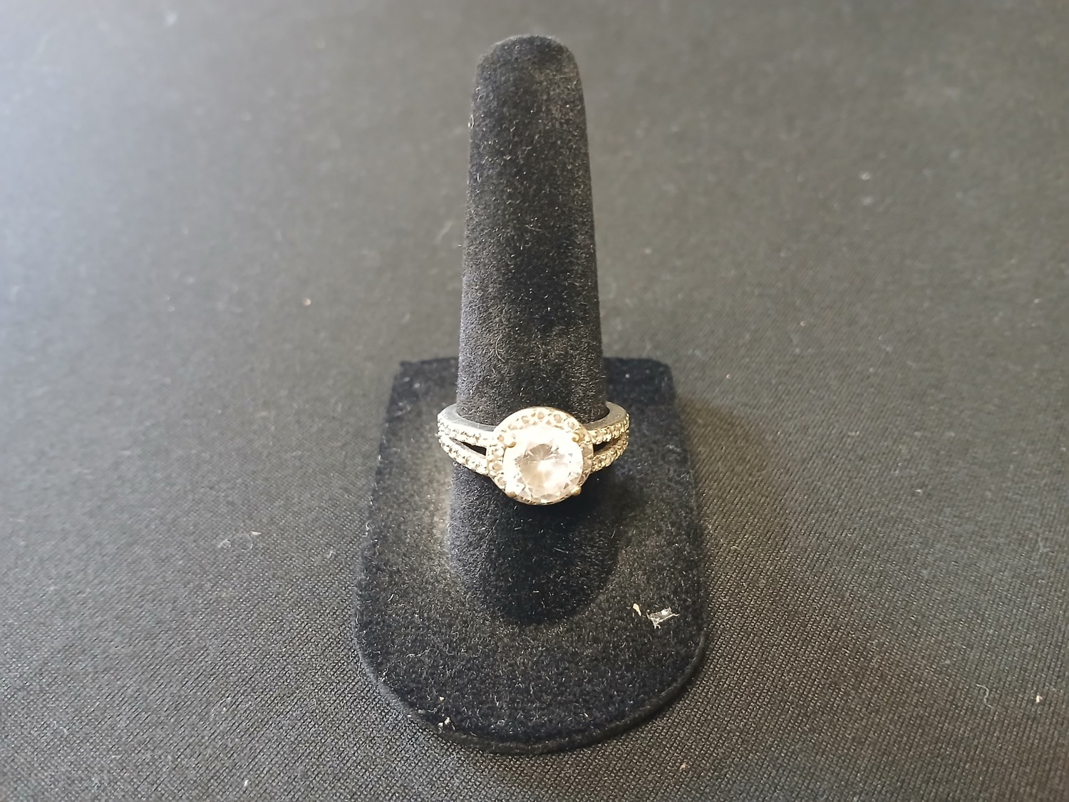 Multiple simulated diamonds accenting a brilliant cut stone. Size unknown.