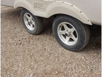 aluminum wheels, 15' awning, 2 propane tanks, battery, 4 leveling jacks, 1 pull out, spare tire, rear access ladder, thru storage, full kitchen with microwave, dining area, bunk beds, bathroom, master bedroom w/ TV, Jensen sound system.