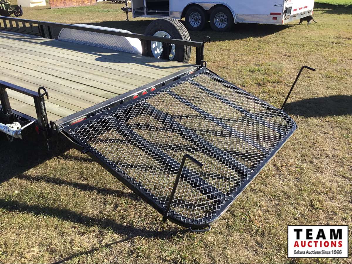 3500 lb axles, electric brakes, rear spring loaded ramp with elongated ramp hinges ( allowing to lock upright or fold forward on to deck to allow for long material,front slide rails that come out to become side loading ramps, aluminum checker plate fenders, spare tire, 225/75R15 rubber, (2) rear support jacks also can be used for changing flat tire, Alberta registered ( have copy of registration on hand)