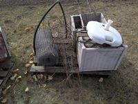 metal welding bench, (2) V8 engines, planter boxes, chicken wire, wire plant supports