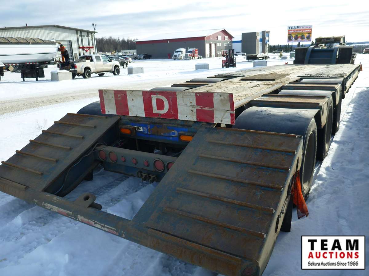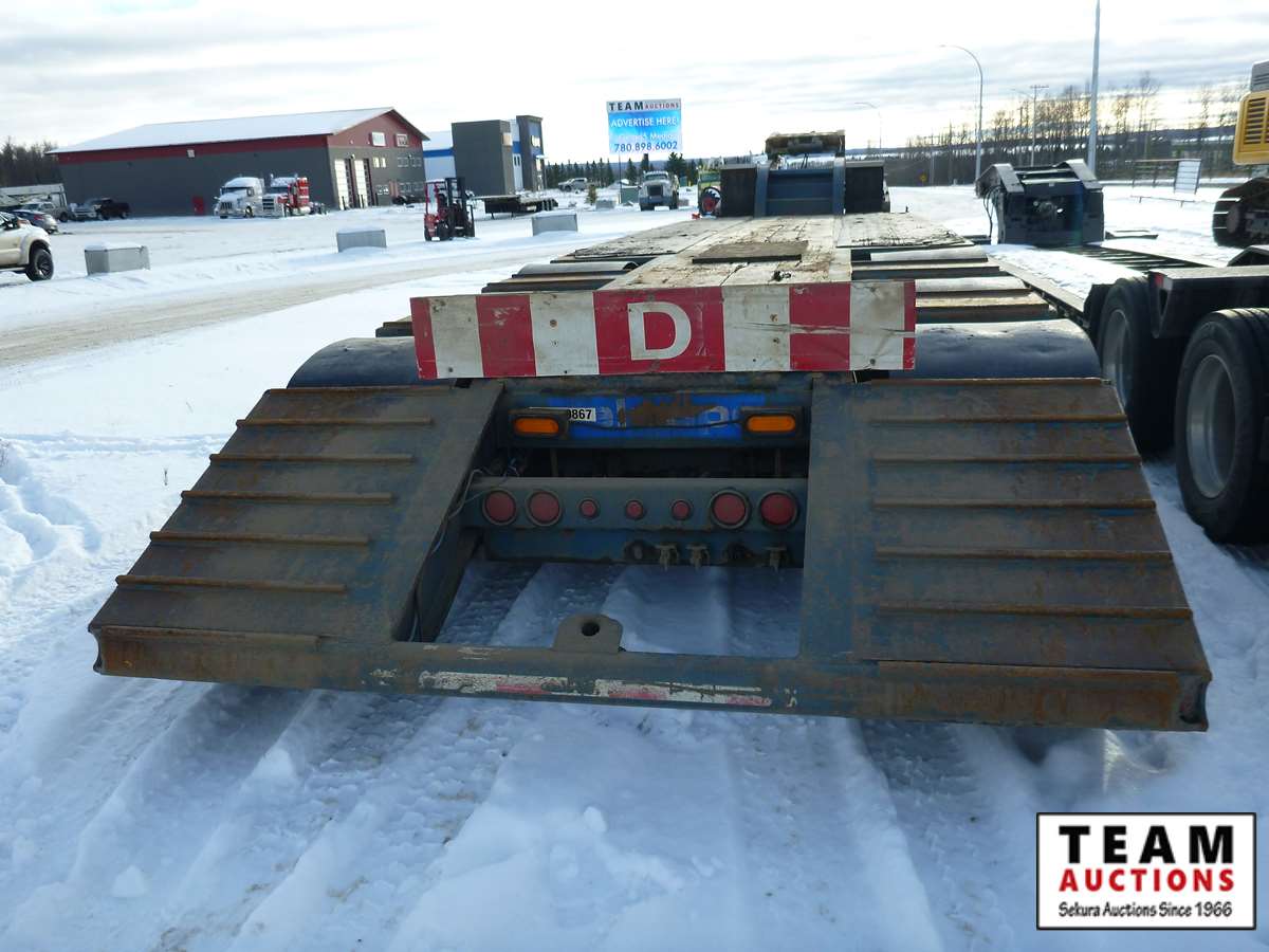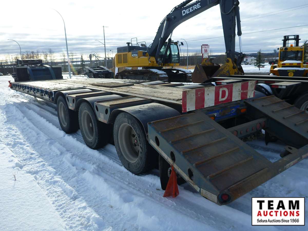 extendable neck, 25' main deck, 10' wide, air ride, GVW 59875 kgs, plumbed and set up for rear S/A booster, rear strobe lights, swing out wide load lights, 275/70R22.5 tires on aluminum rims, Alberta Registered, CVIP 2021 Aug.