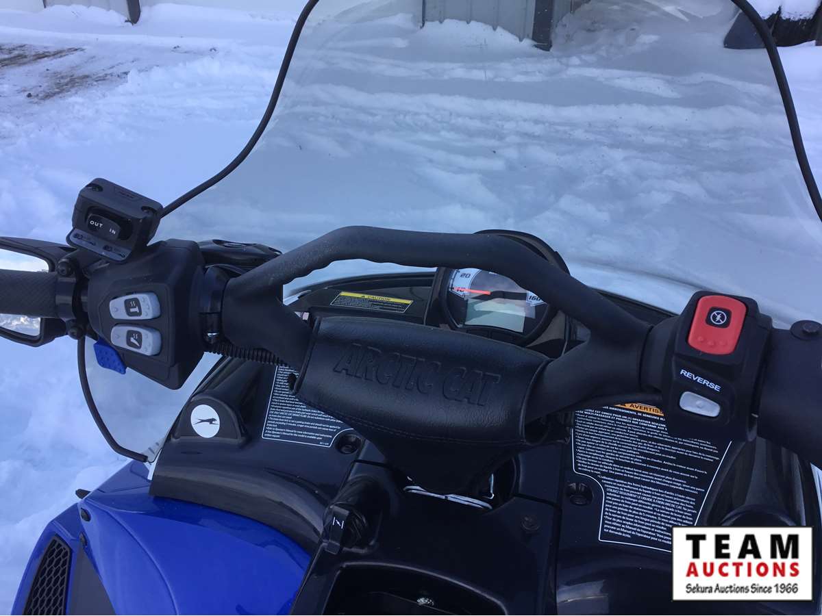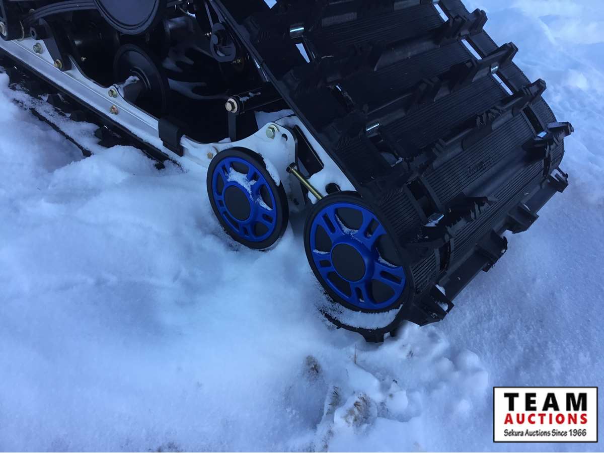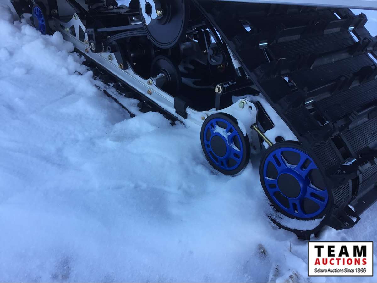 electric start fan cooled engine, 20" wide x 154' long track, 1 3/8" track lug height, front mount factory installed winch with cover, reverse with transfer case for extra pulling power, 17 US gal fuel tank, (3) person optional seat with back rest, rear storage, rear tow hitch, rear back up light, hand warmers, mirror kit, higher windshield, 5 miles, 1.7 engine hours on unit