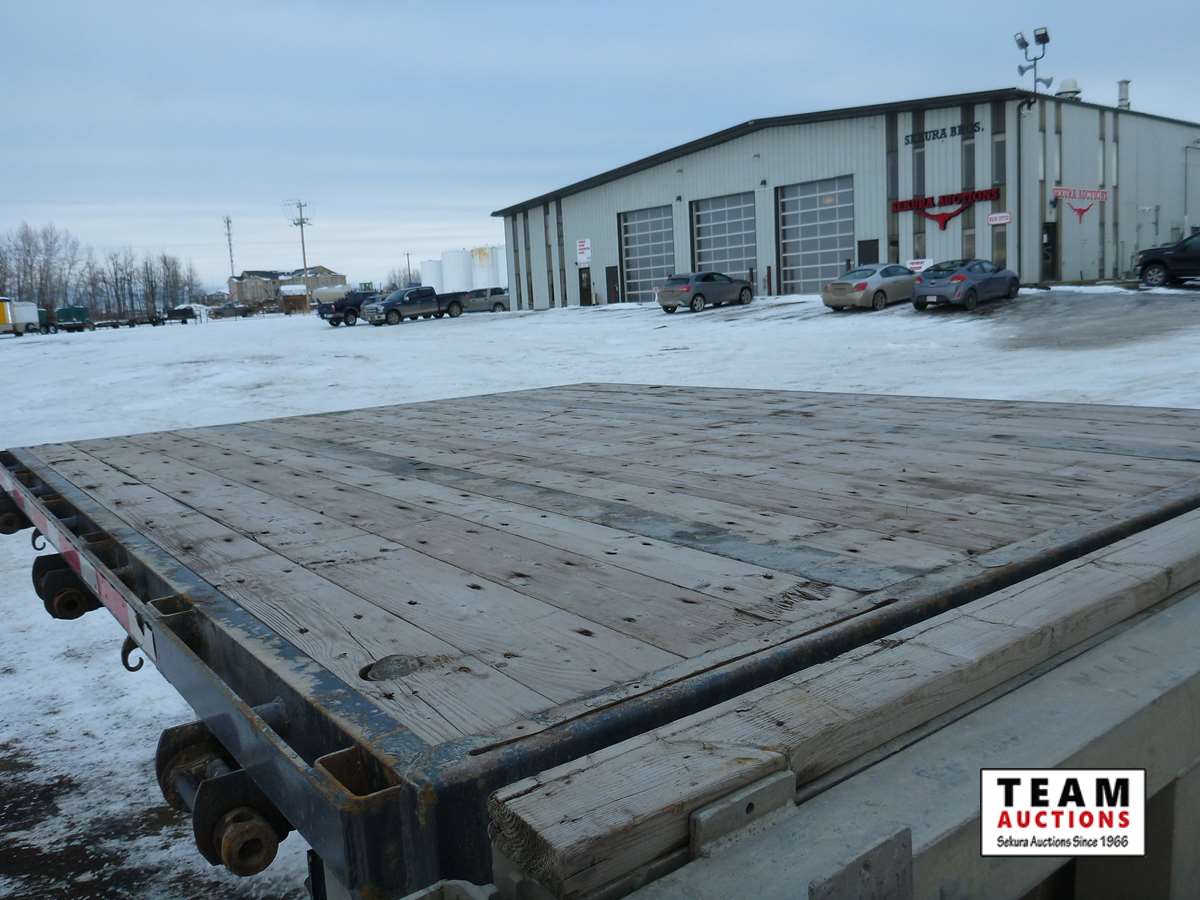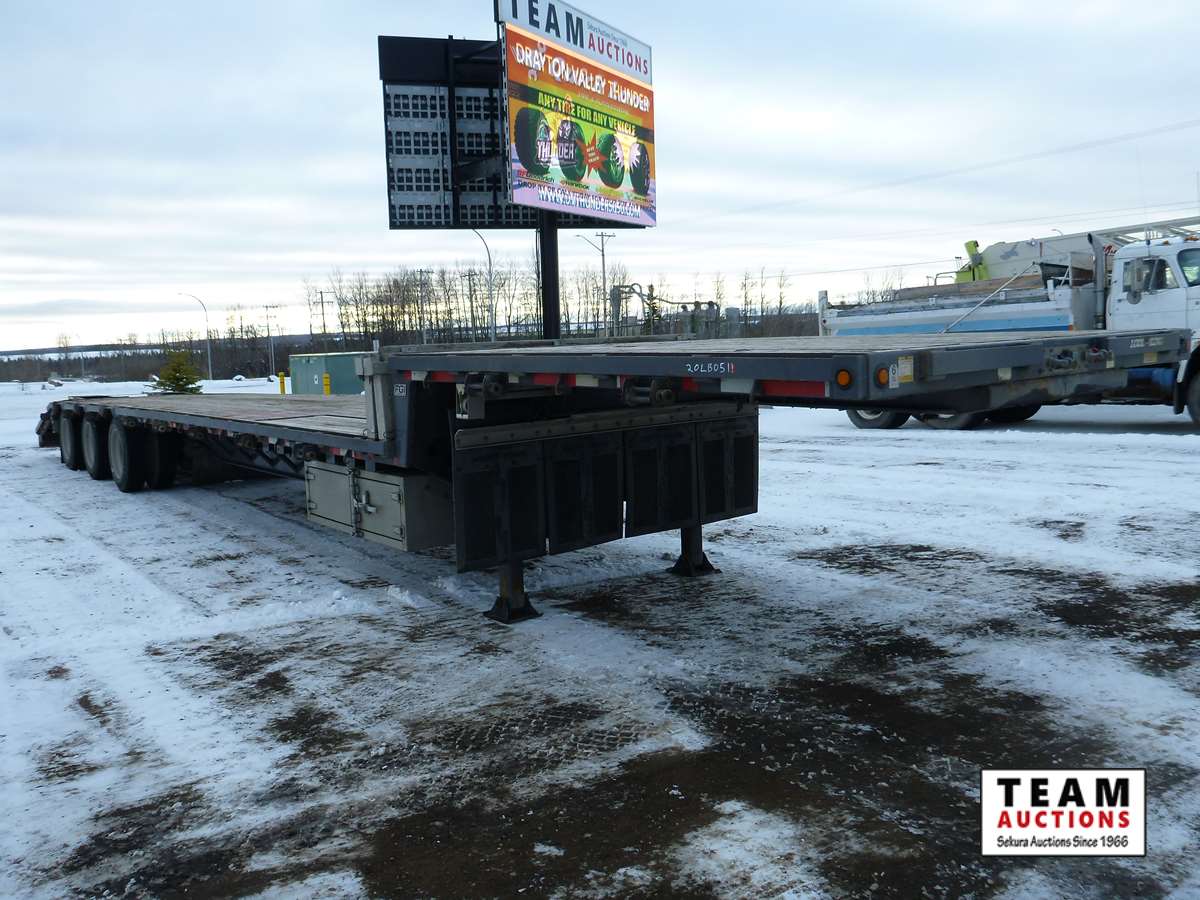 8 1/2' wide, Henderson air ride suspension, rear beaver tail with custom built grouser bars for traction, rear spring loaded ramps for ground loading, rear strobe and side aluminum pull out wide load lights, aluminum tool box, aluminum dunnage rack, floor pull out tie down chains, stake and rub rails, 3-Bar side mounted winch's, extra front mud flap package, (2) aluminum load bunks, rear axle load guage, 255/70R22.5 tires with aluminum rims and auto inflation system, Alberta CVIP just done, Alberta registered