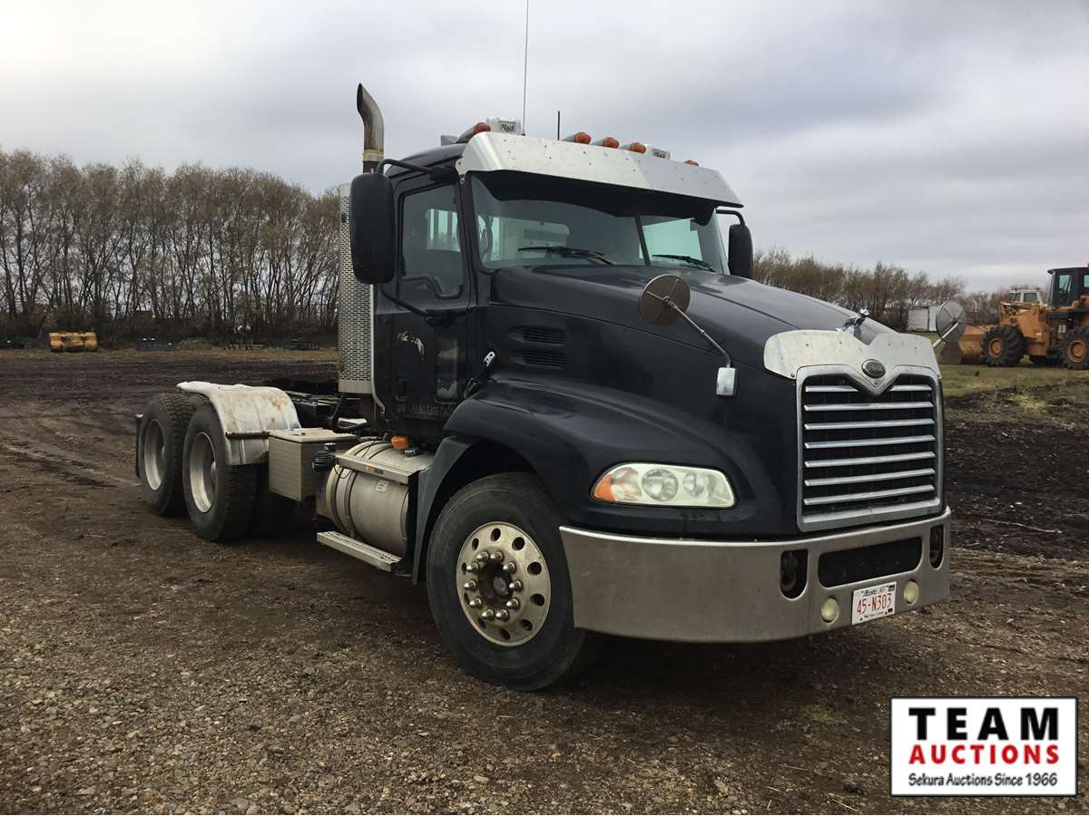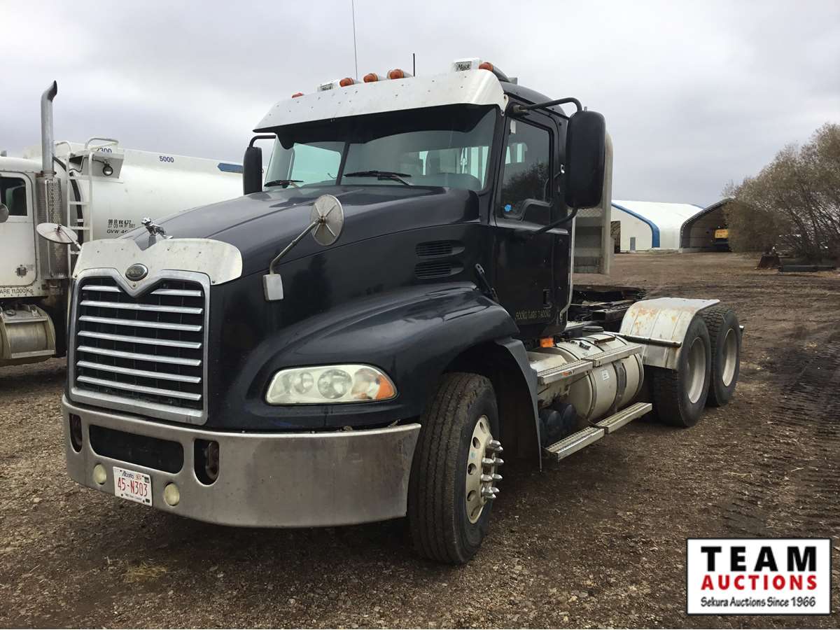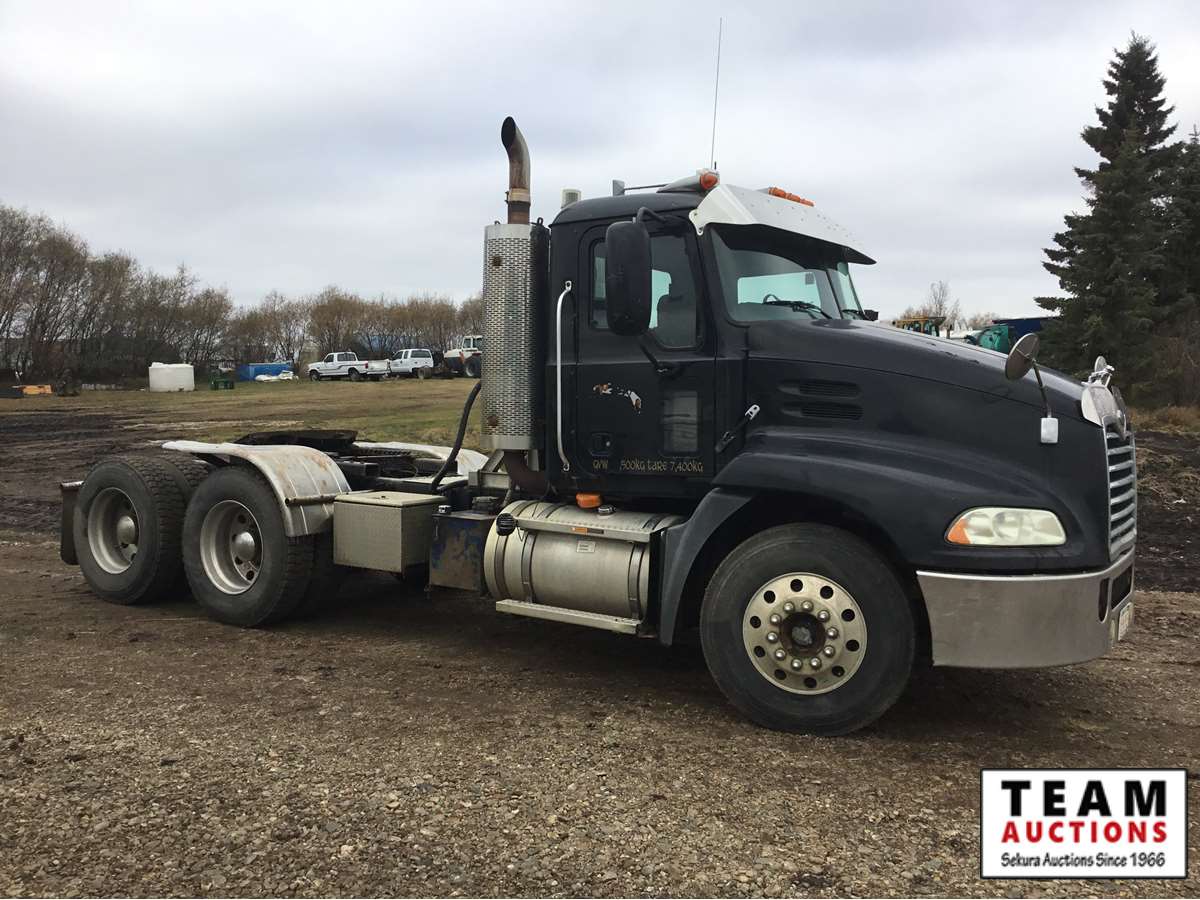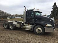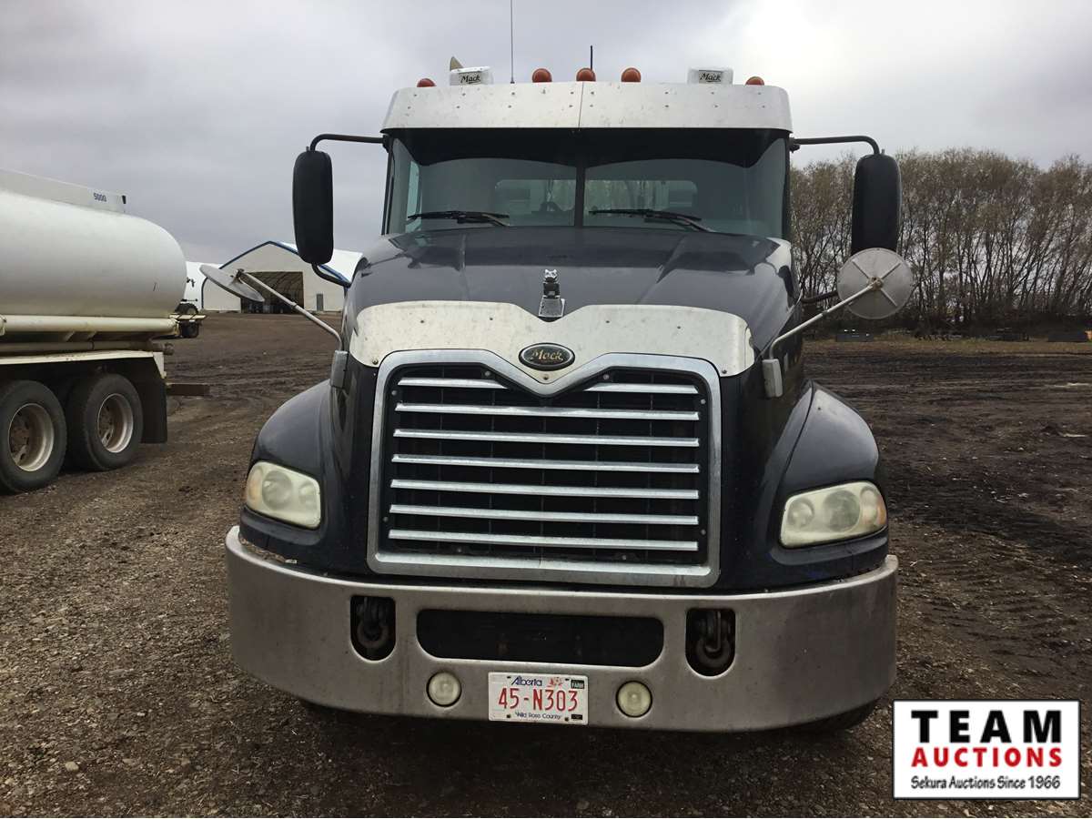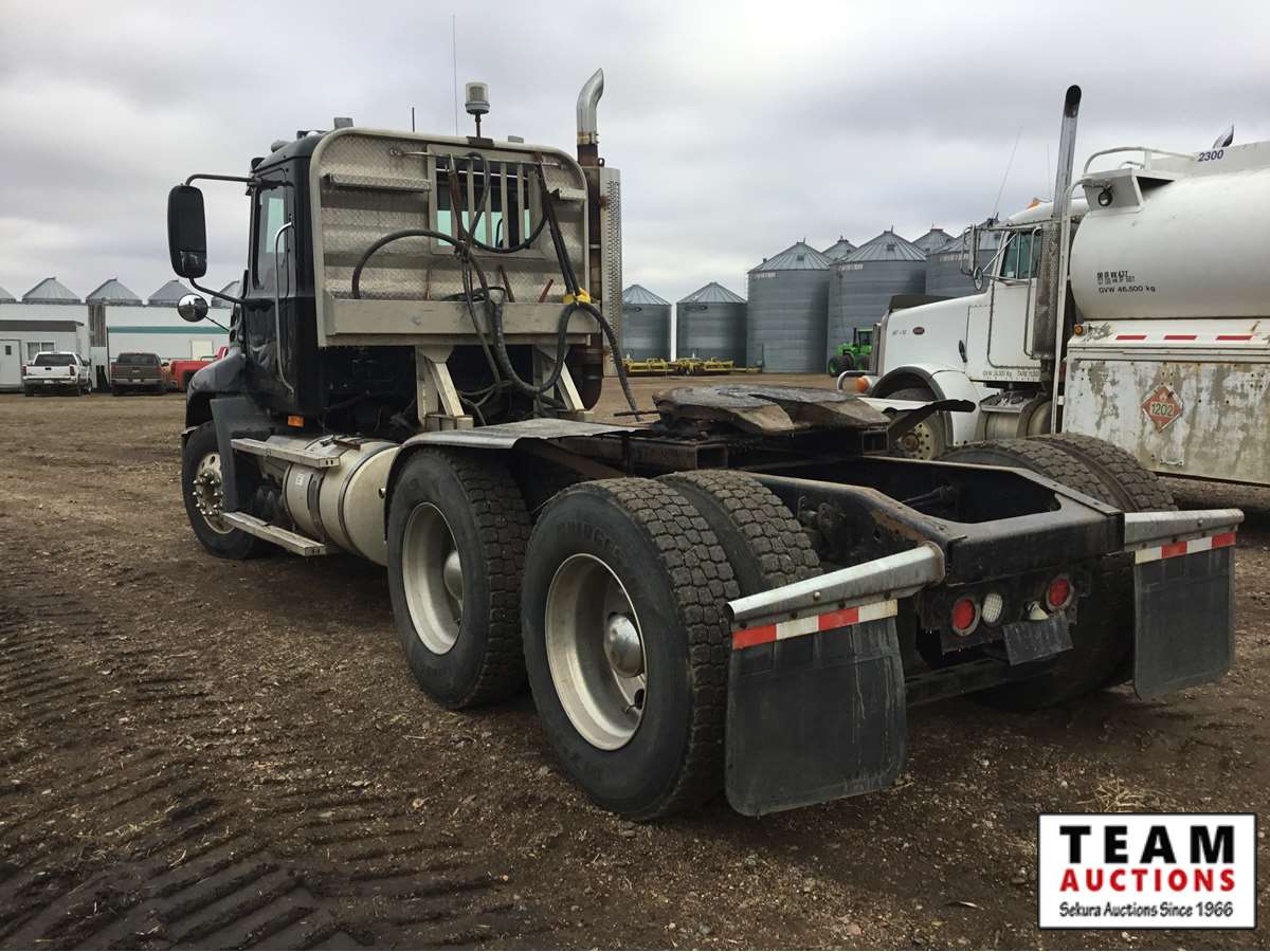Mack 13 litre engine 485/500 hp, with eng brake, 13 speed Fuller transmission, 12,600 frt axle, 40,000 rears with locker, air ride rear suspension, air ride cab, raised air sliding 5th wheel, head rack, tool box, wet kit, 11R24.5 rubber on aluminum rims, only 541,981 kms, 11,872 engine hours, Alberta registered, no current CVIP