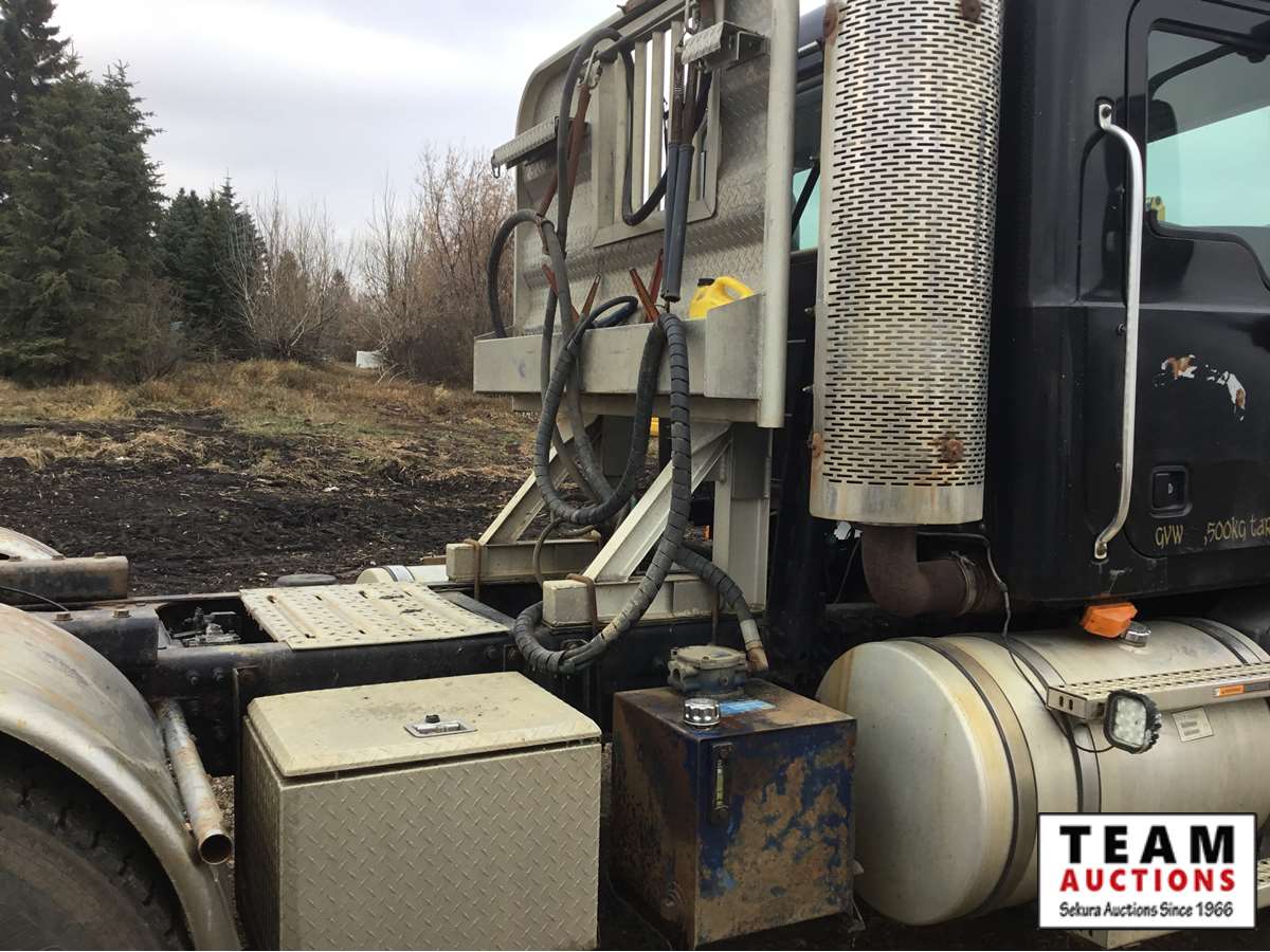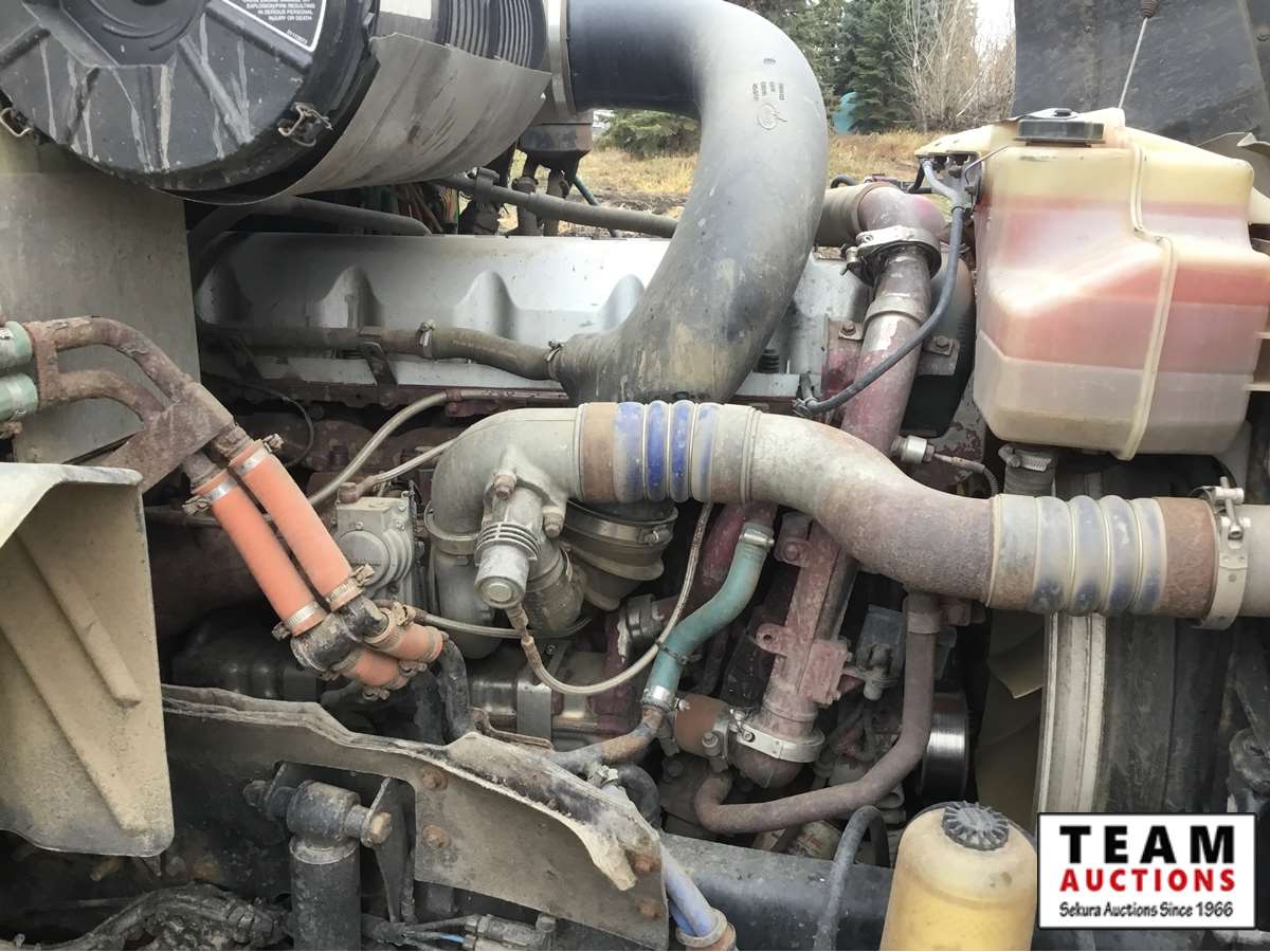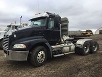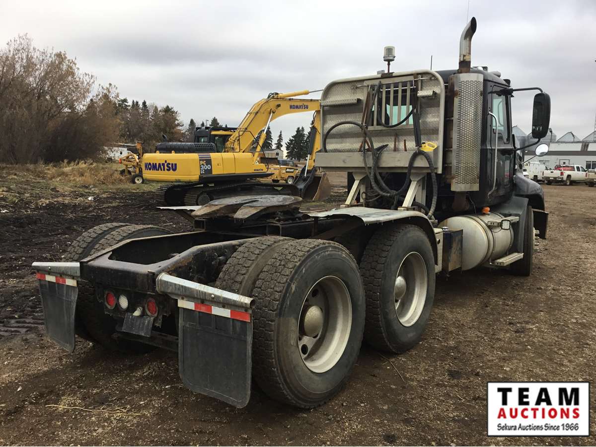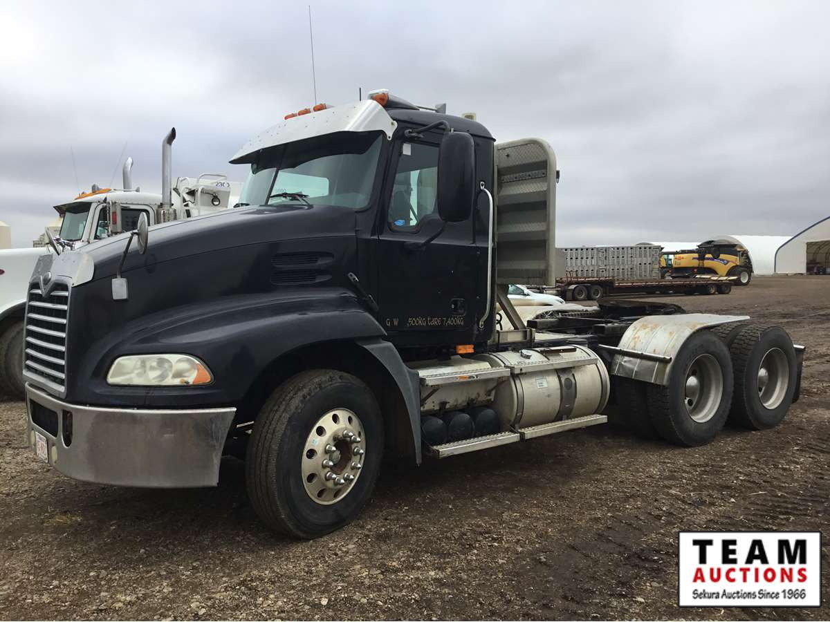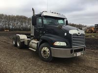 Mack 13 litre engine 485/500 hp, with eng brake, 13 speed Fuller transmission, 12,600 frt axle, 40,000 rears with locker, air ride rear suspension, air ride cab, raised air sliding 5th wheel, head rack, tool box, wet kit, 11R24.5 rubber on aluminum rims, only 541,981 kms, 11,872 engine hours, Alberta registered, no current CVIP