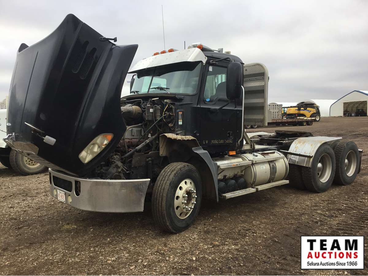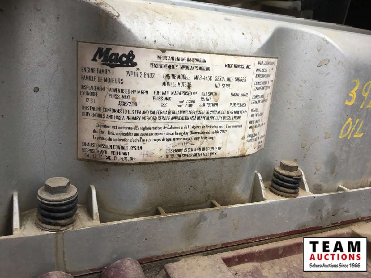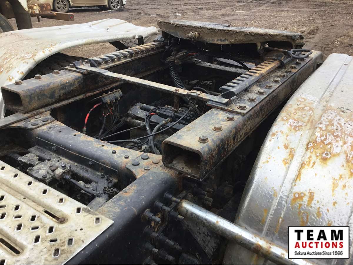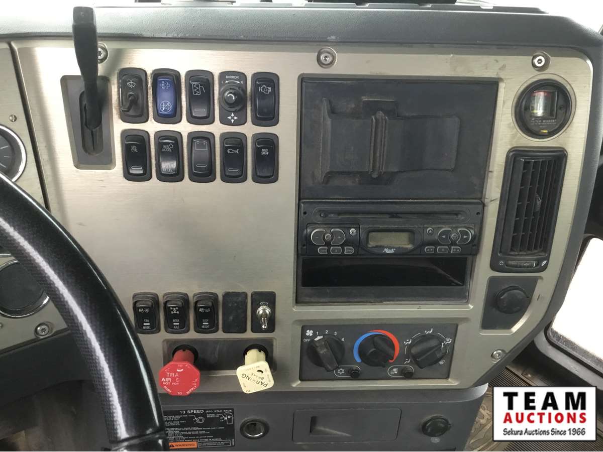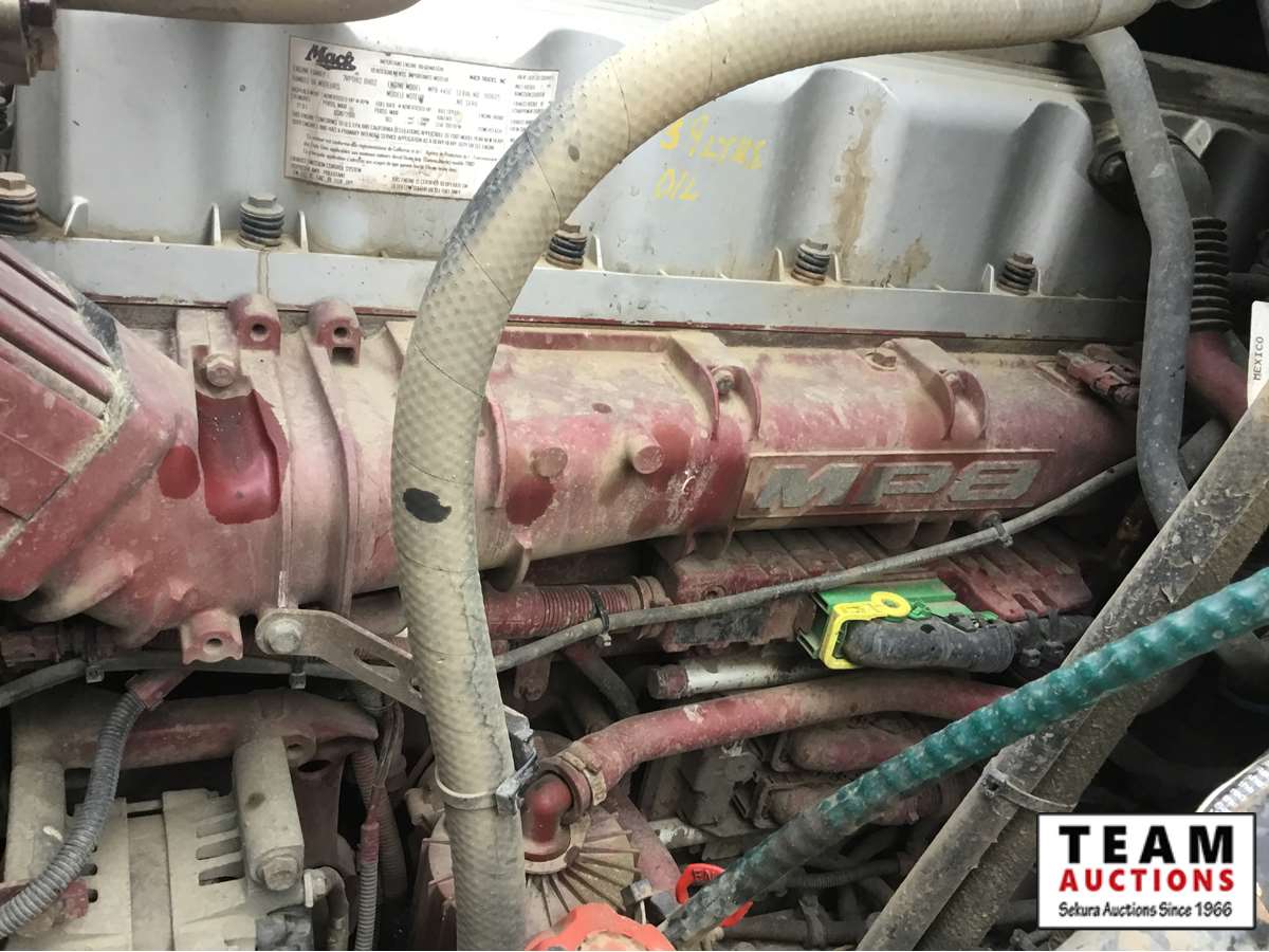 Mack 13 litre engine 485/500 hp, with eng brake, 13 speed Fuller transmission, 12,600 frt axle, 40,000 rears with locker, air ride rear suspension, air ride cab, raised air sliding 5th wheel, head rack, tool box, wet kit, 11R24.5 rubber on aluminum rims, only 541,981 kms, 11,872 engine hours, Alberta registered, no current CVIP