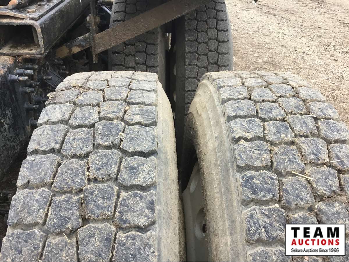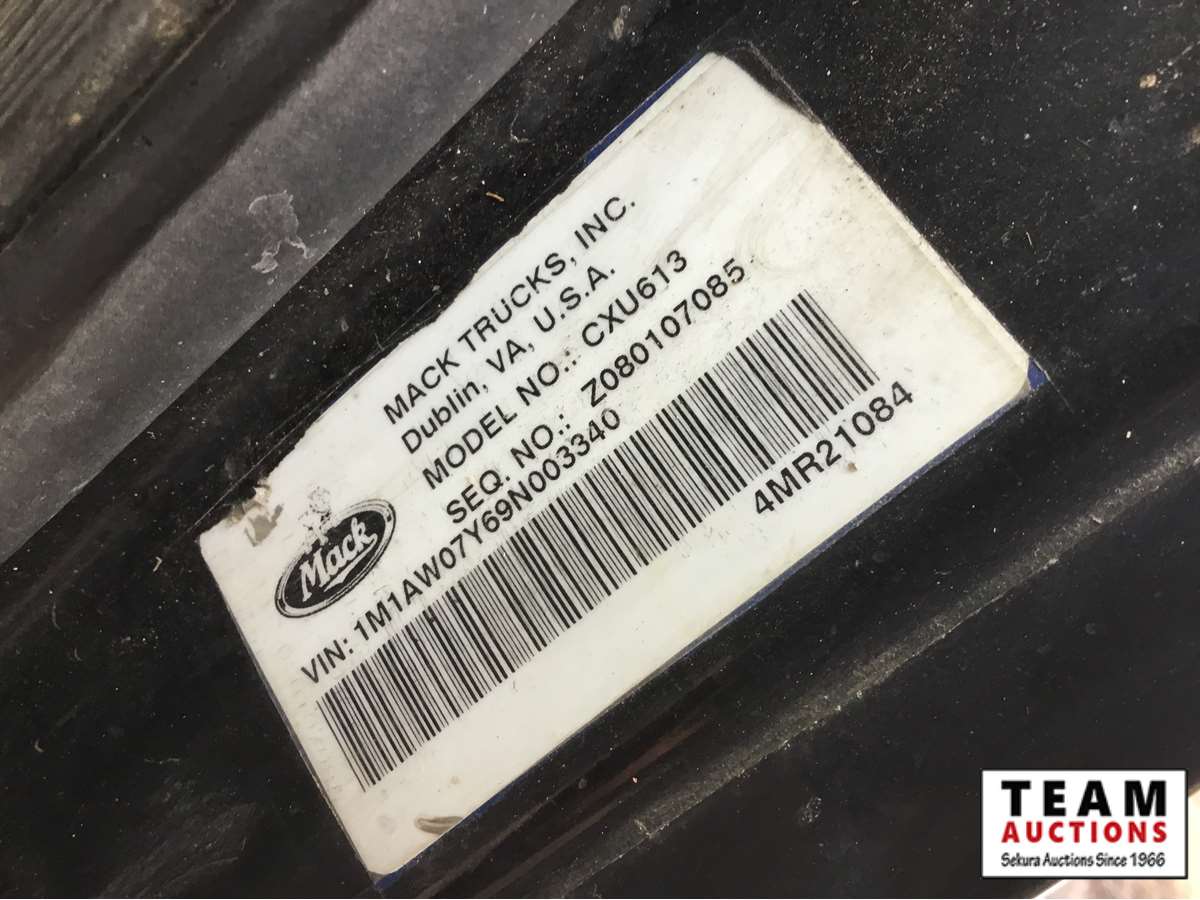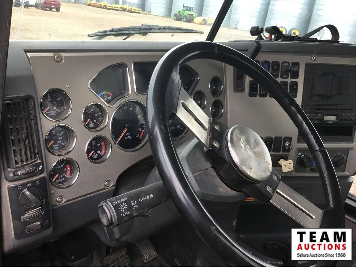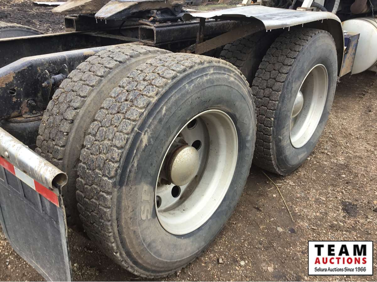 Mack 13 litre engine 485/500 hp, with eng brake, 13 speed Fuller transmission, 12,600 frt axle, 40,000 rears with locker, air ride rear suspension, air ride cab, raised air sliding 5th wheel, head rack, tool box, wet kit, 11R24.5 rubber on aluminum rims, only 541,981 kms, 11,872 engine hours, Alberta registered, no current CVIP