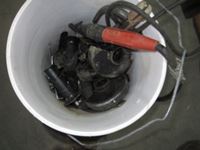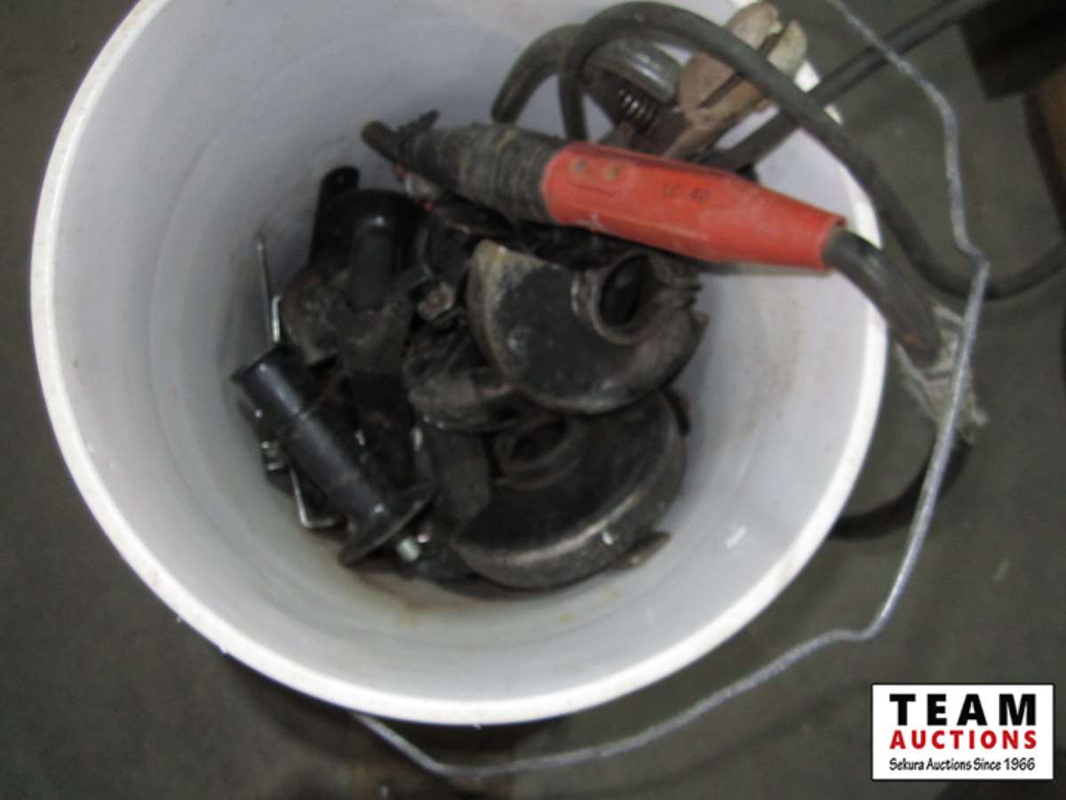71' & 86' welding cables, (2) welding wire spools, bucket of grinder parts
