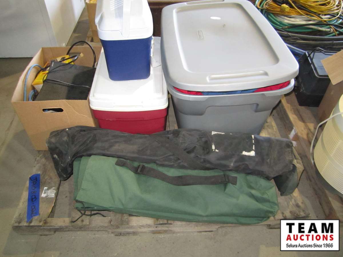 coolers, folding outdoor chairs, large tote of coveralls,