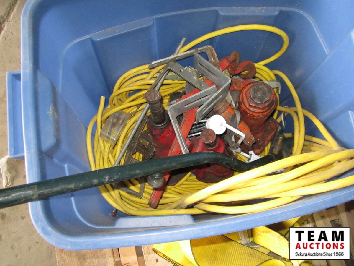 tote w/extension cord, hydraulic jacks, ratchet strap, tarp