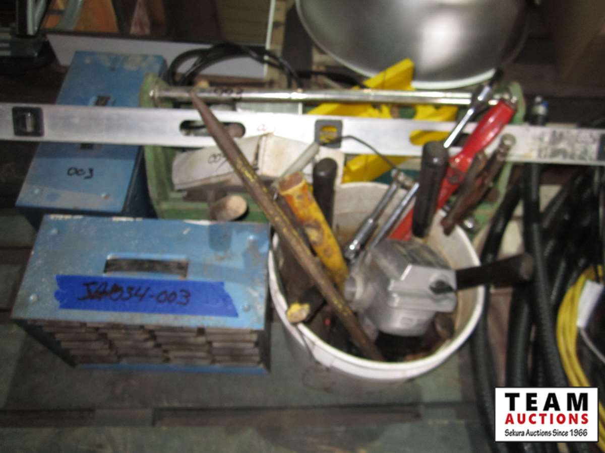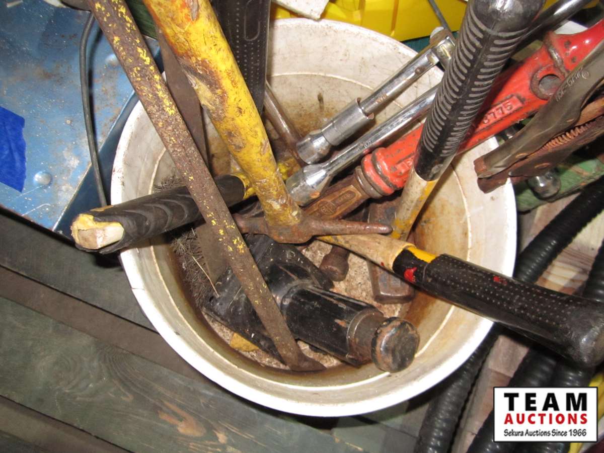 hammers, hardware storage box, mitre box, misc tools