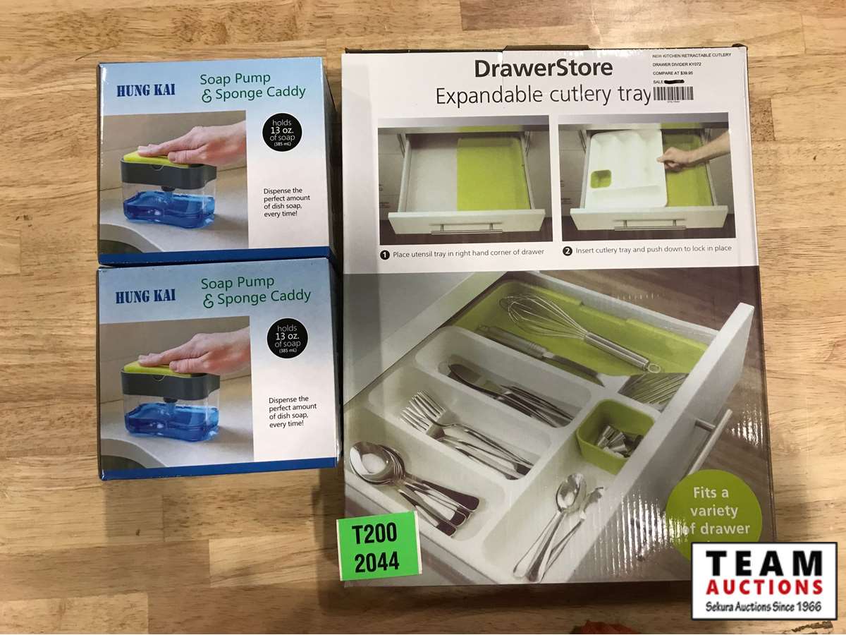 117 2X Hung Kai Soap Pump and Sponge Caddy & Drawerstore Expandable Cutlery Tray