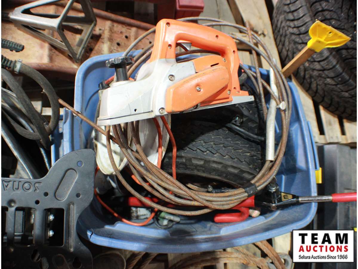 galvanized buckets, tiger torch, steel cable, pintle hitch, manual fuel pump, sprayer, planer, 4.80-8 rubber tires, misc. items
