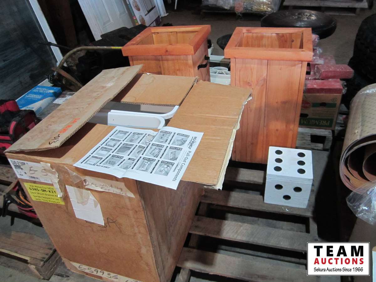 50 qt. double waste container drawer mount kit, decorative dice box, (2) planters, 2' high, inside measurements, 9.25" x 11" x 9.75"D