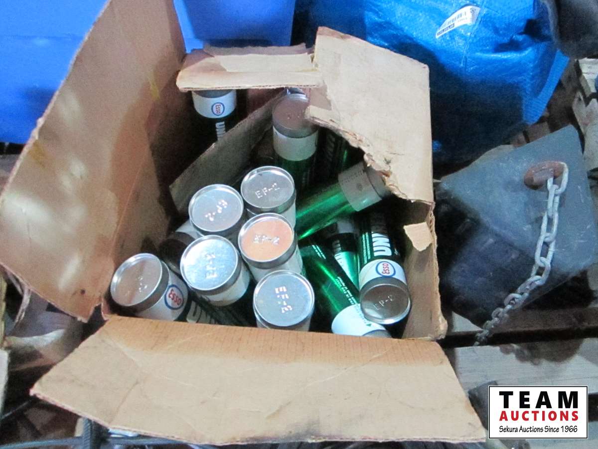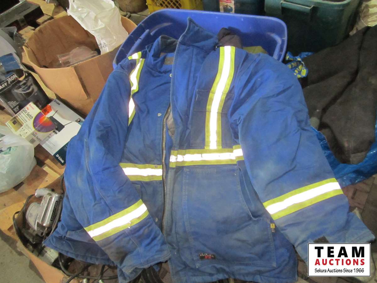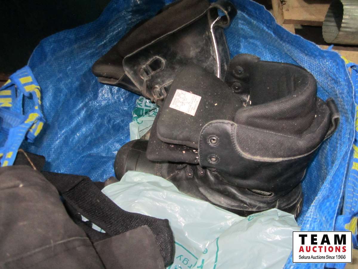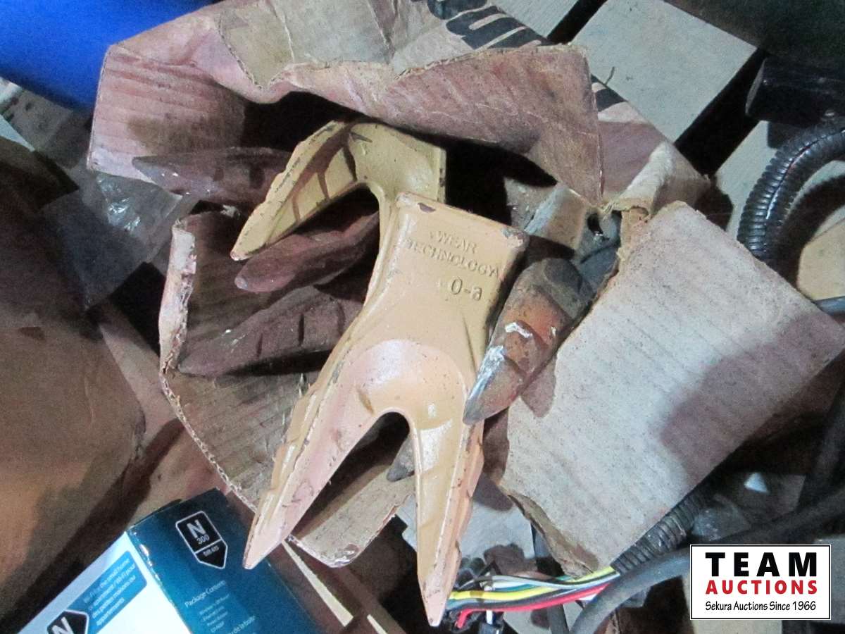 frost teeth for excavator bucket, rubber wheel chocks, box of Unirex grease, bag w/ map books misc., 2XL work jacket, tote w/clothing items, boots, misc.
